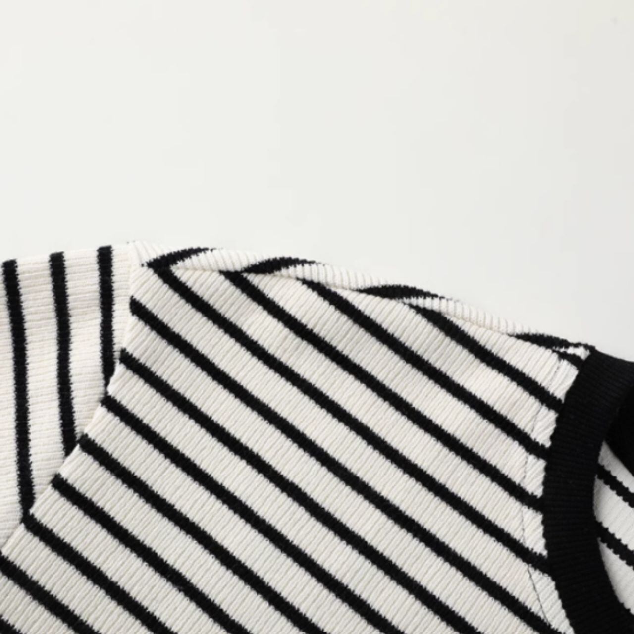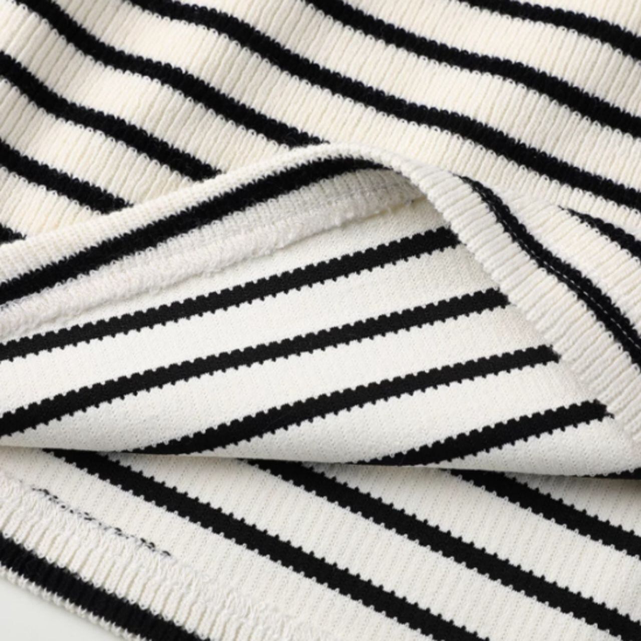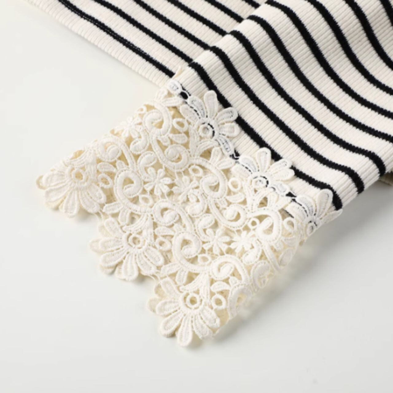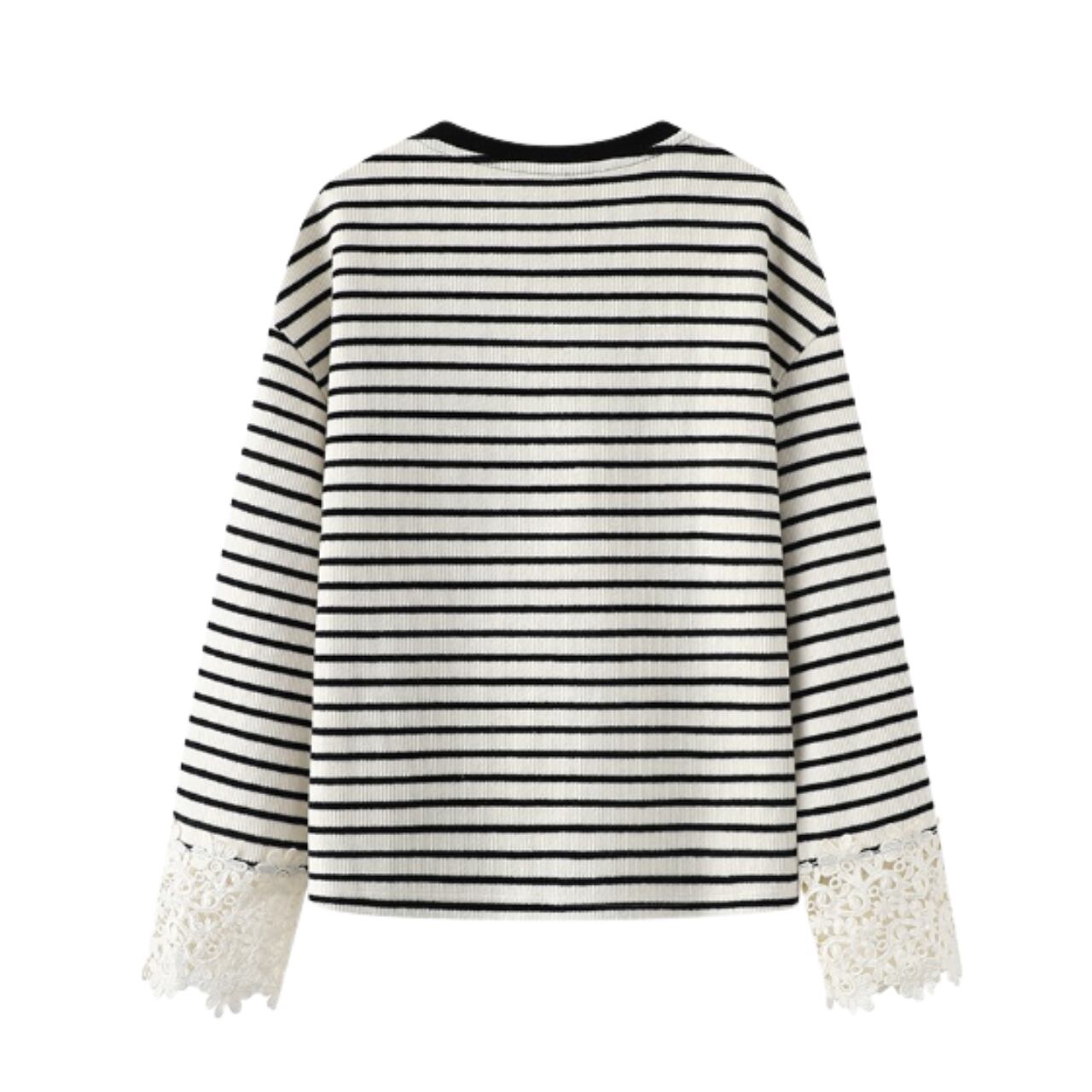 ボーダー柄と繊細なレースの組み合わせが魅力的なトップス。