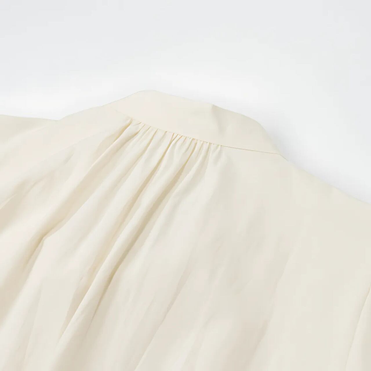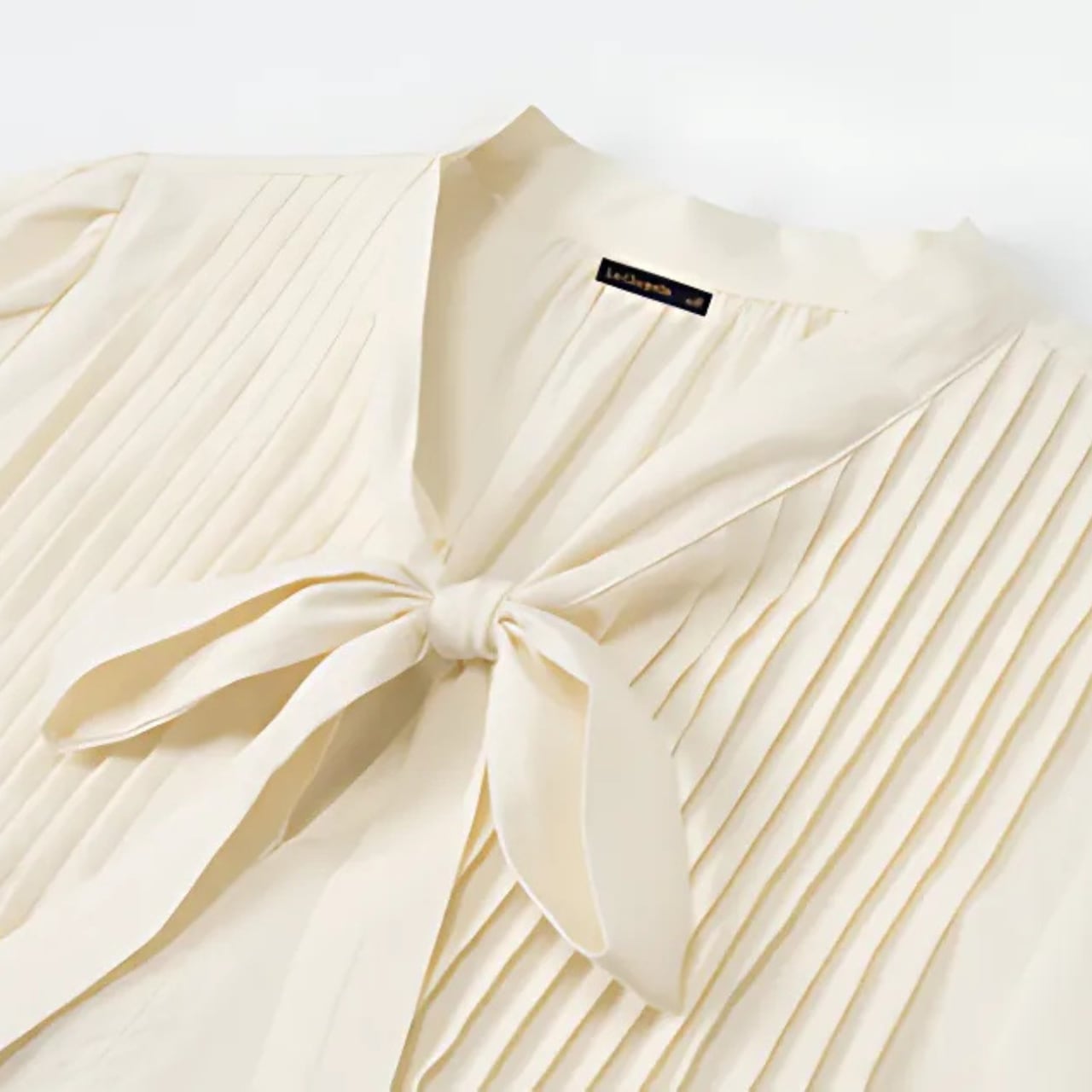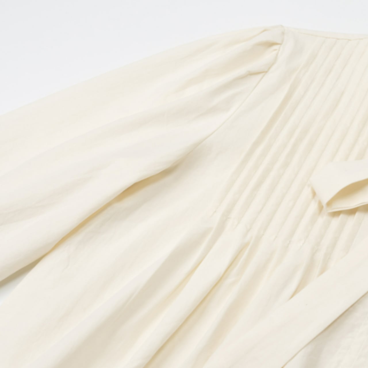 繊細なプリーツが胸元に美しい陰影を添え、女性らしい雰囲気を演出します。