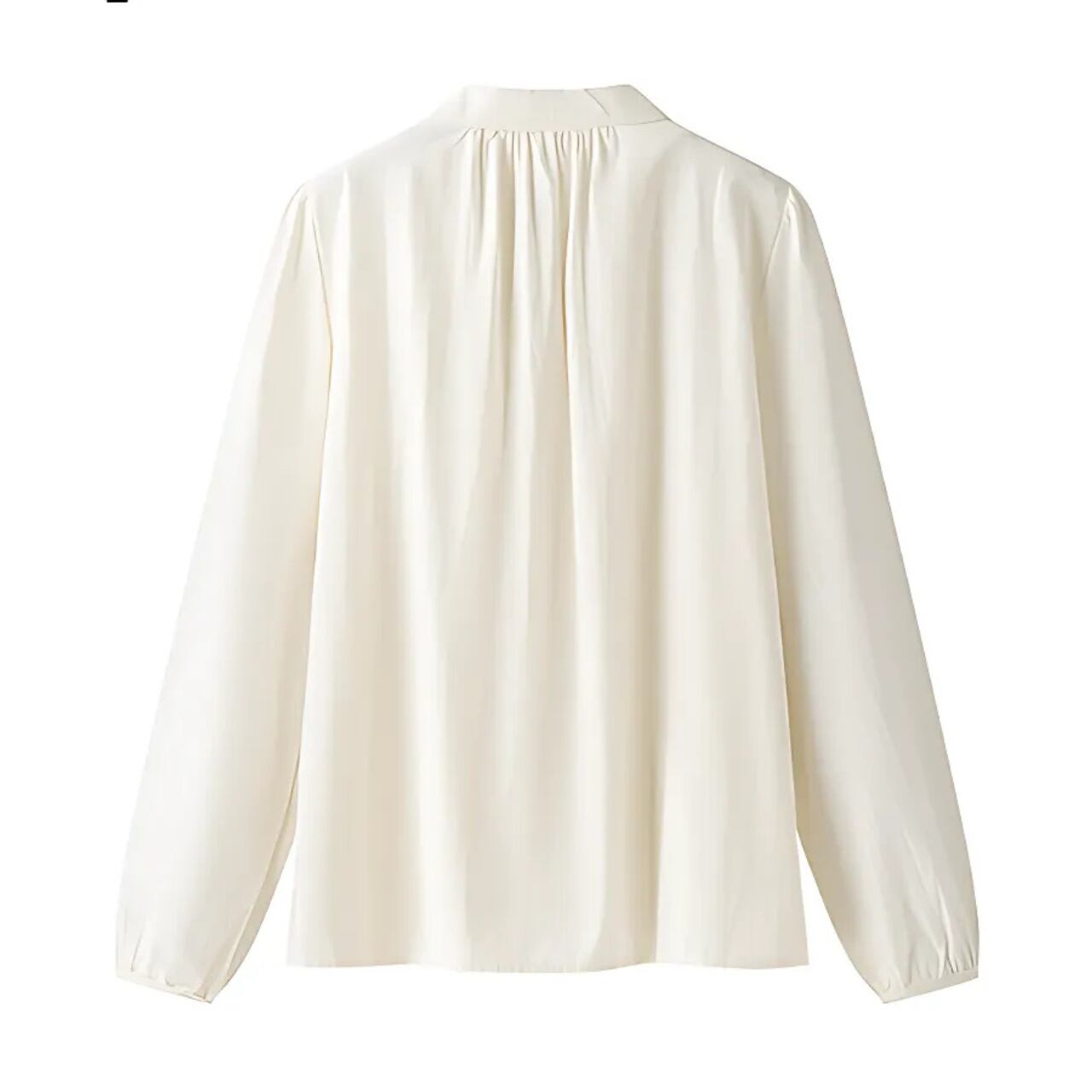 スタンドカラーとボウタイが上品なロングスリーブブラウス。