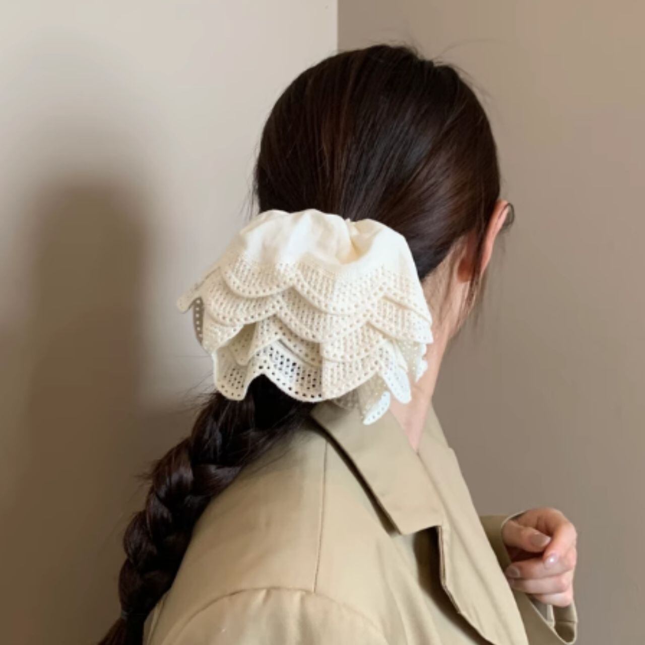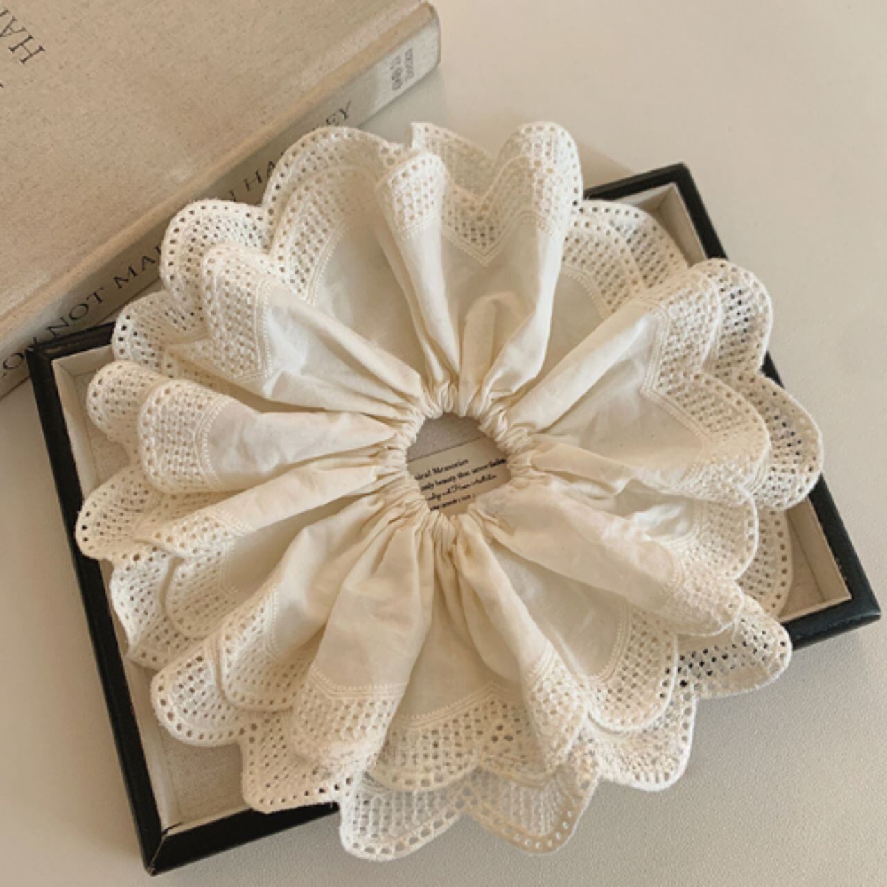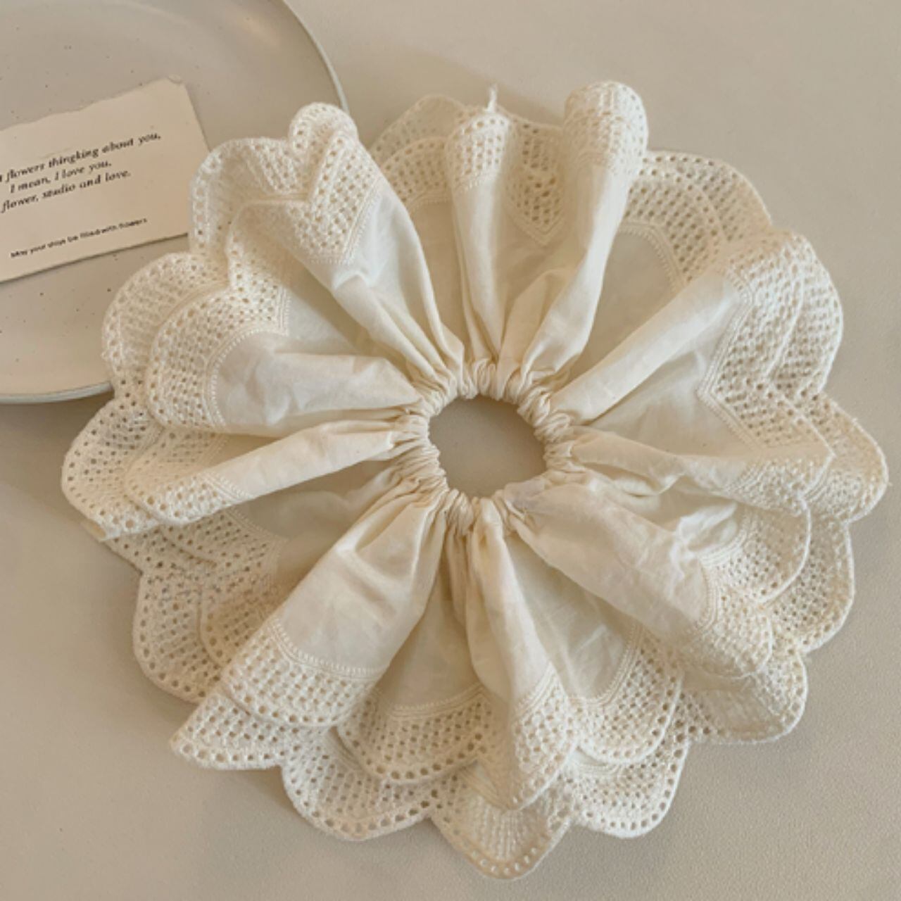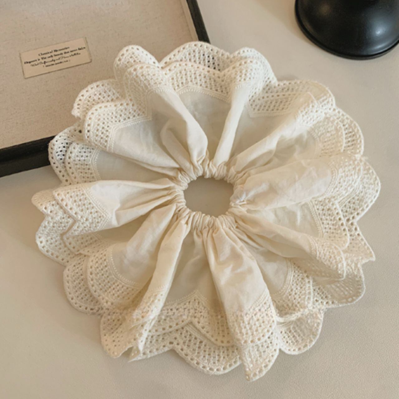 繊細なスカラップレースがふんわりと広がる、まるで花びらのようなシュシュ。