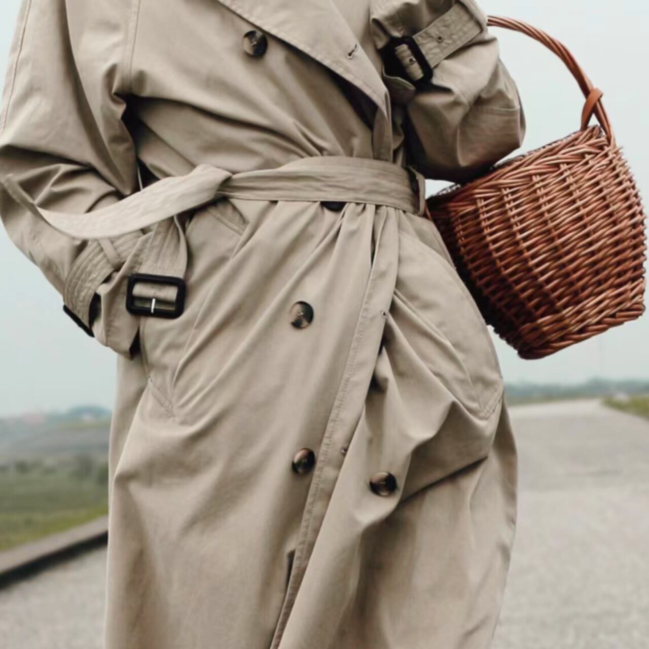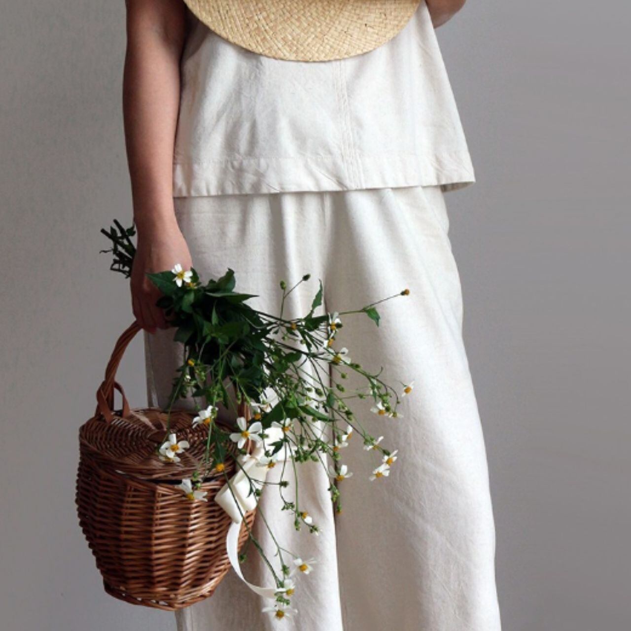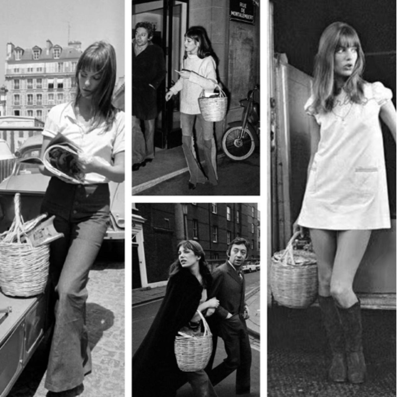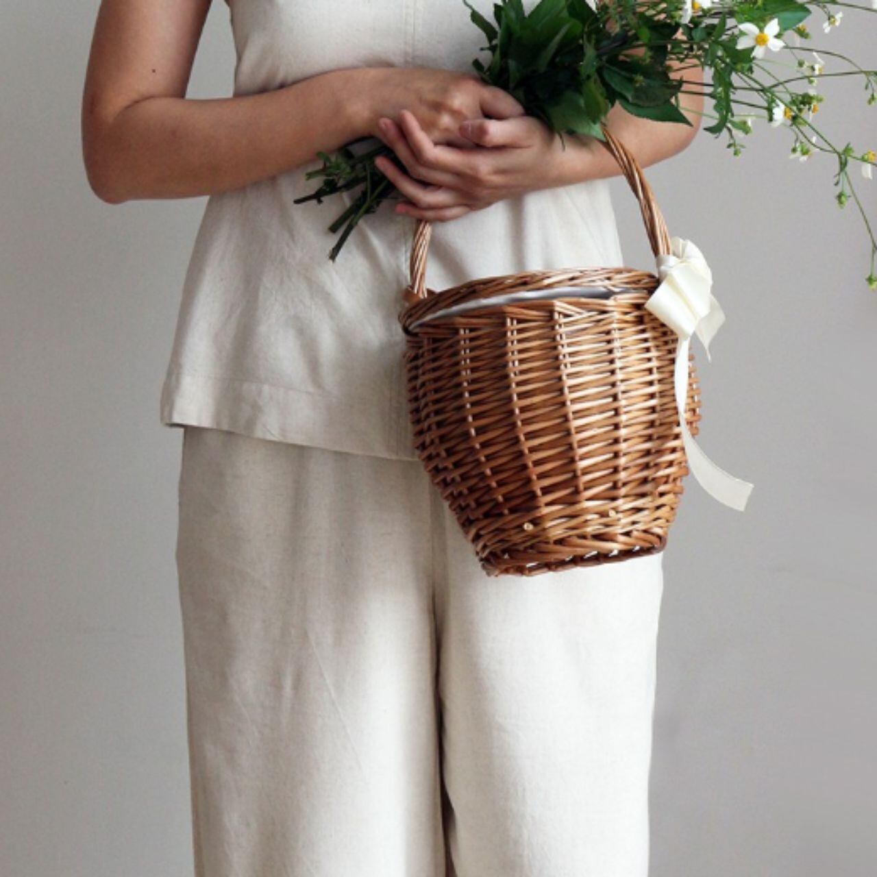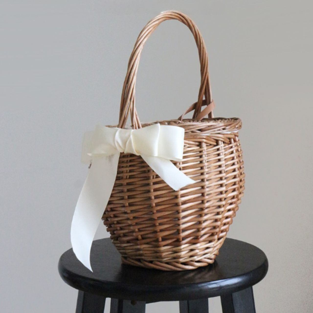 ジェーン・バーキンの自由で気取らない美しさにインスピレーションを受けた、リボン付きのラタンバスケット。