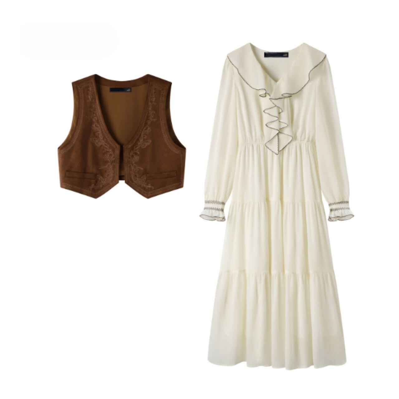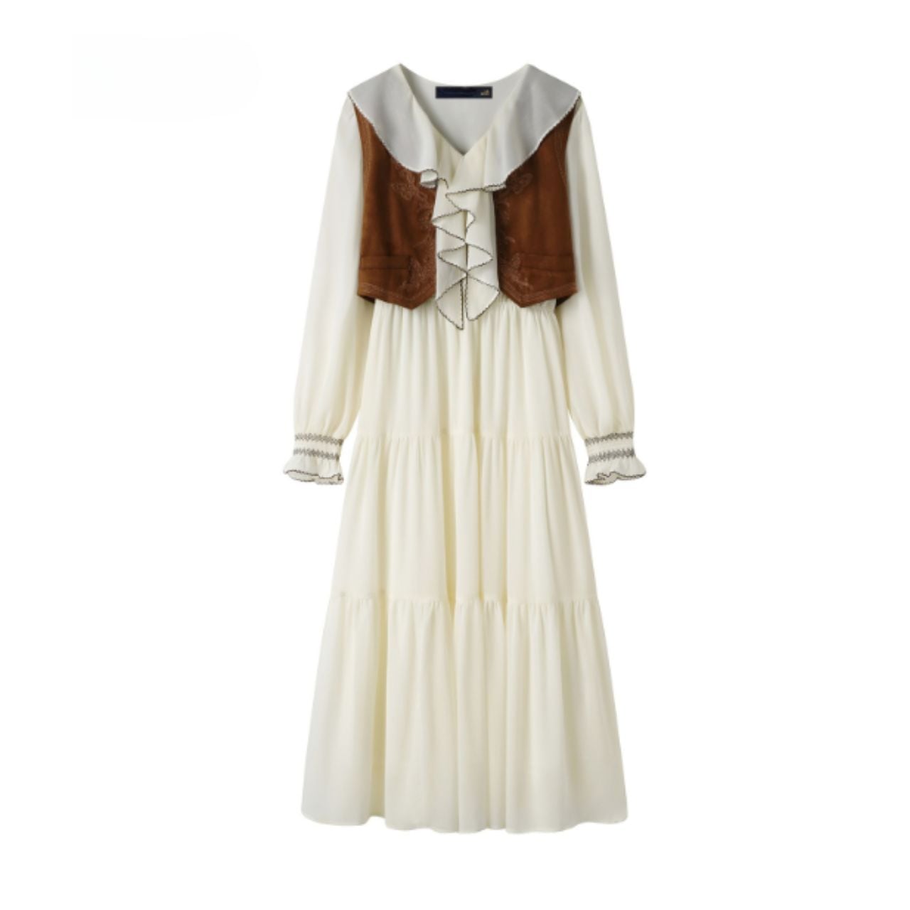 ヴィンテージライクなベストと、柔らかなティアードワンピースが一体となったセットアップ。