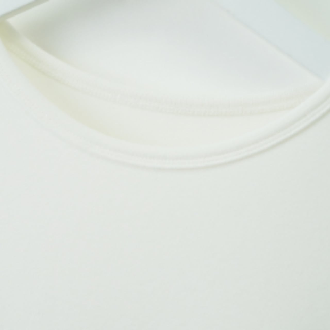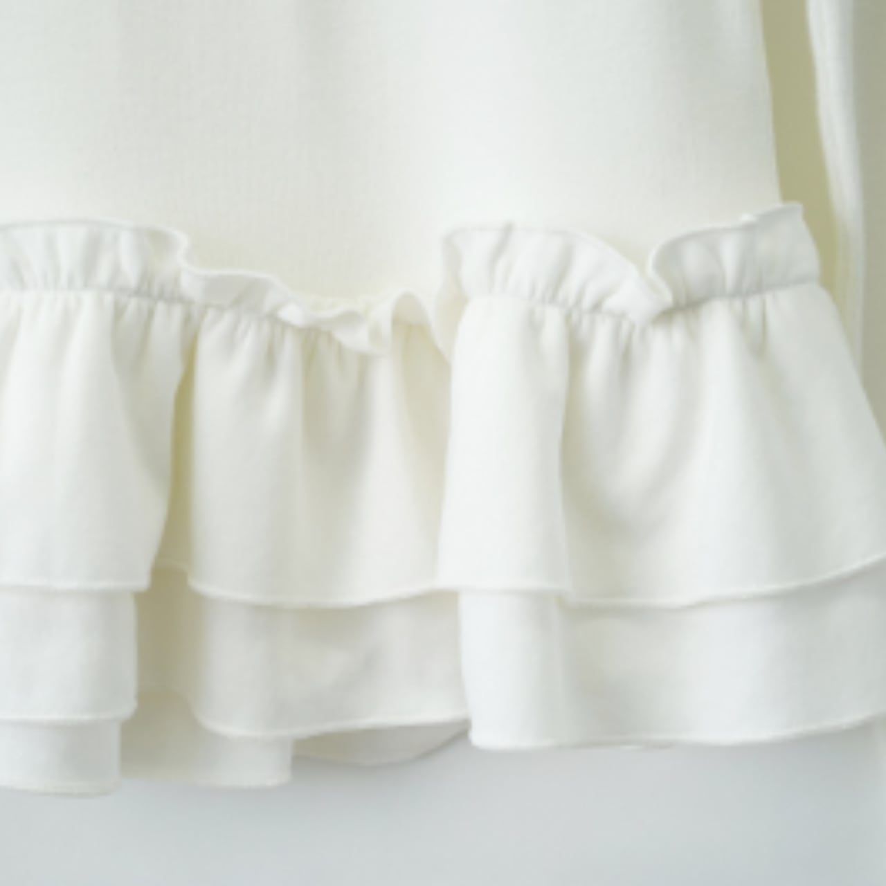 柔らかなロンT素材に、ふわりと重なるフリルを添えたホワイトトップス。