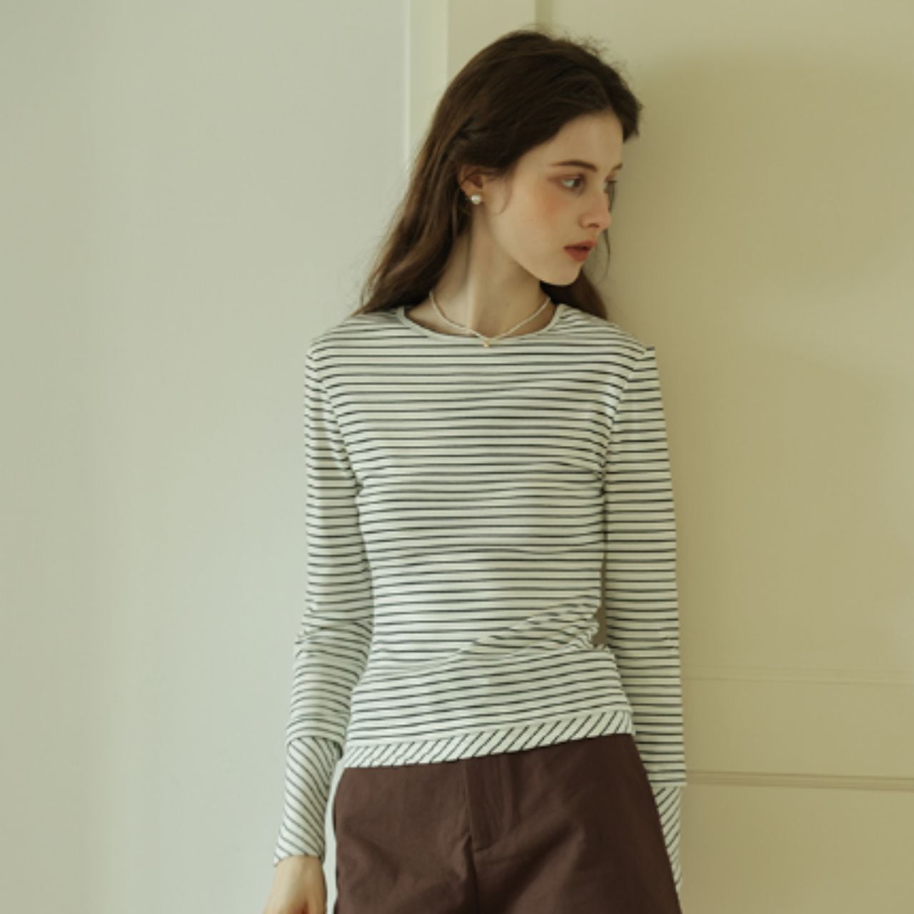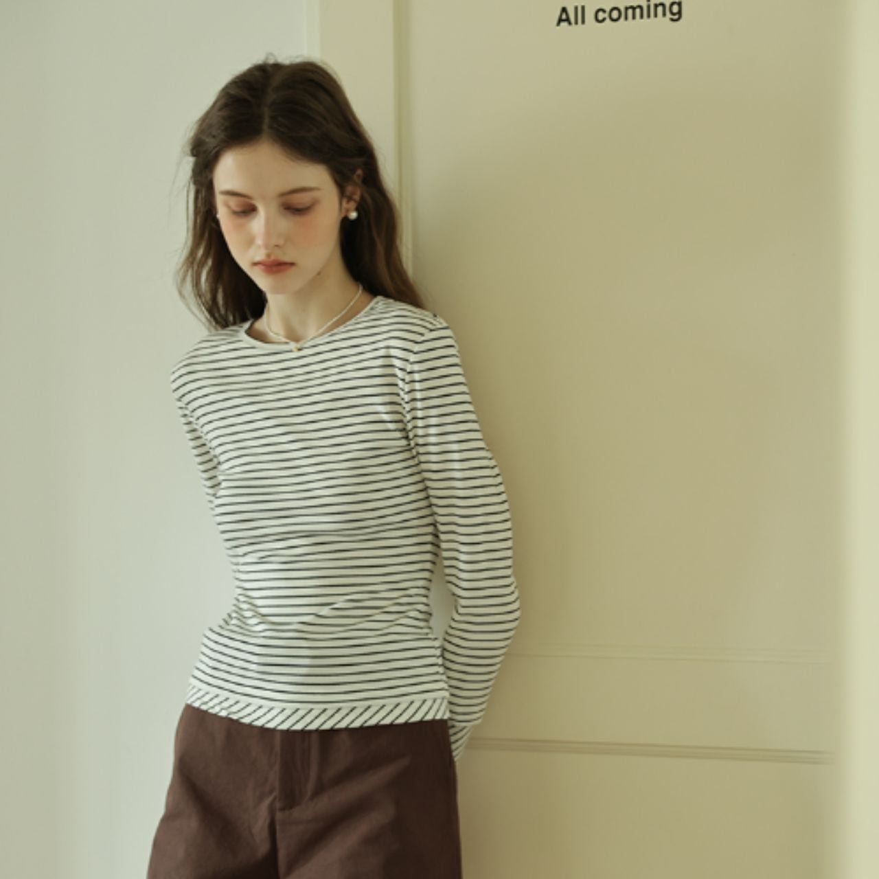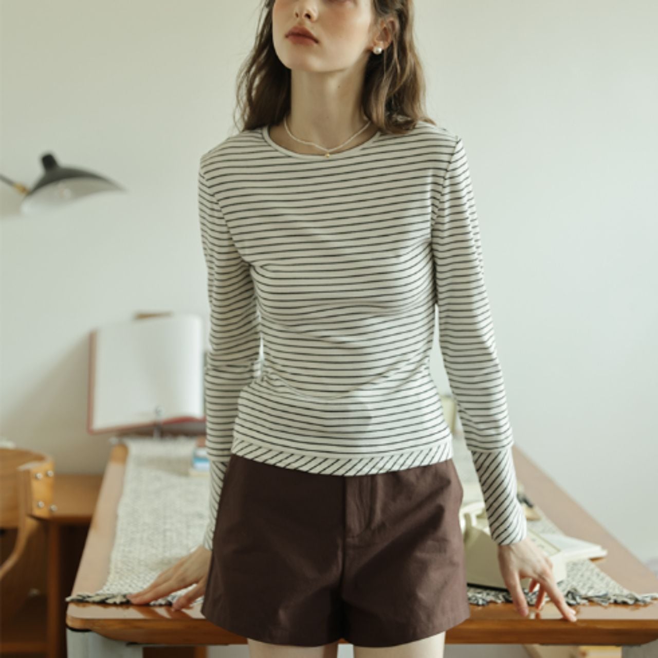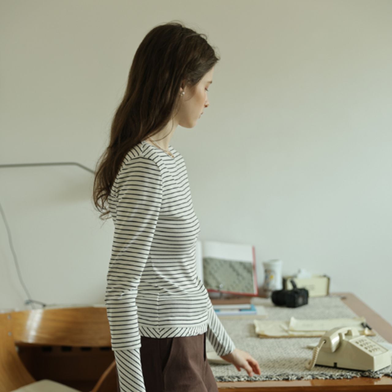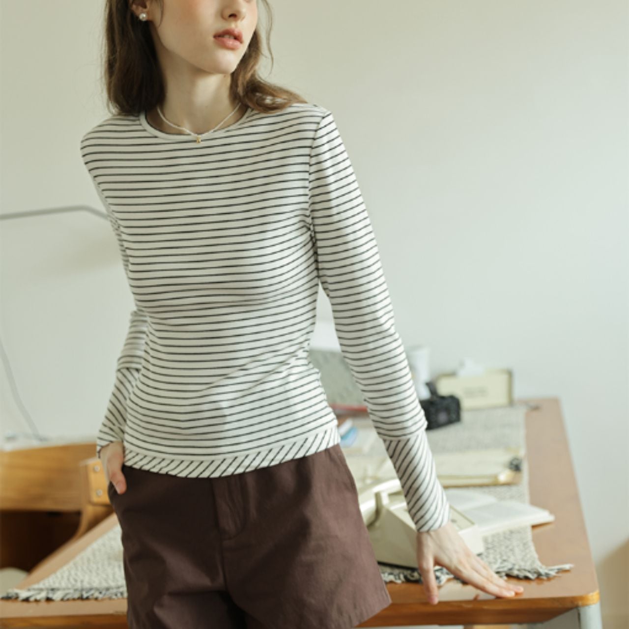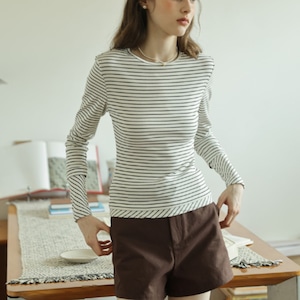 控えめなのに、なぜか目を惹く。そんな一本筋の通った雰囲気をまとう、白地に繊細なボーダーのカットソー。