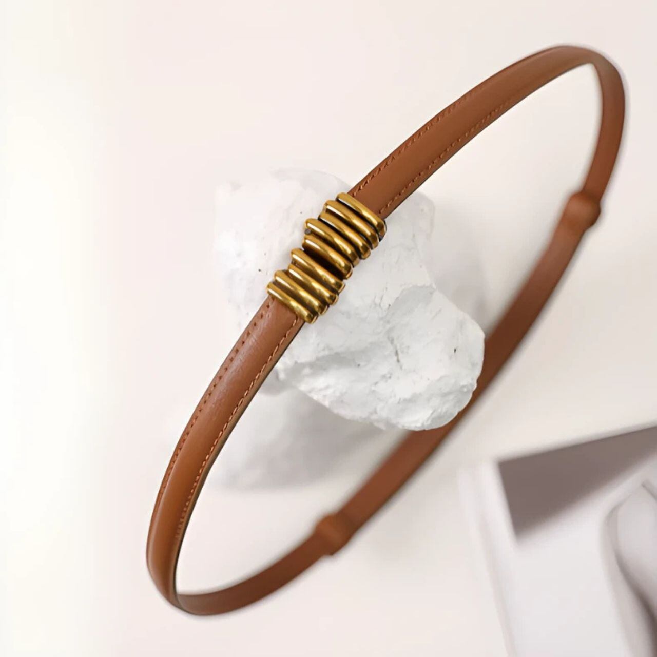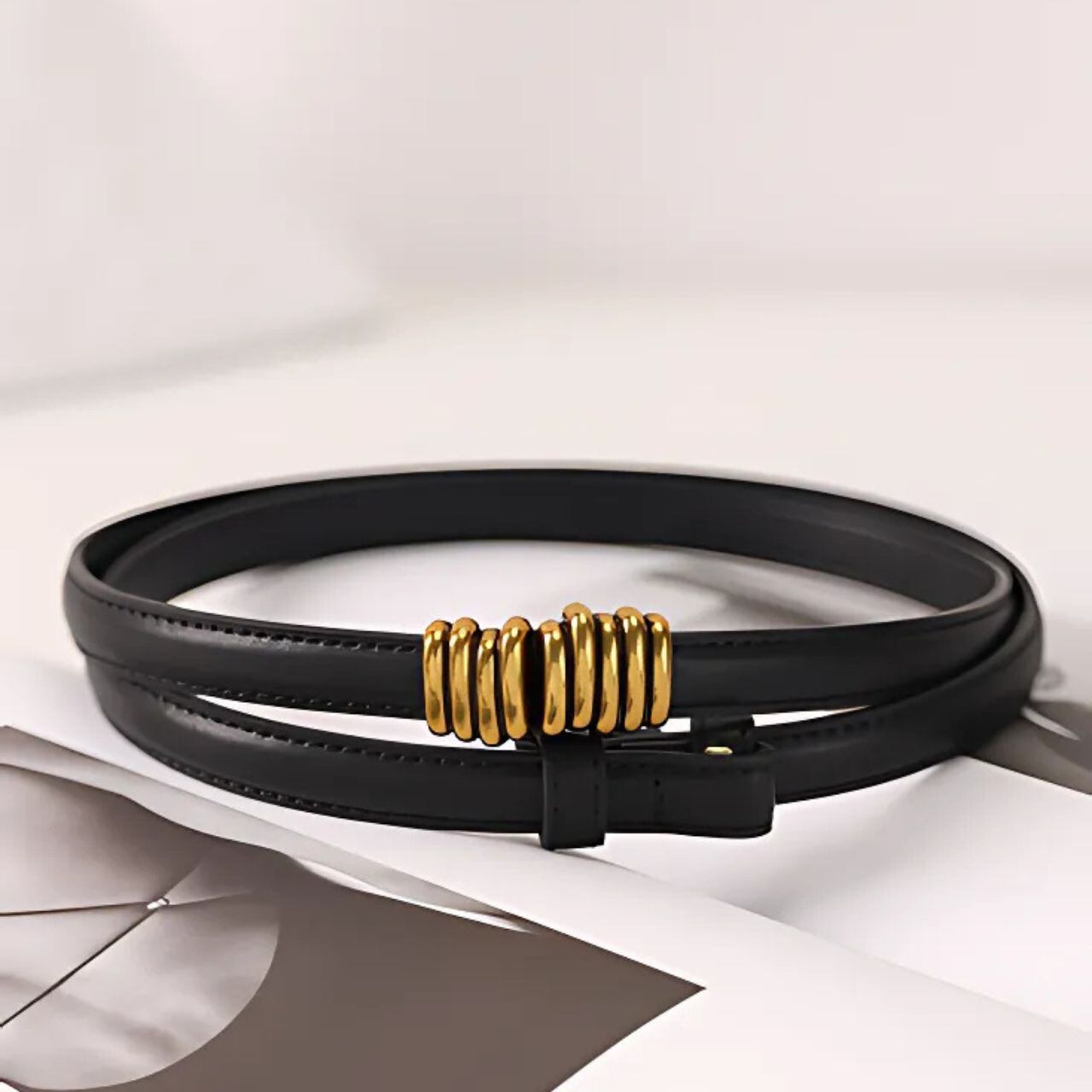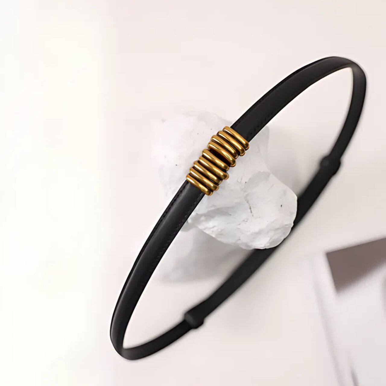 ゴールドリングが静かに主張する、細身のスリムベルト。
