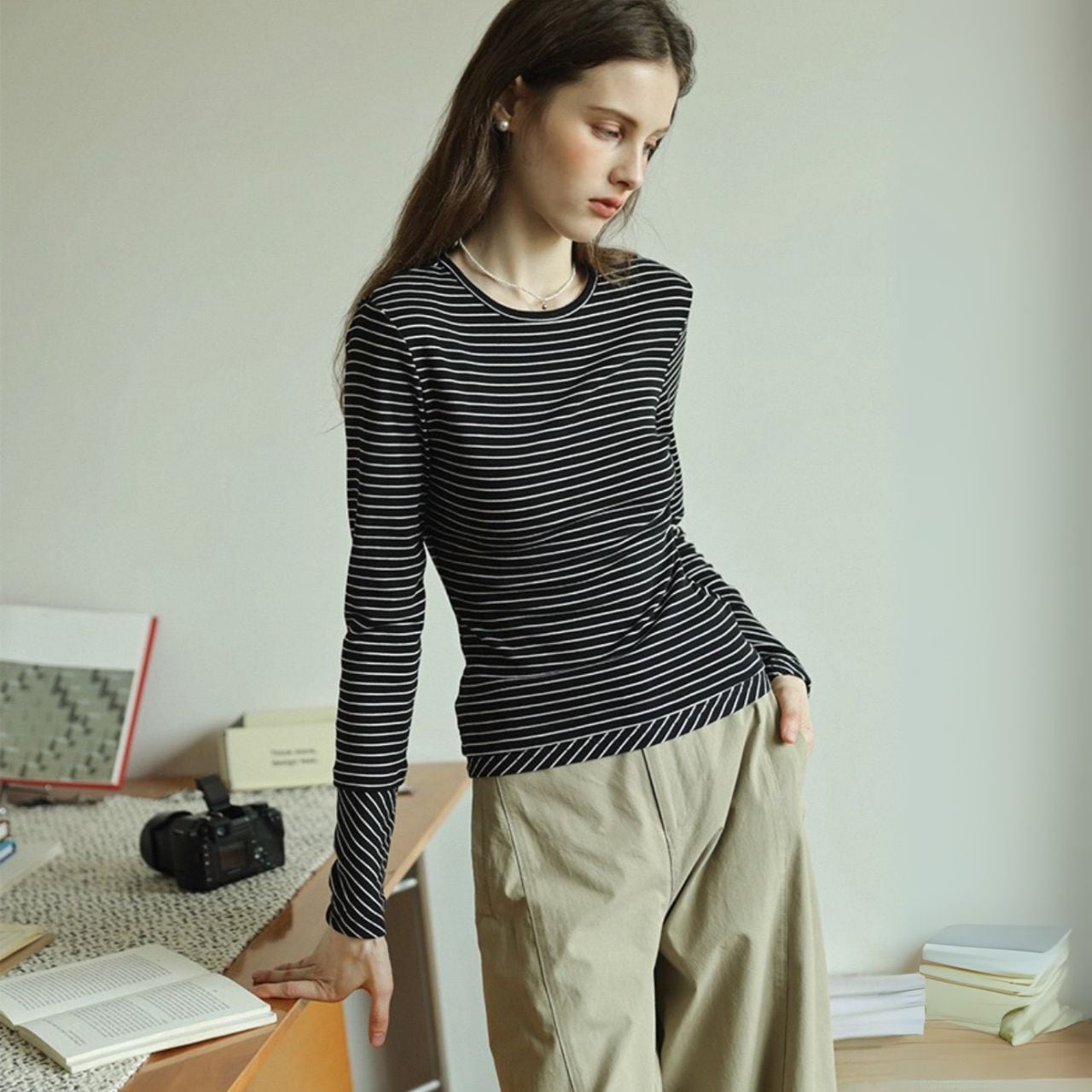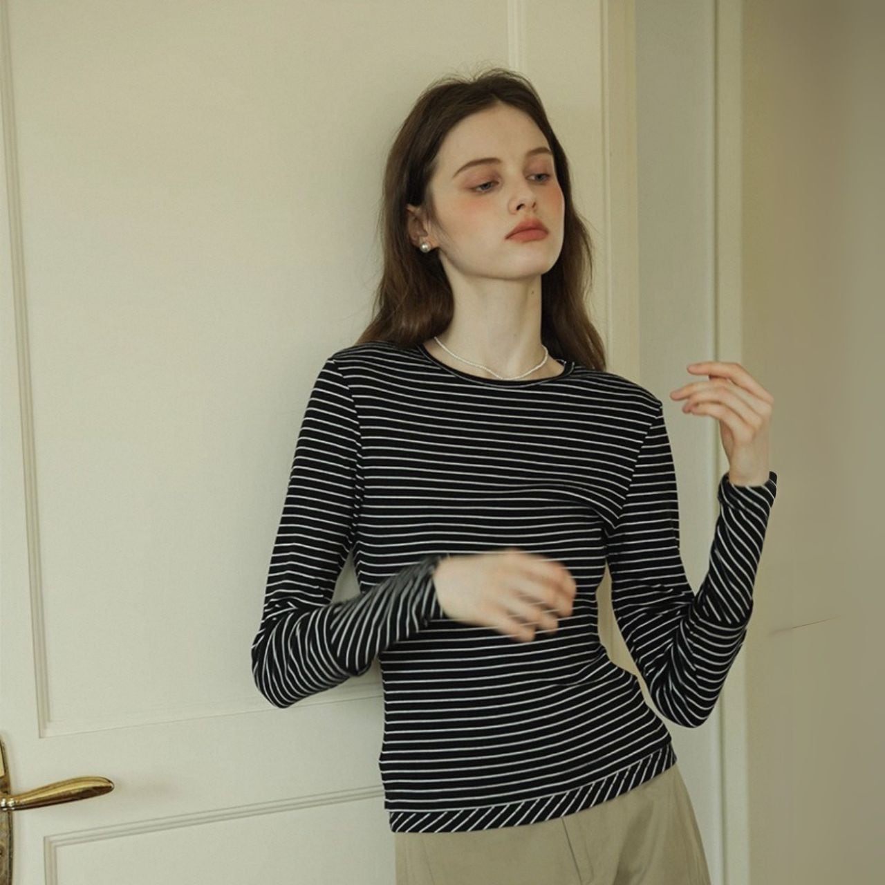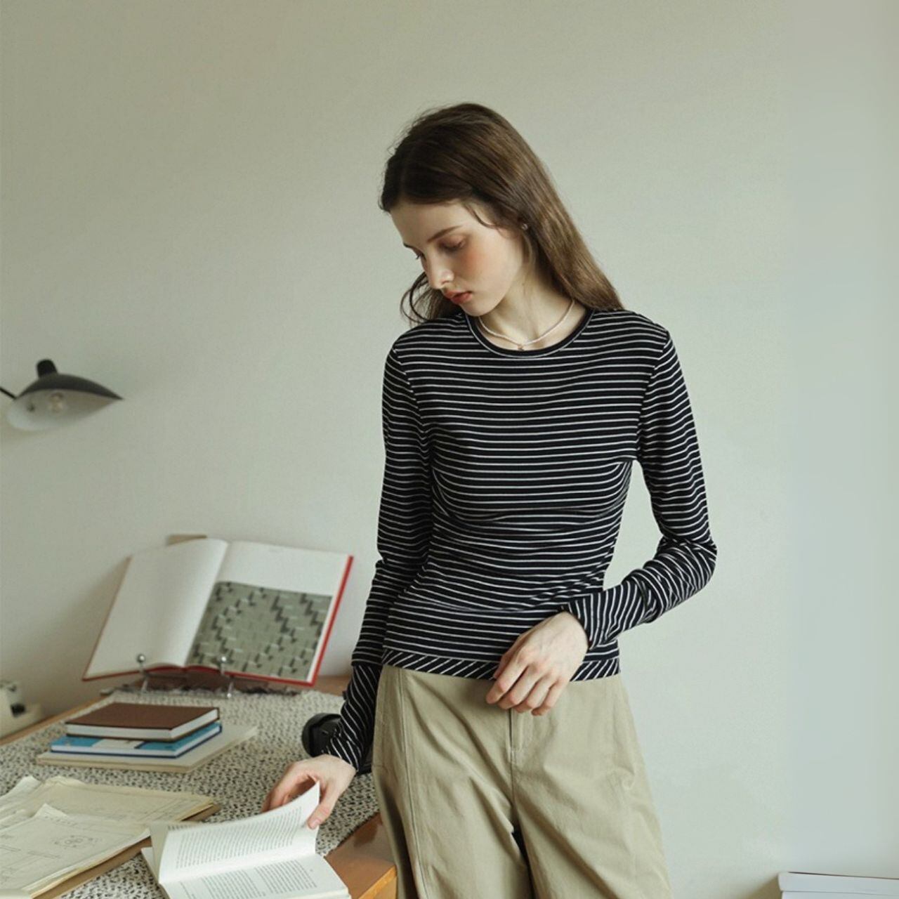 ブラックベースの細ボーダーが印象的な一枚は、都会のカフェで静かに本を読むパリジェンヌを思わせるよう。