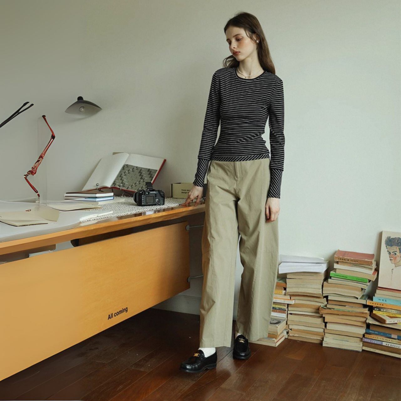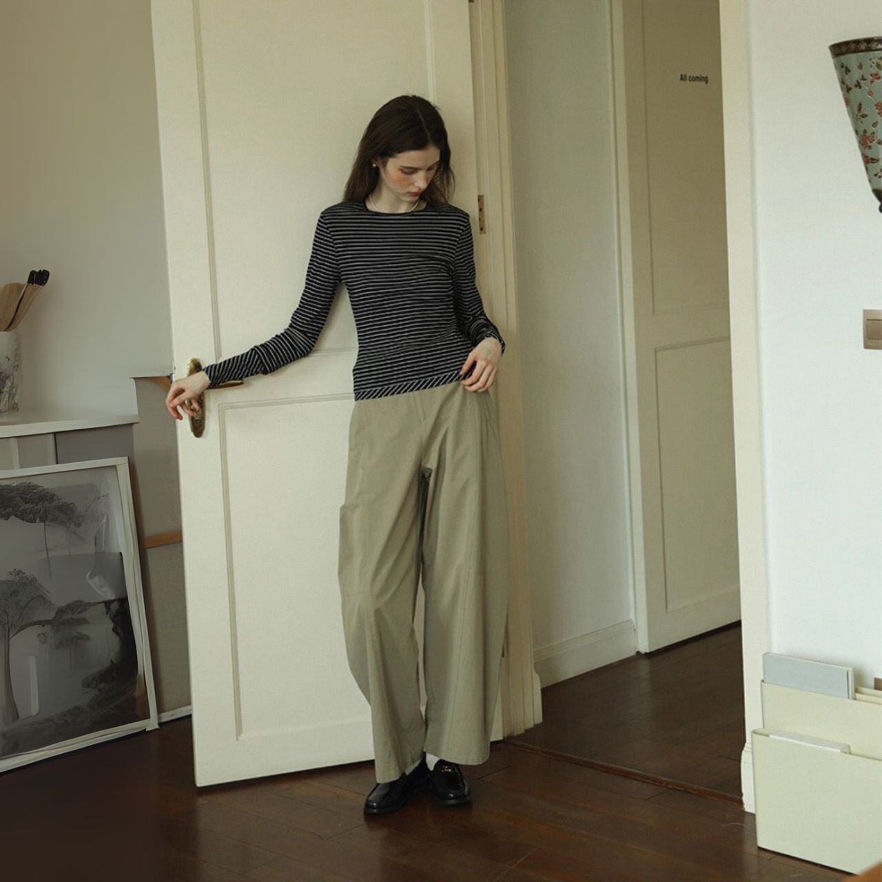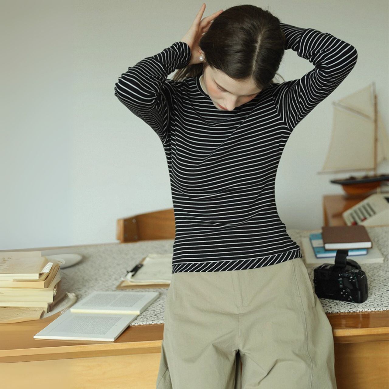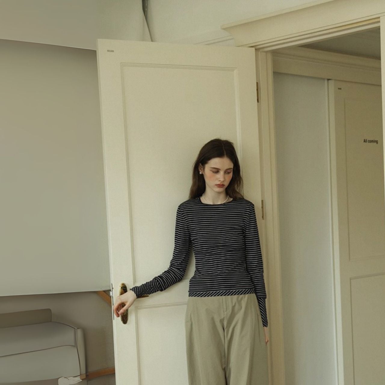 ブラックベースの細ボーダーが印象的な一枚は、都会のカフェで静かに本を読むパリジェンヌを思わせるよう。