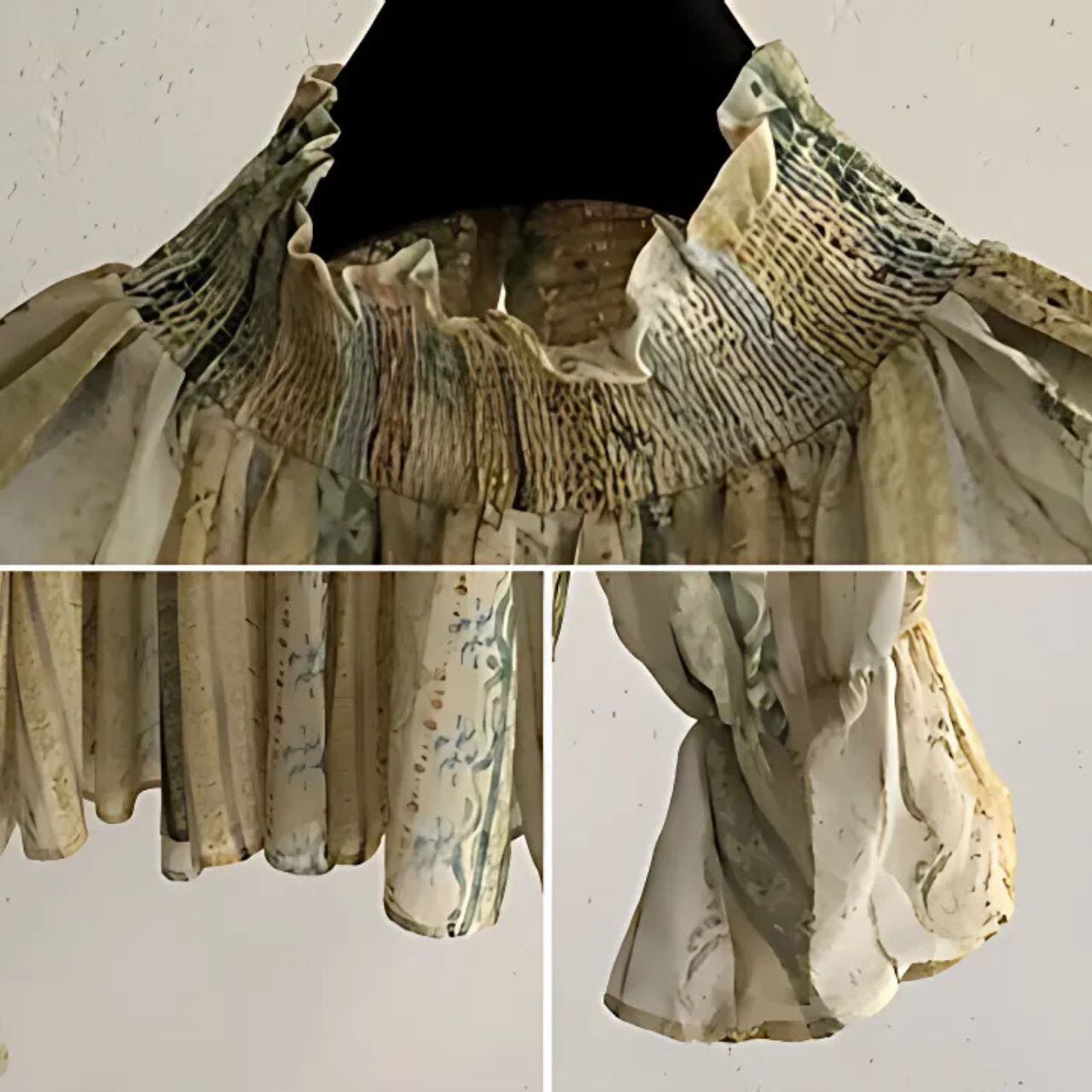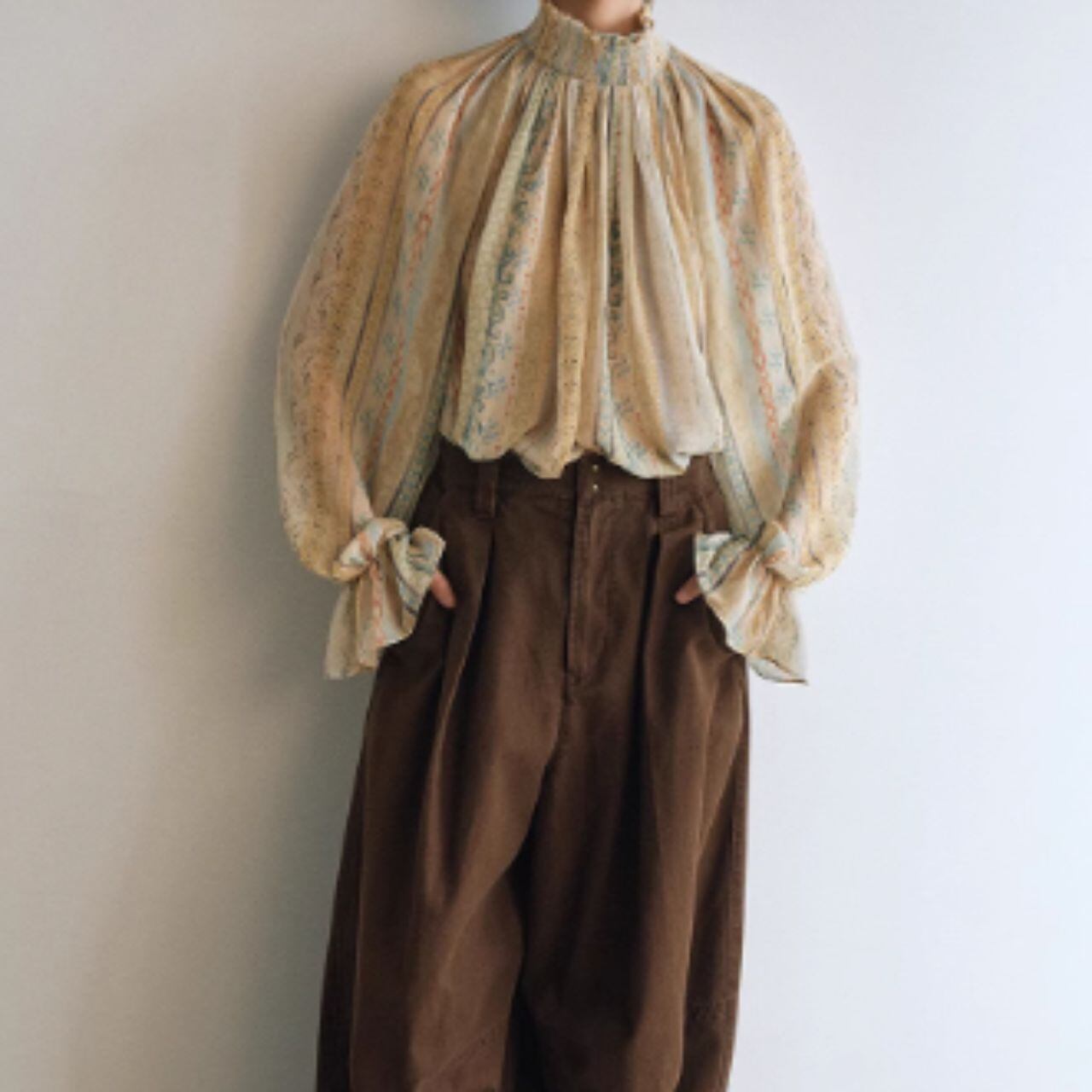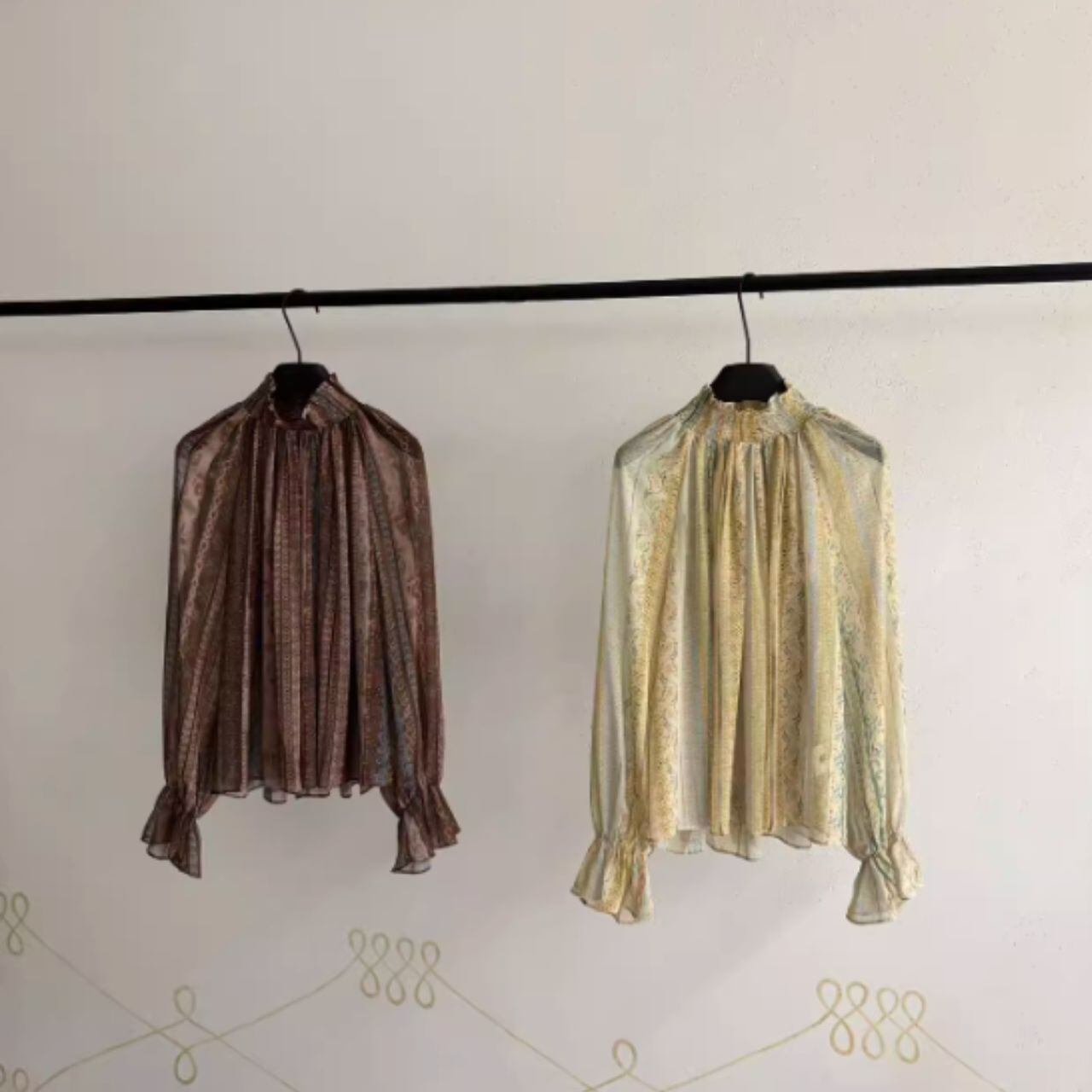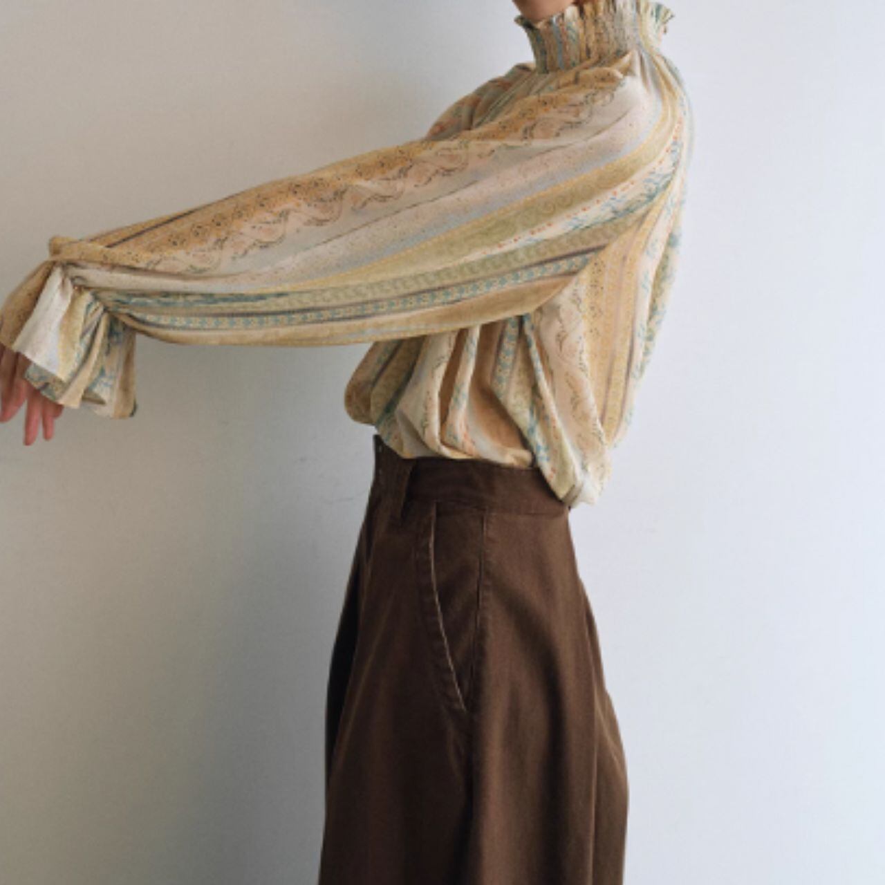 繊細なシアー生地に、スタンドフリルとフレアカフを添えて、空気を含むドレープが表情をつくります。
