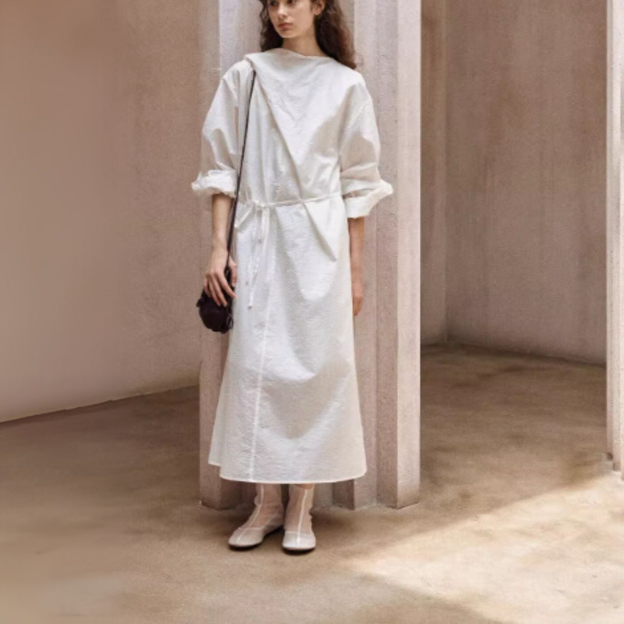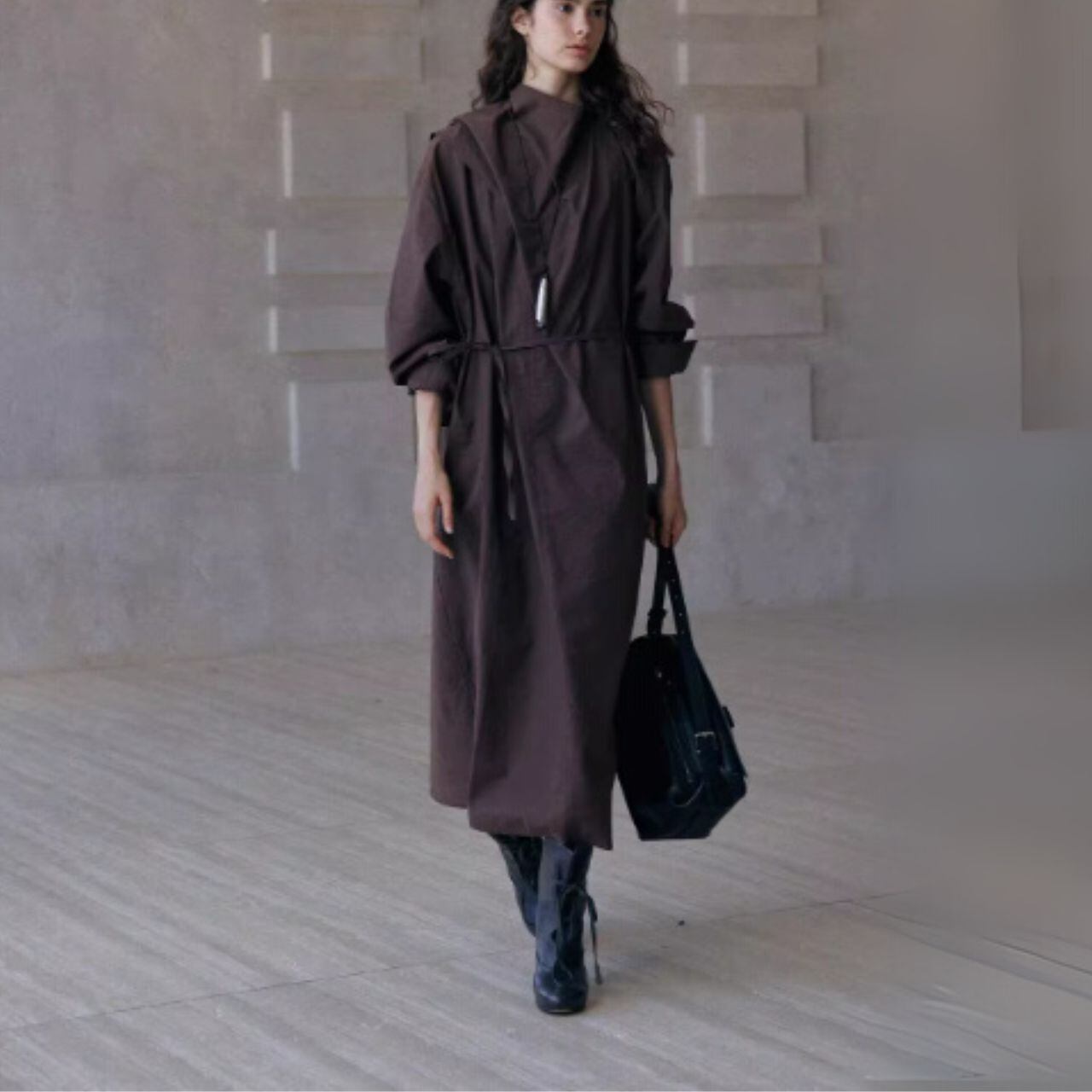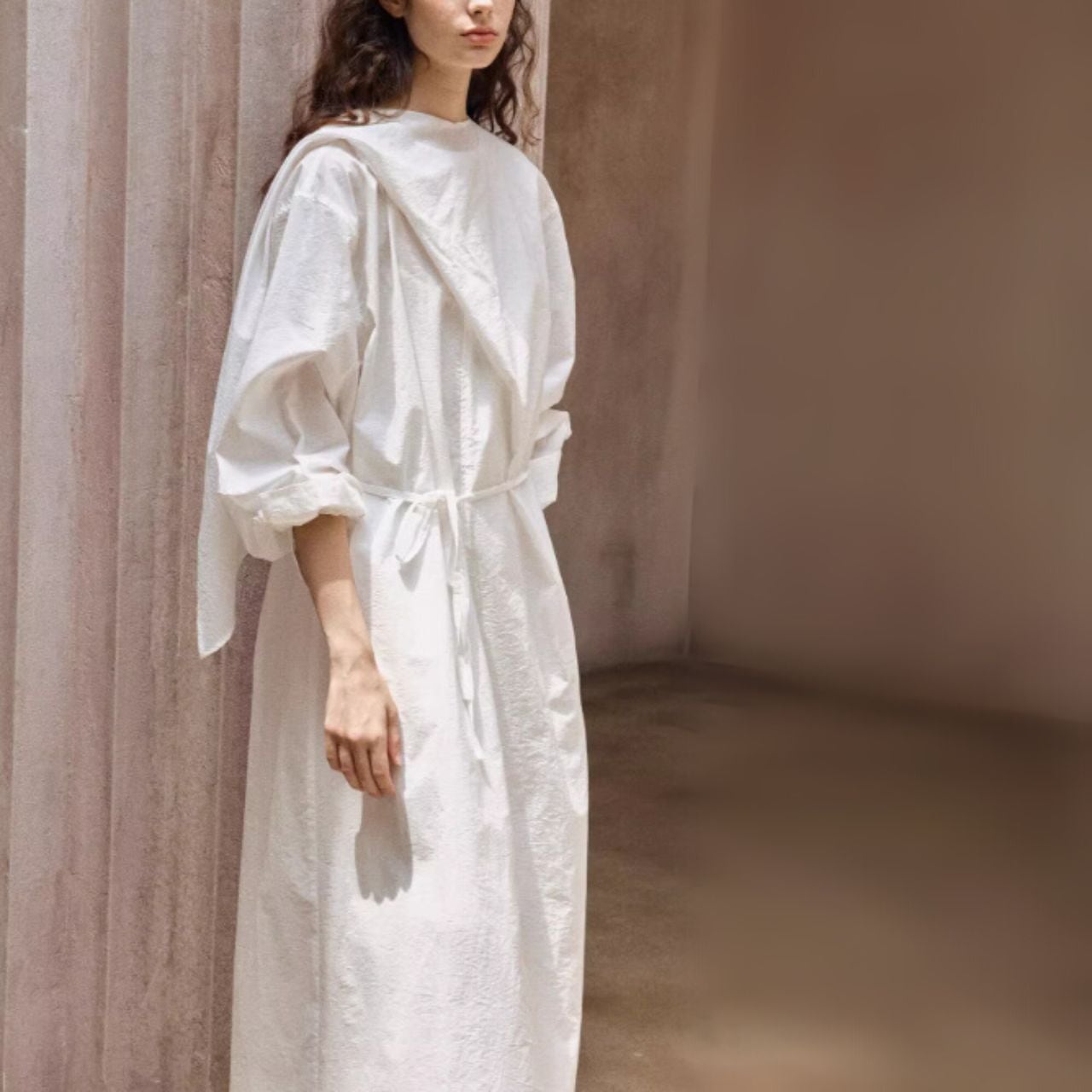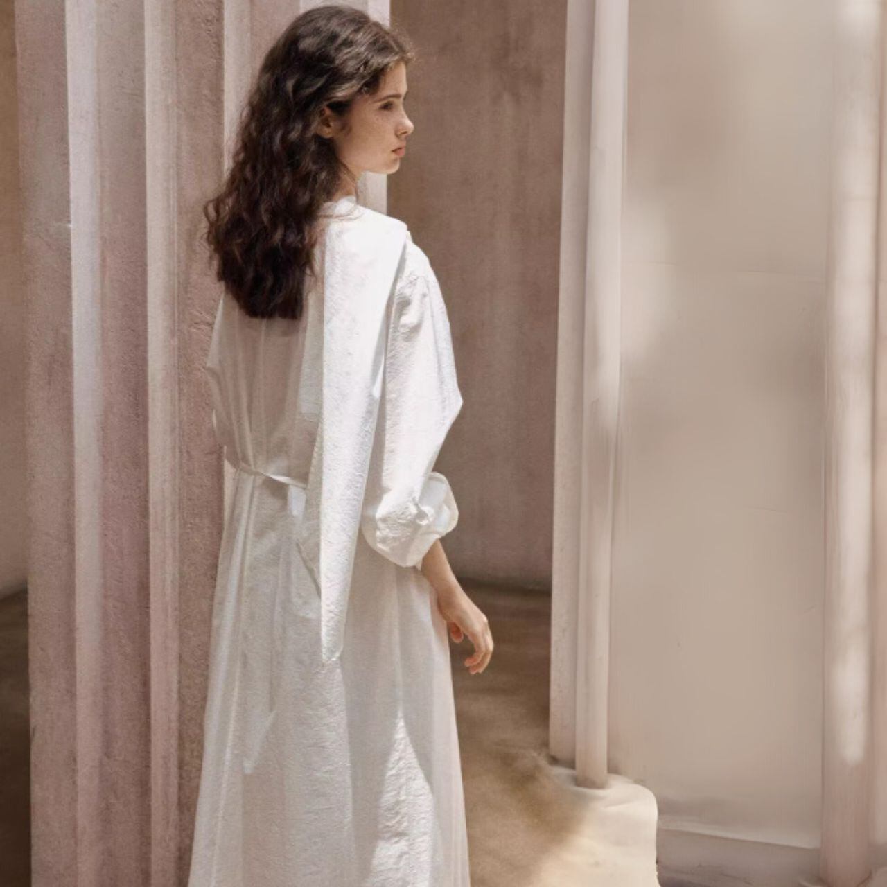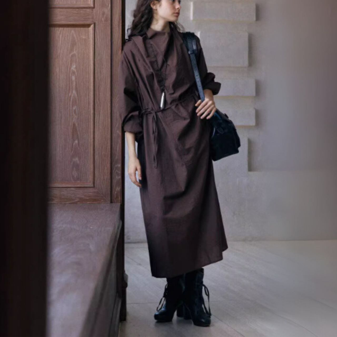 ウエストは前結び・横結び・後ろ結びで表情を変え、体から一歩だけ離れるIラインが軽さをつくります。