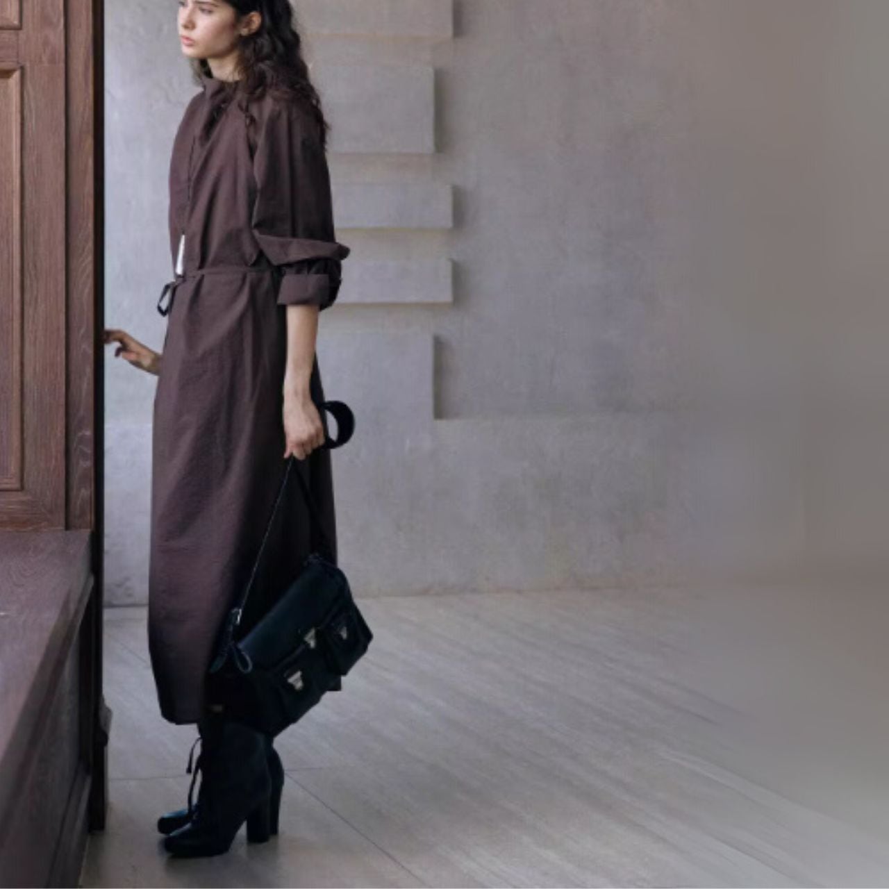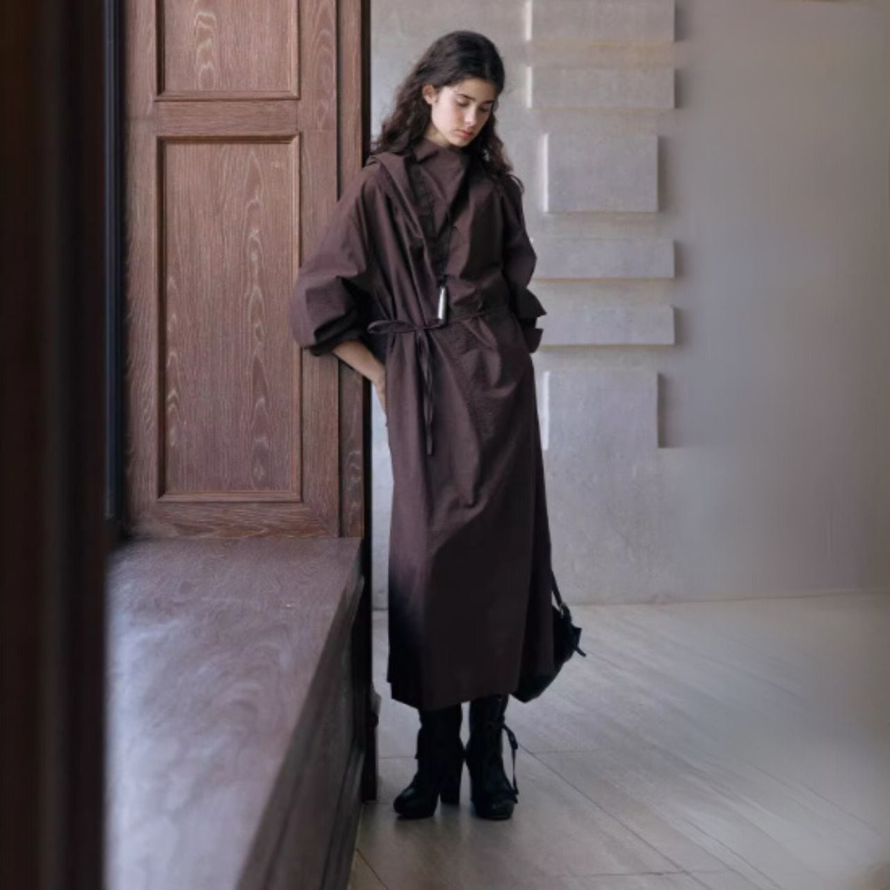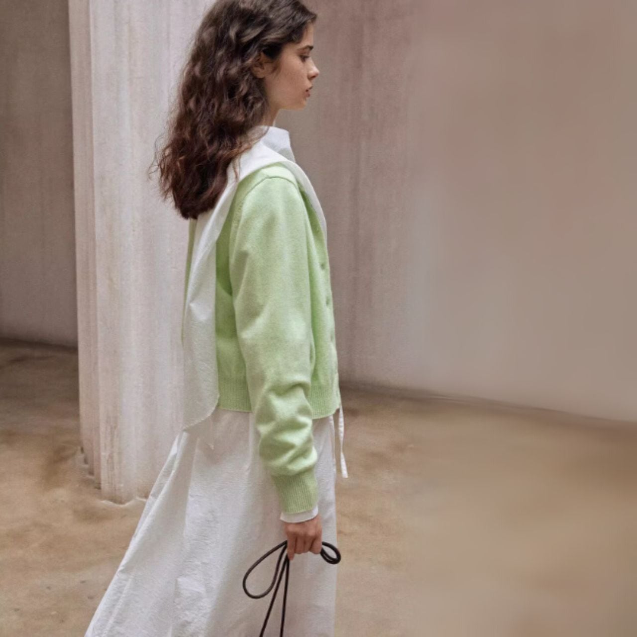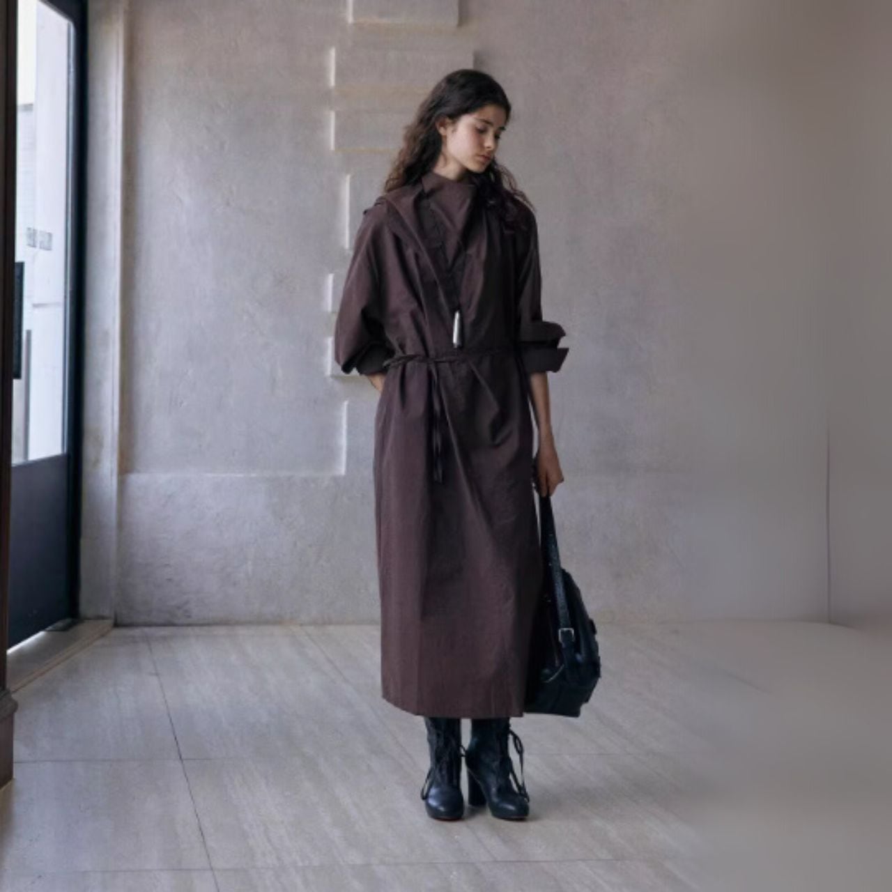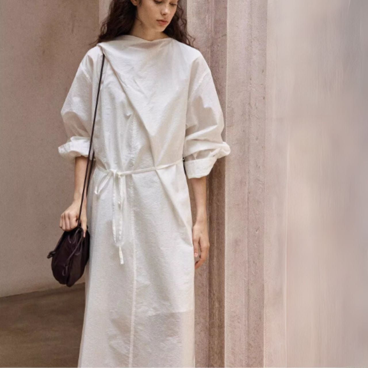 ウエストは前結び・横結び・後ろ結びで表情を変え、体から一歩だけ離れるIラインが軽さをつくります。