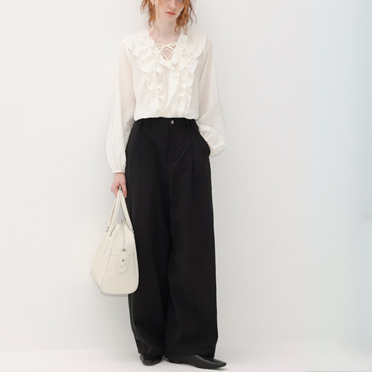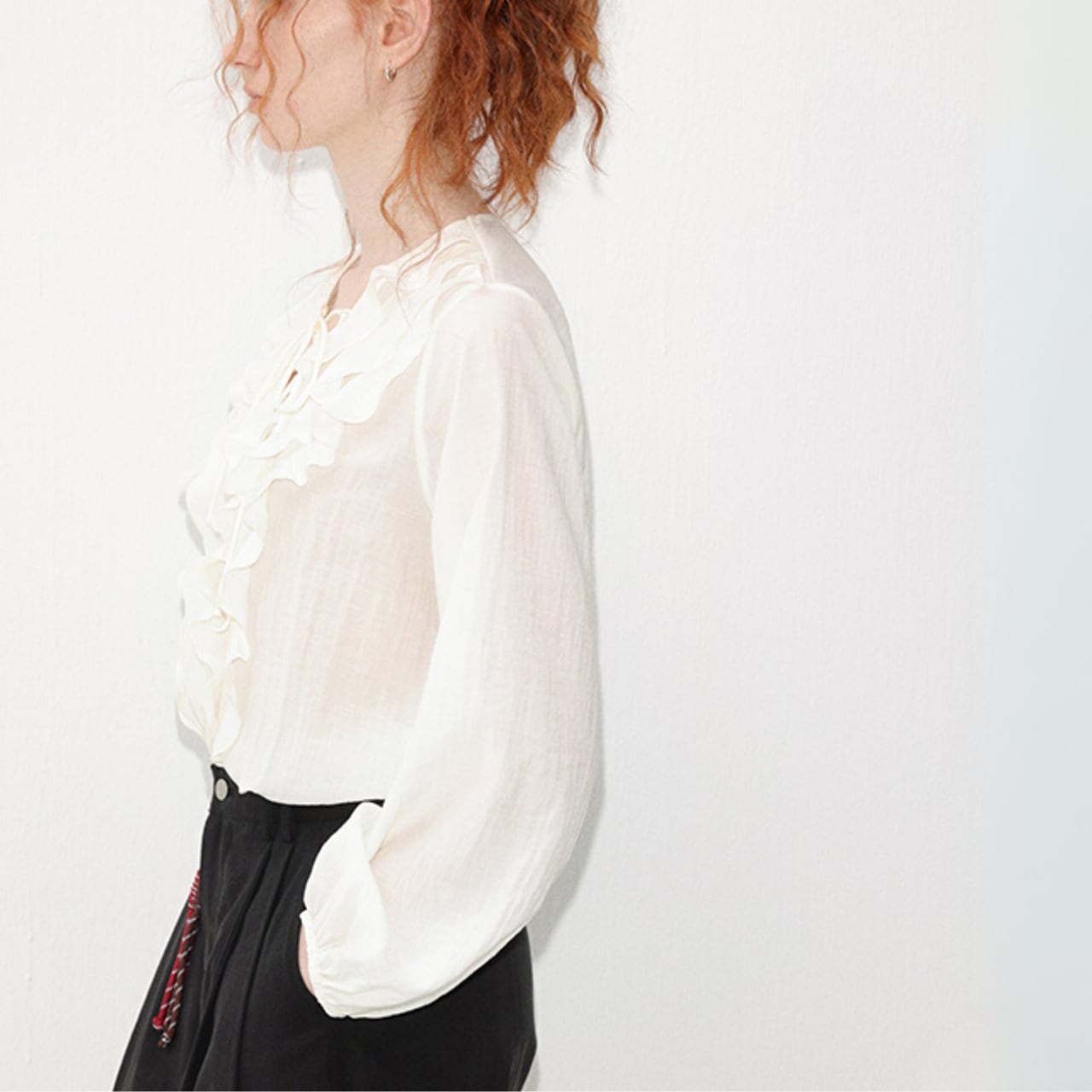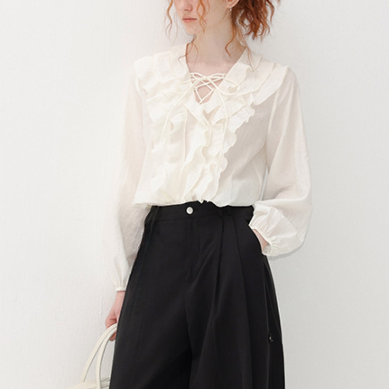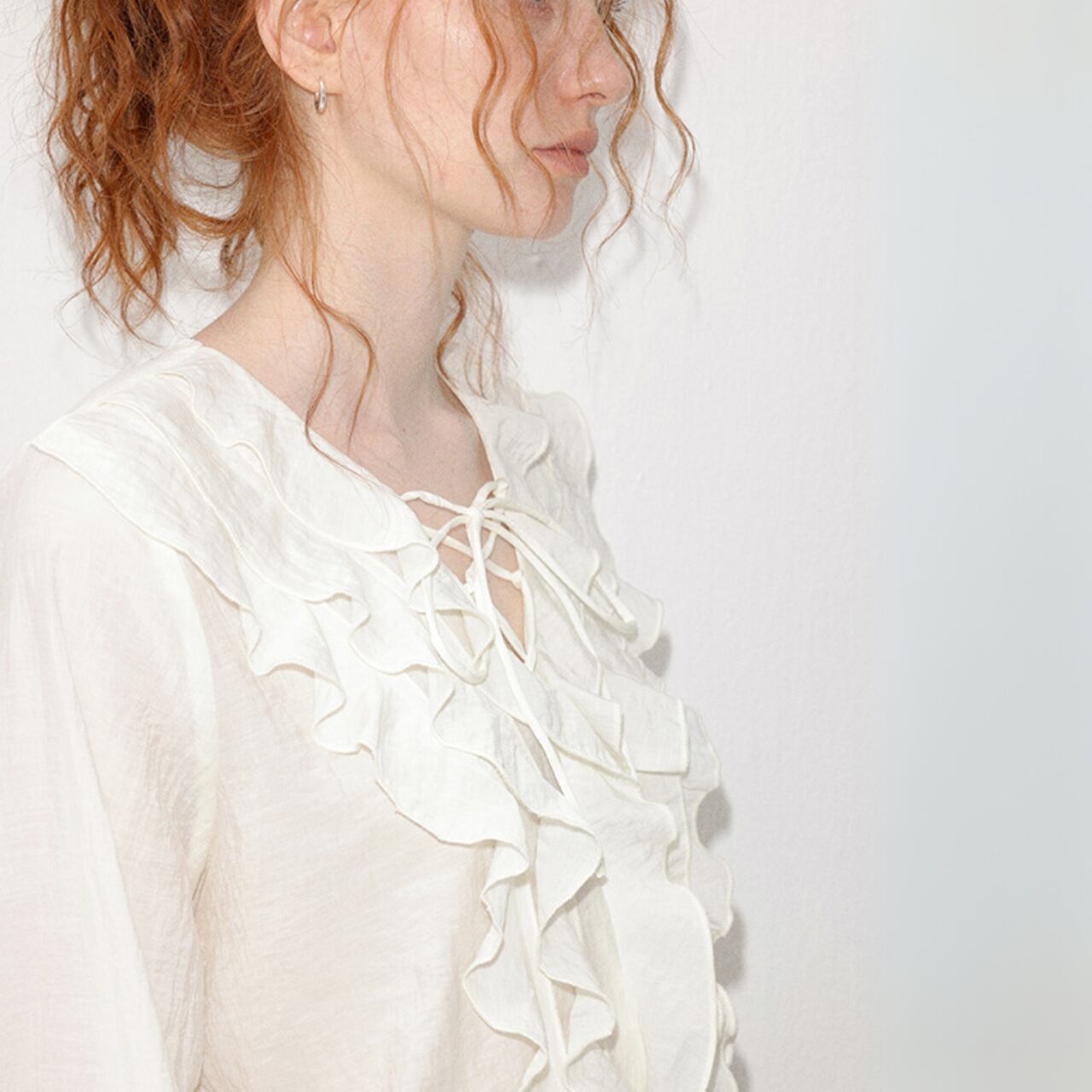 白の軽さに、段フリルをすっと重ねた前身頃。