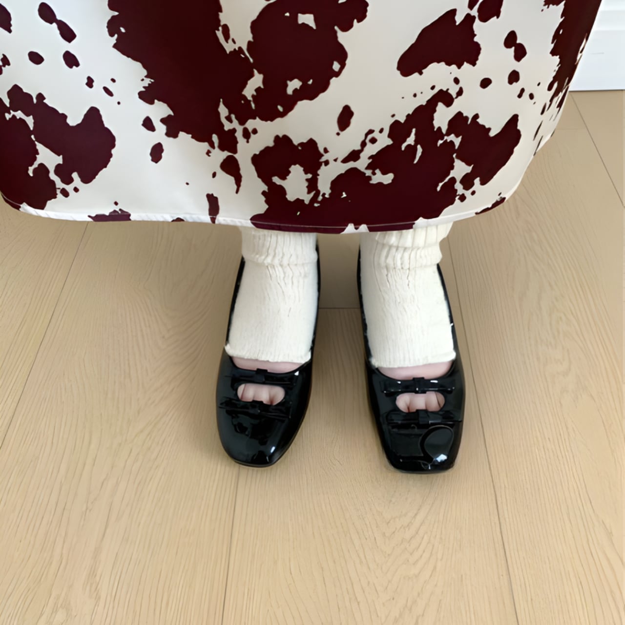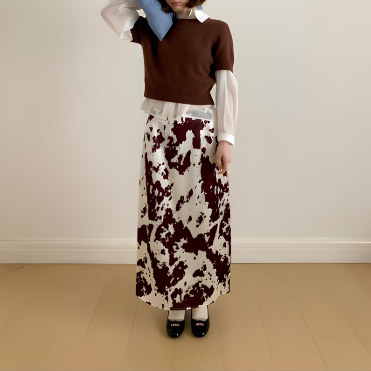 ランダムなプリントが目を引く、ストレートラインのスカート。