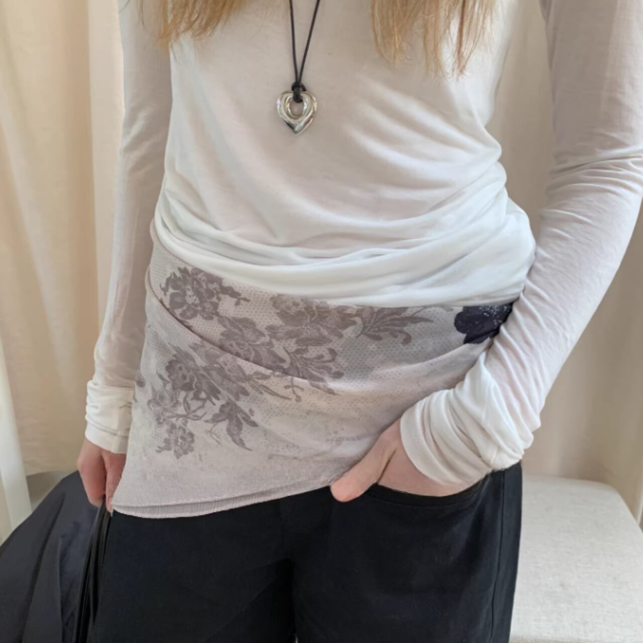 シンプルなトップスやワンピースに合わせるだけで、スタイリングに奥行きを添えてくれます。
