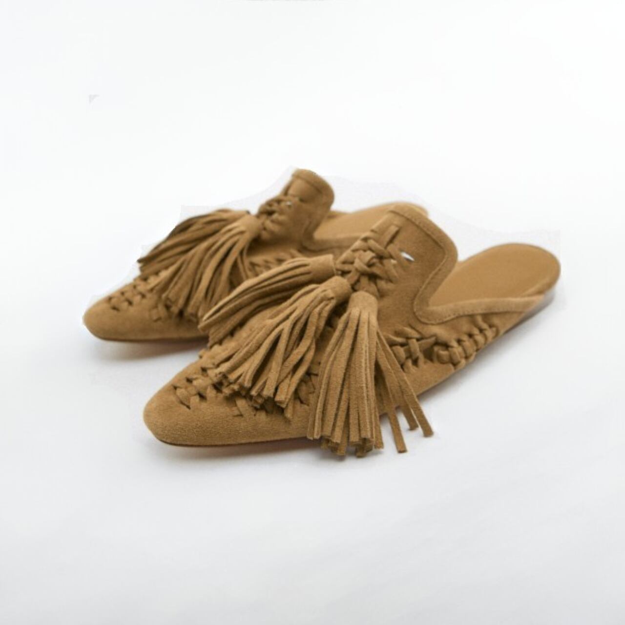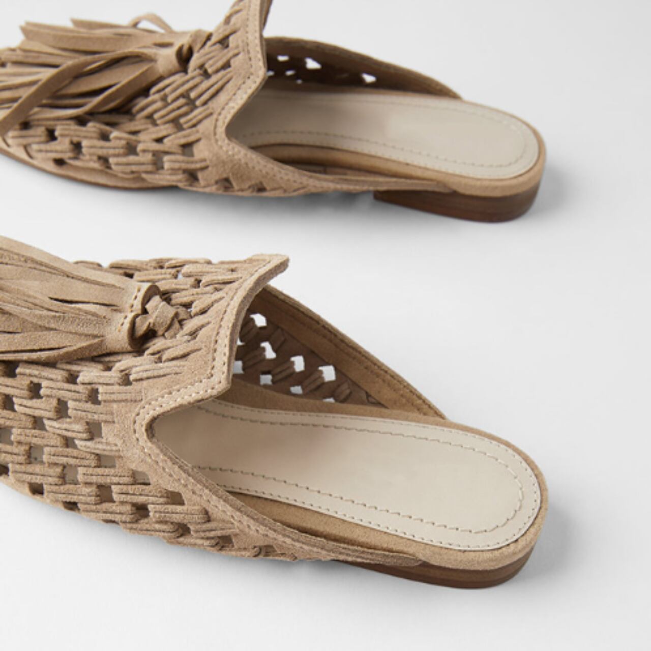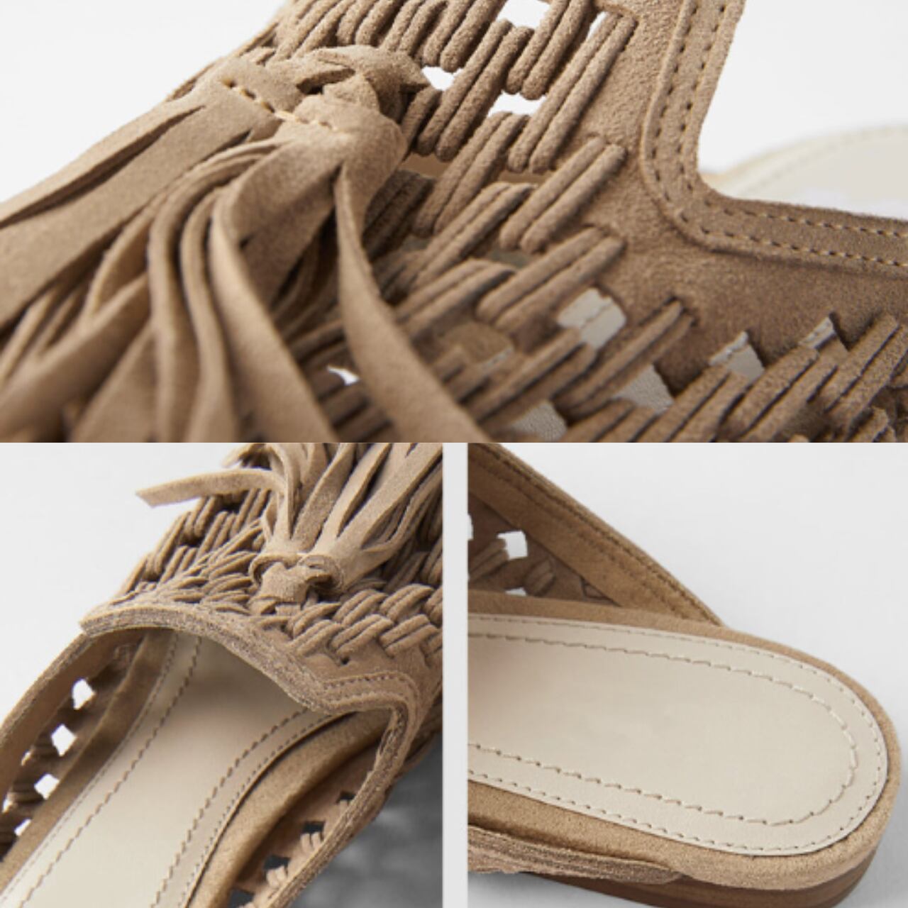 編みの立体感と、揺れるタッセルが印象に残るミュール。