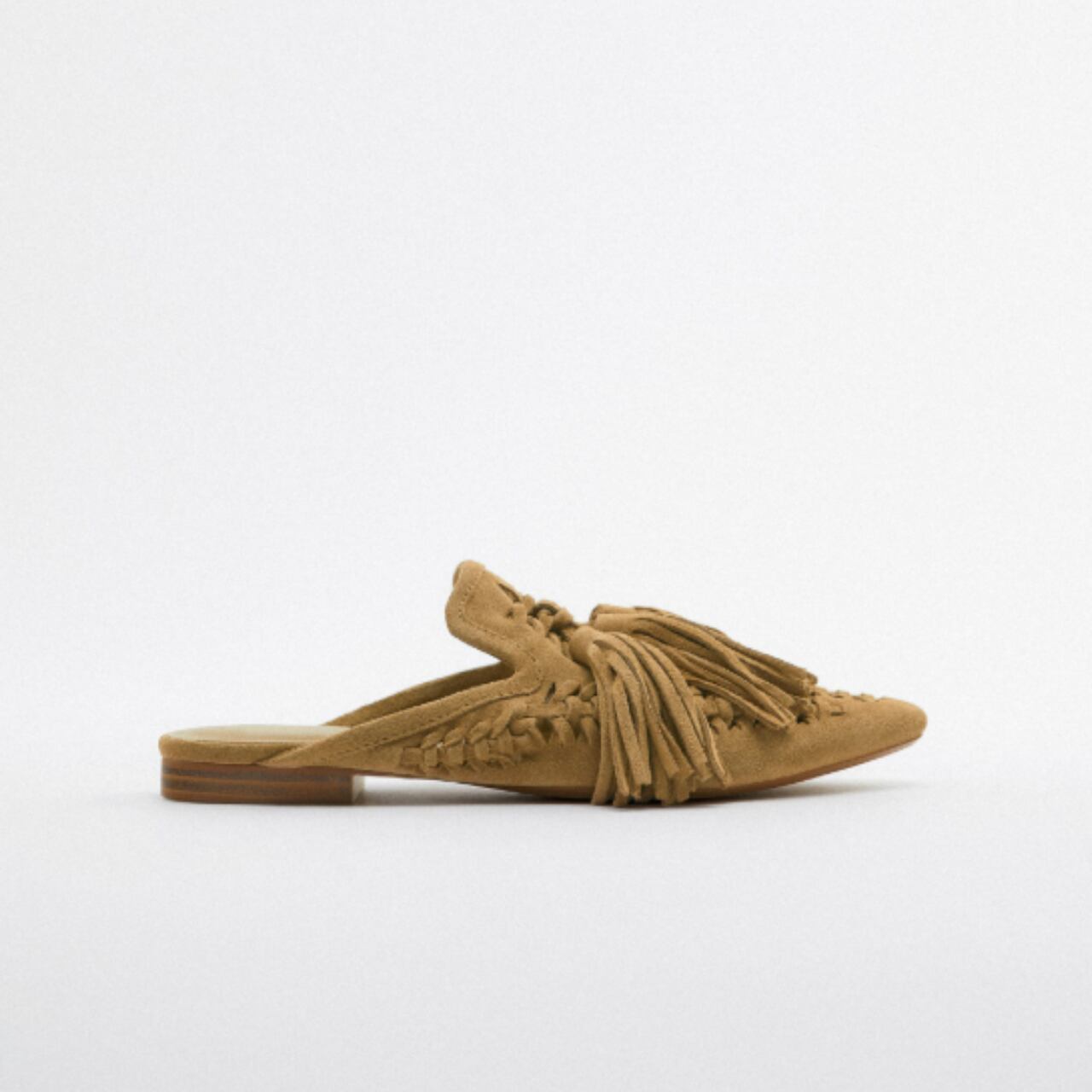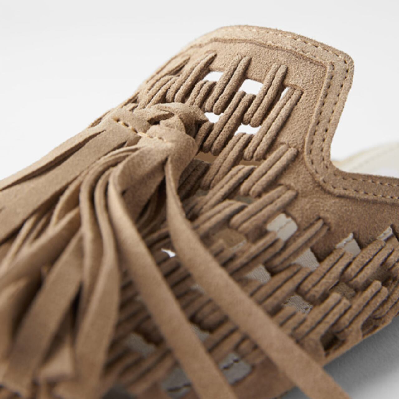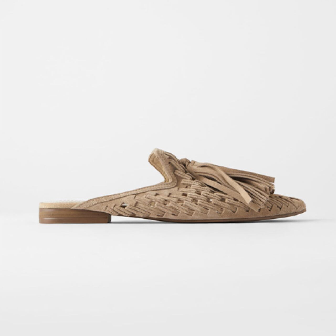 編みの立体感と、揺れるタッセルが印象に残るミュール。