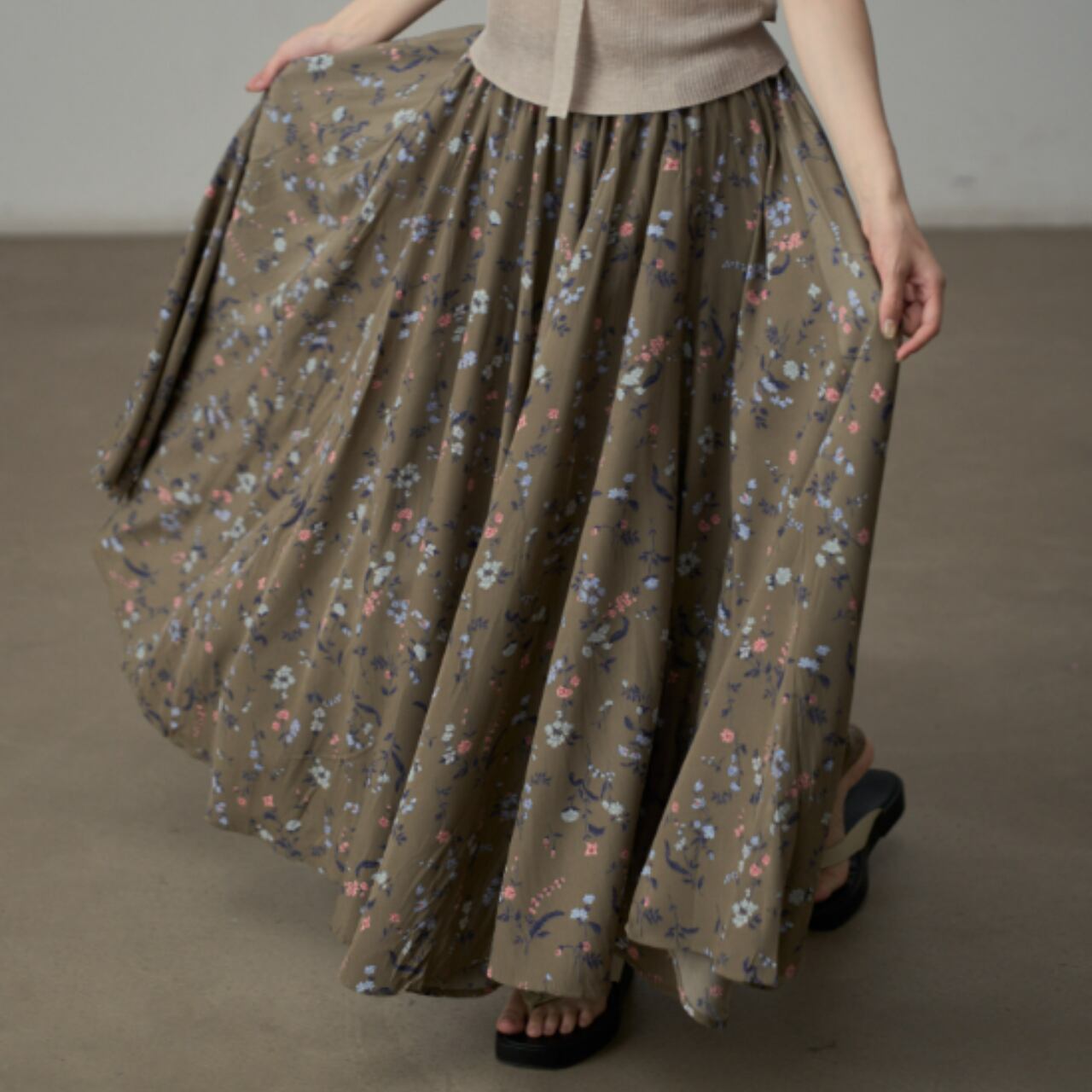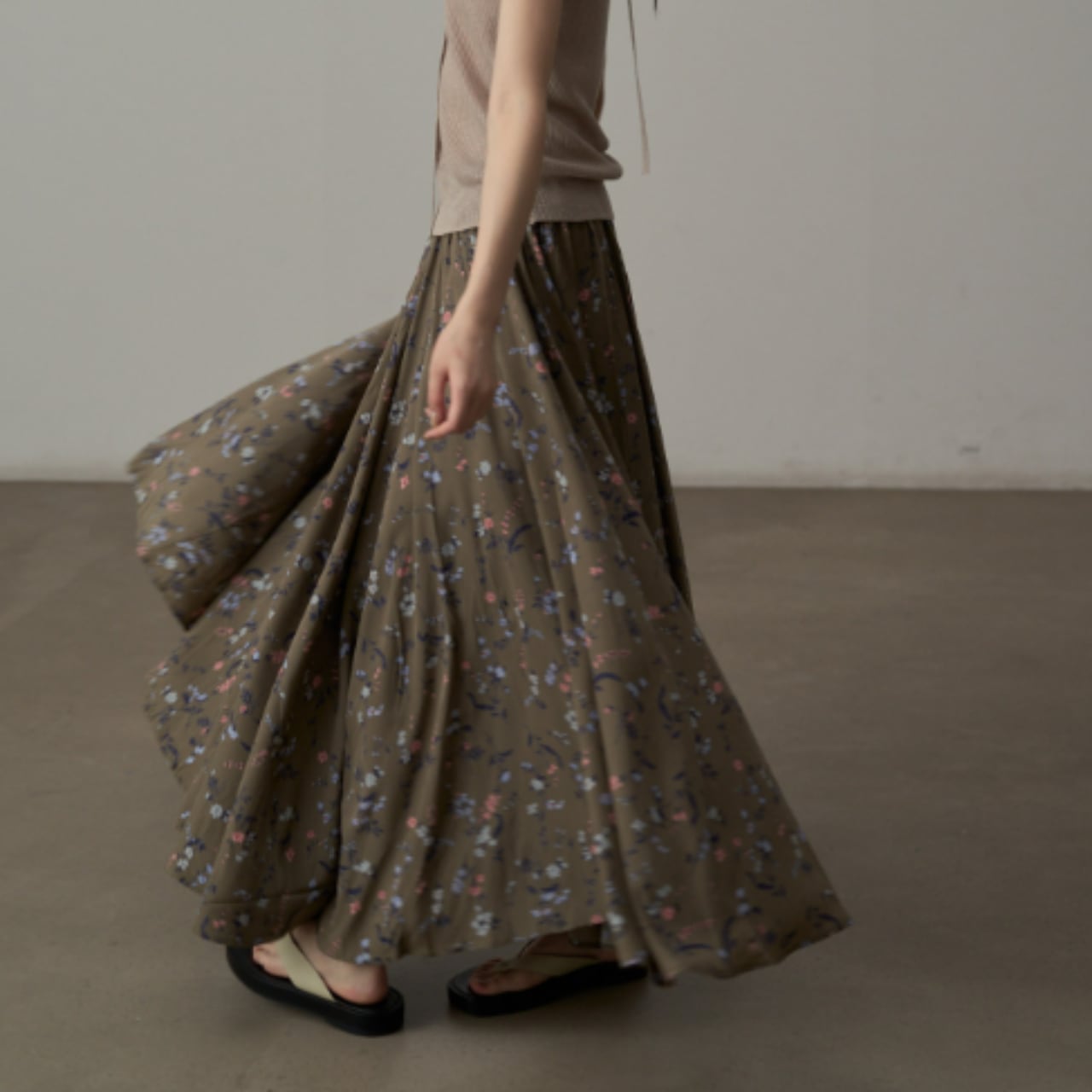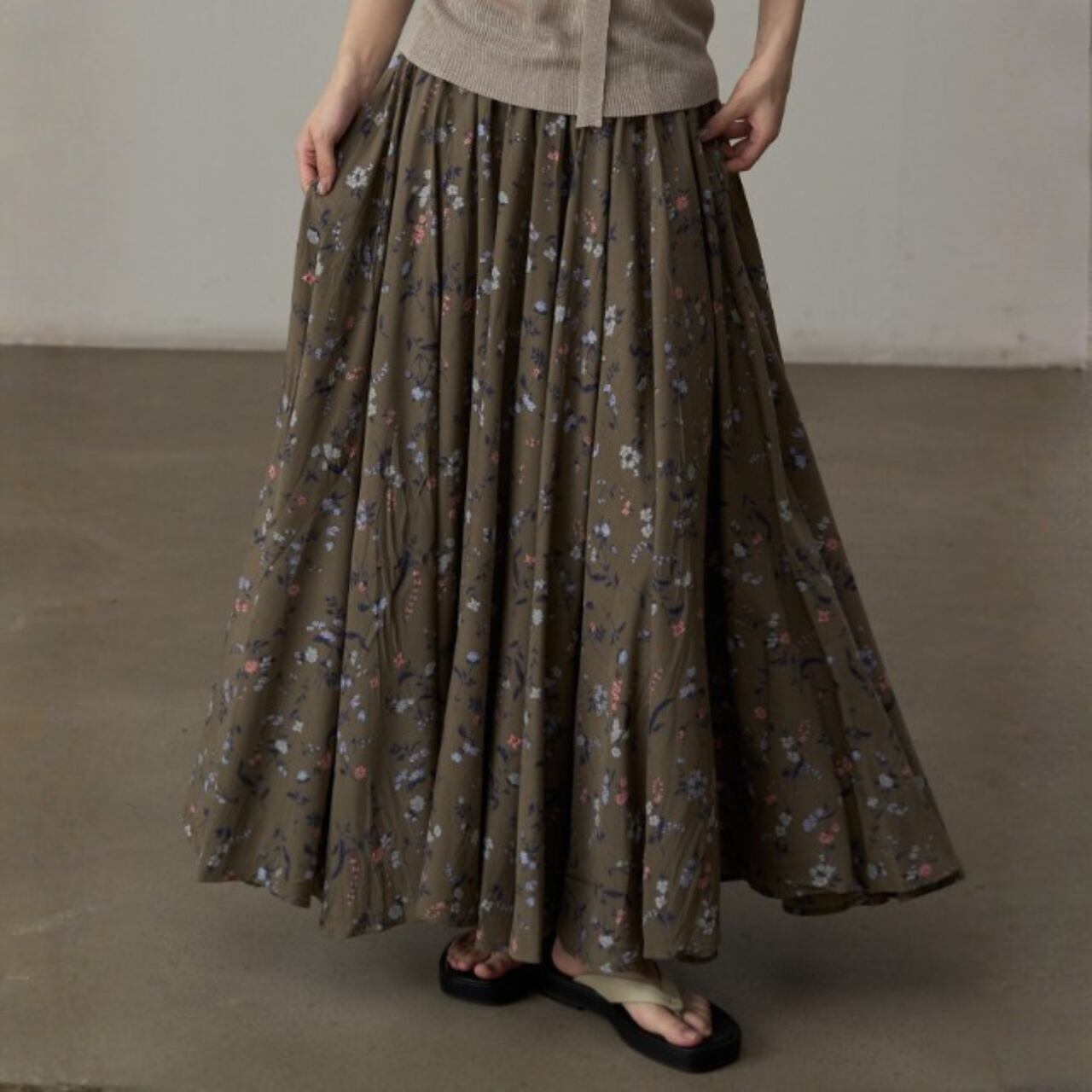 どこか色褪せたような花柄を、落ち着いたトーンでまとめたロングスカート。