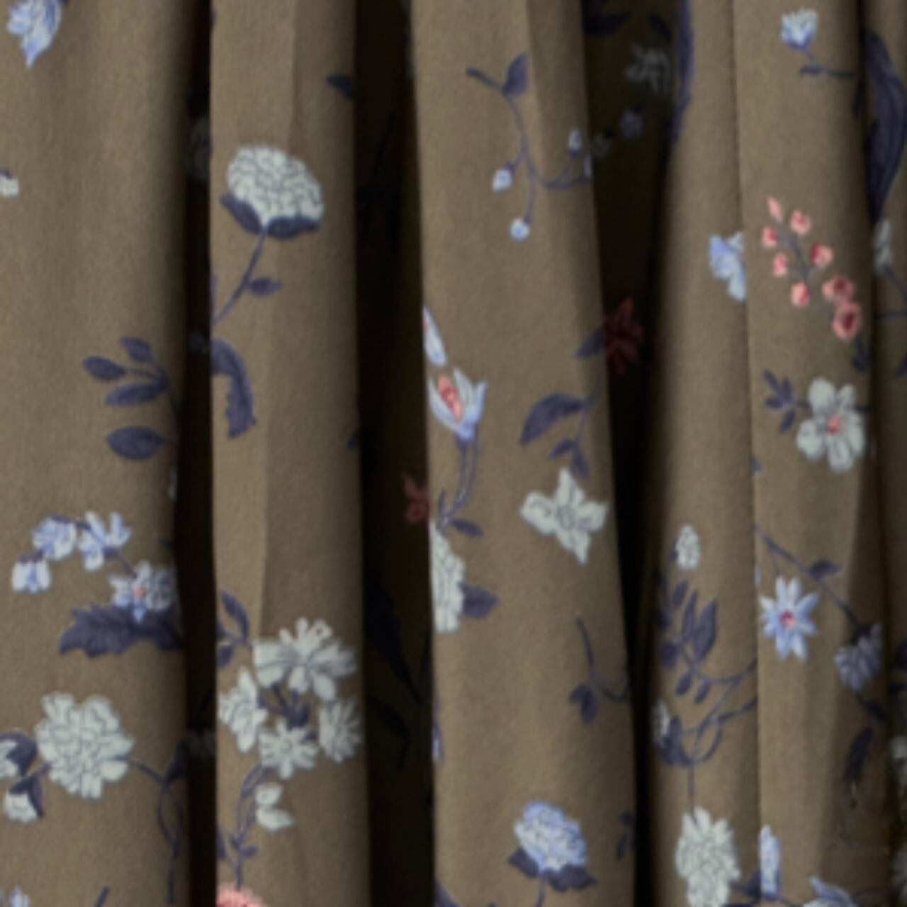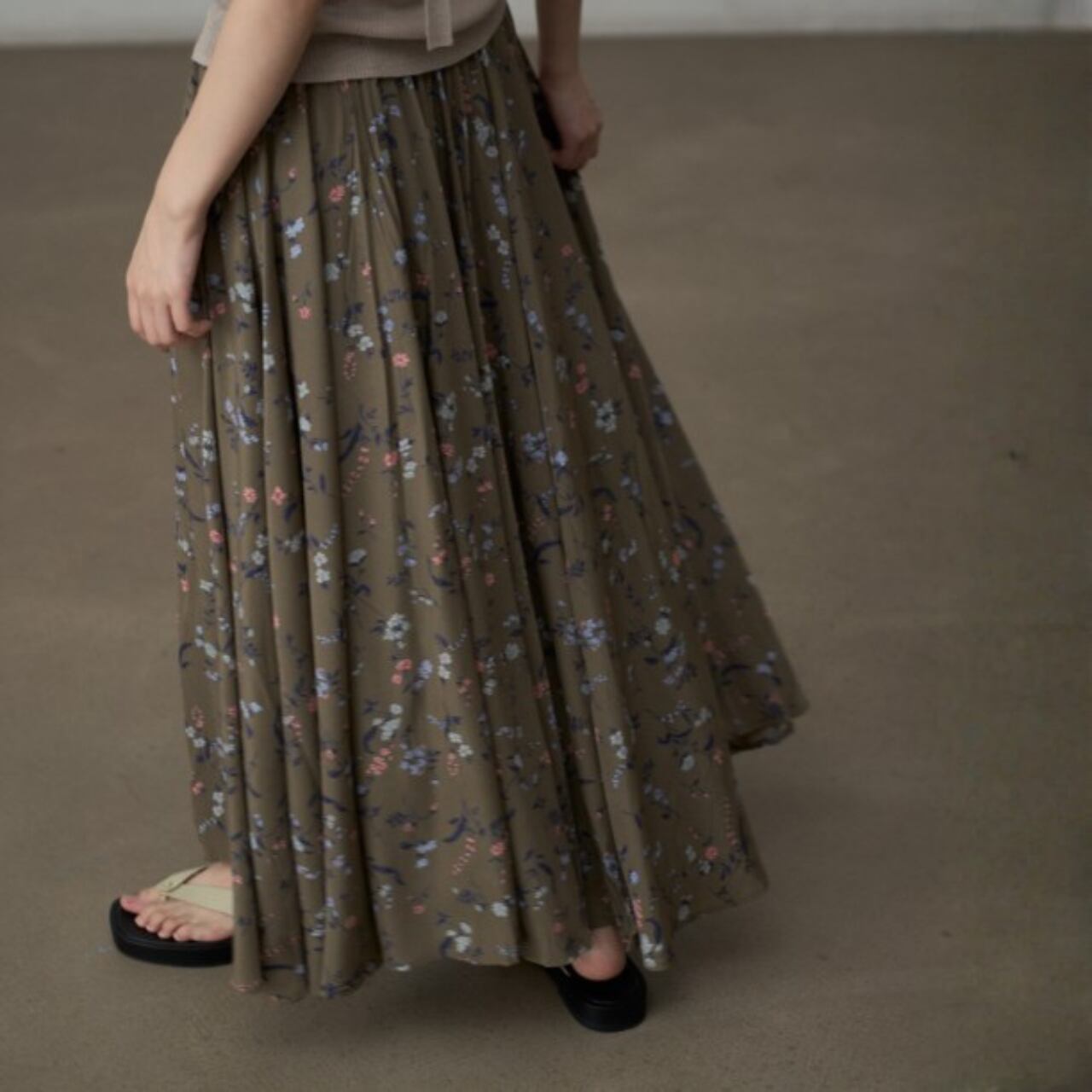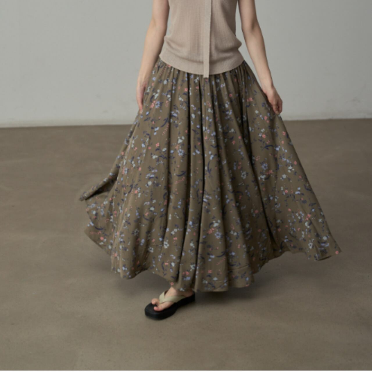 どこか色褪せたような花柄を、落ち着いたトーンでまとめたロングスカート。