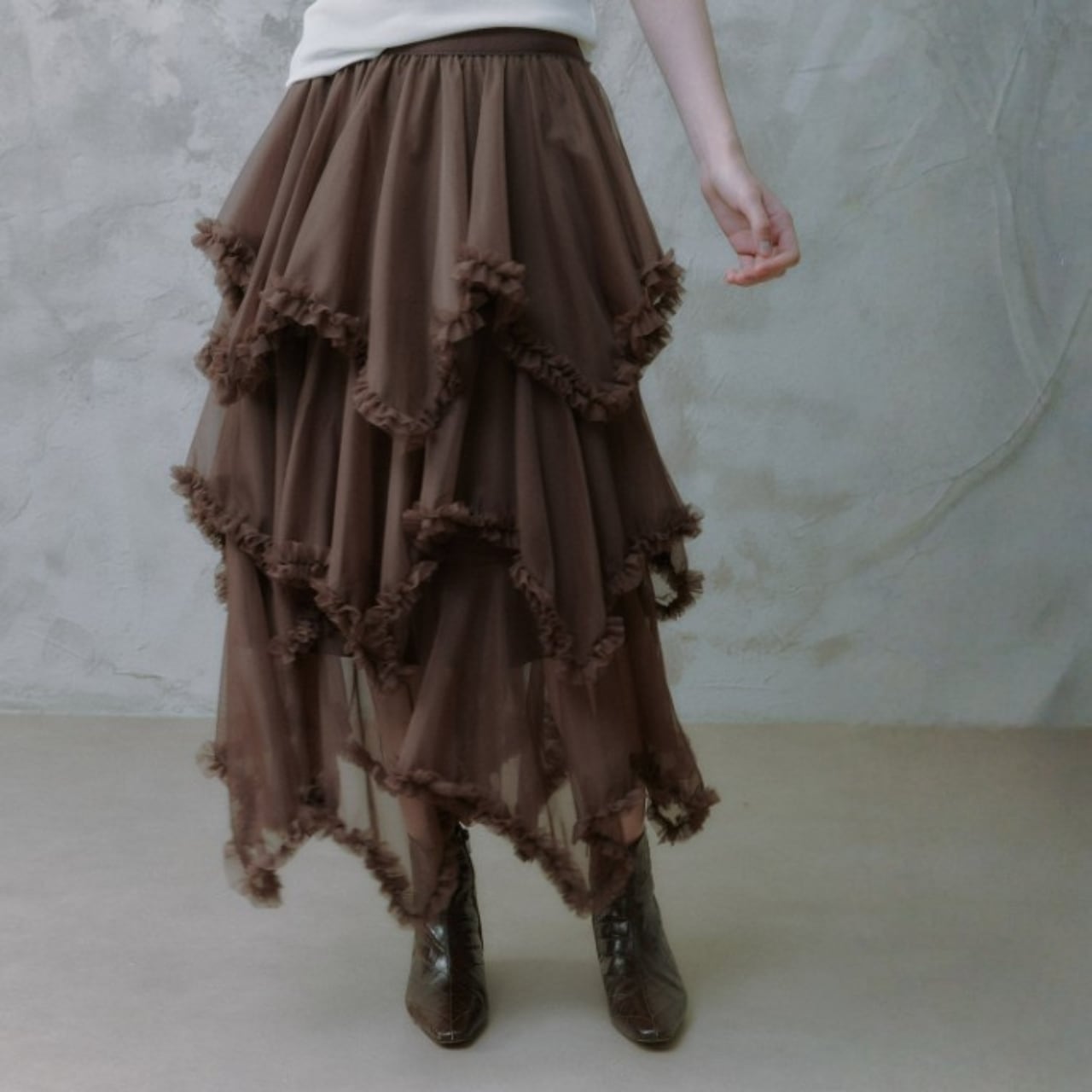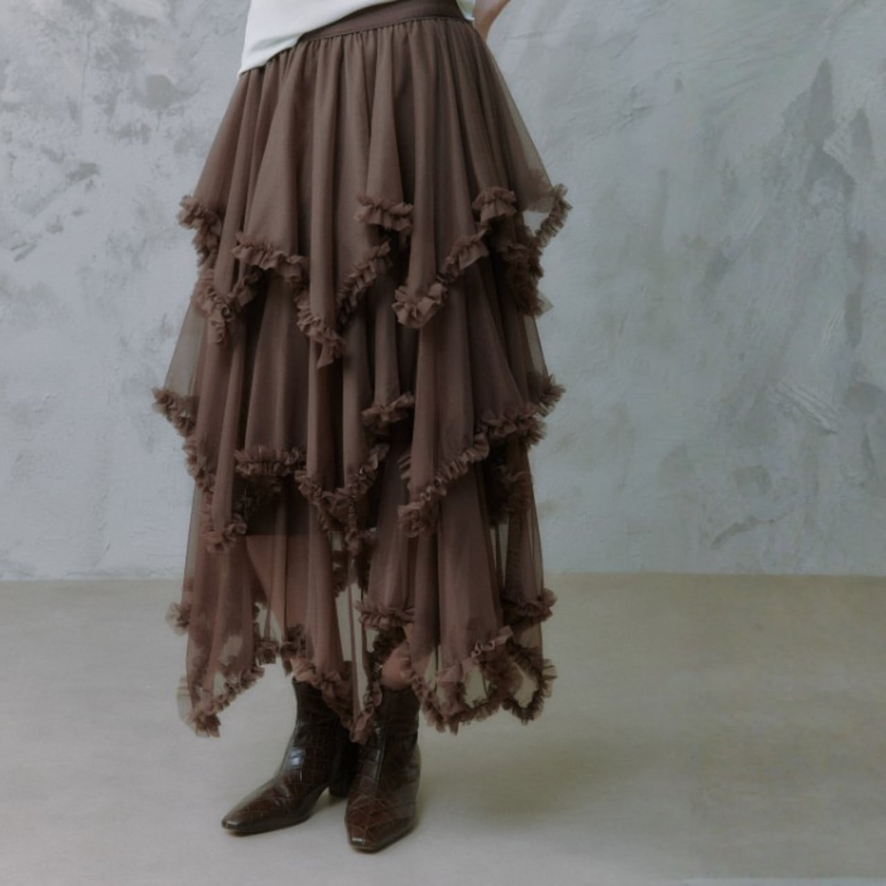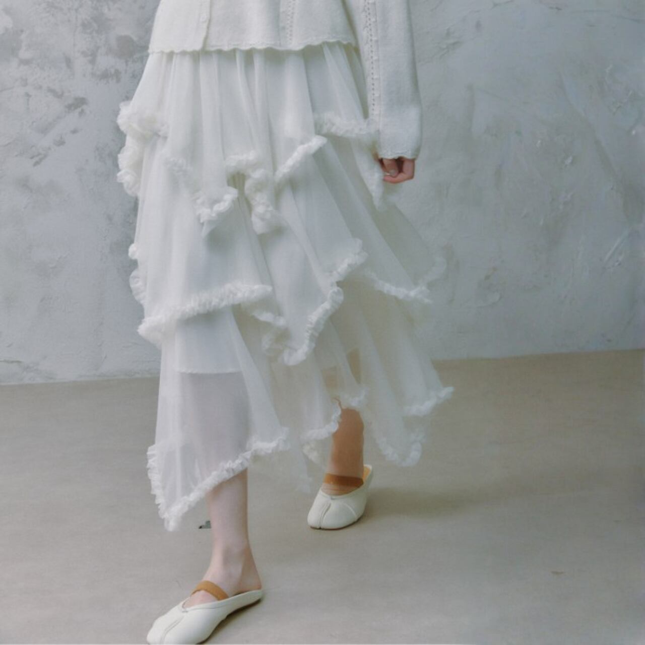 軽やかなシアー素材に、段ごとにあしらわれたフリルが重なり、