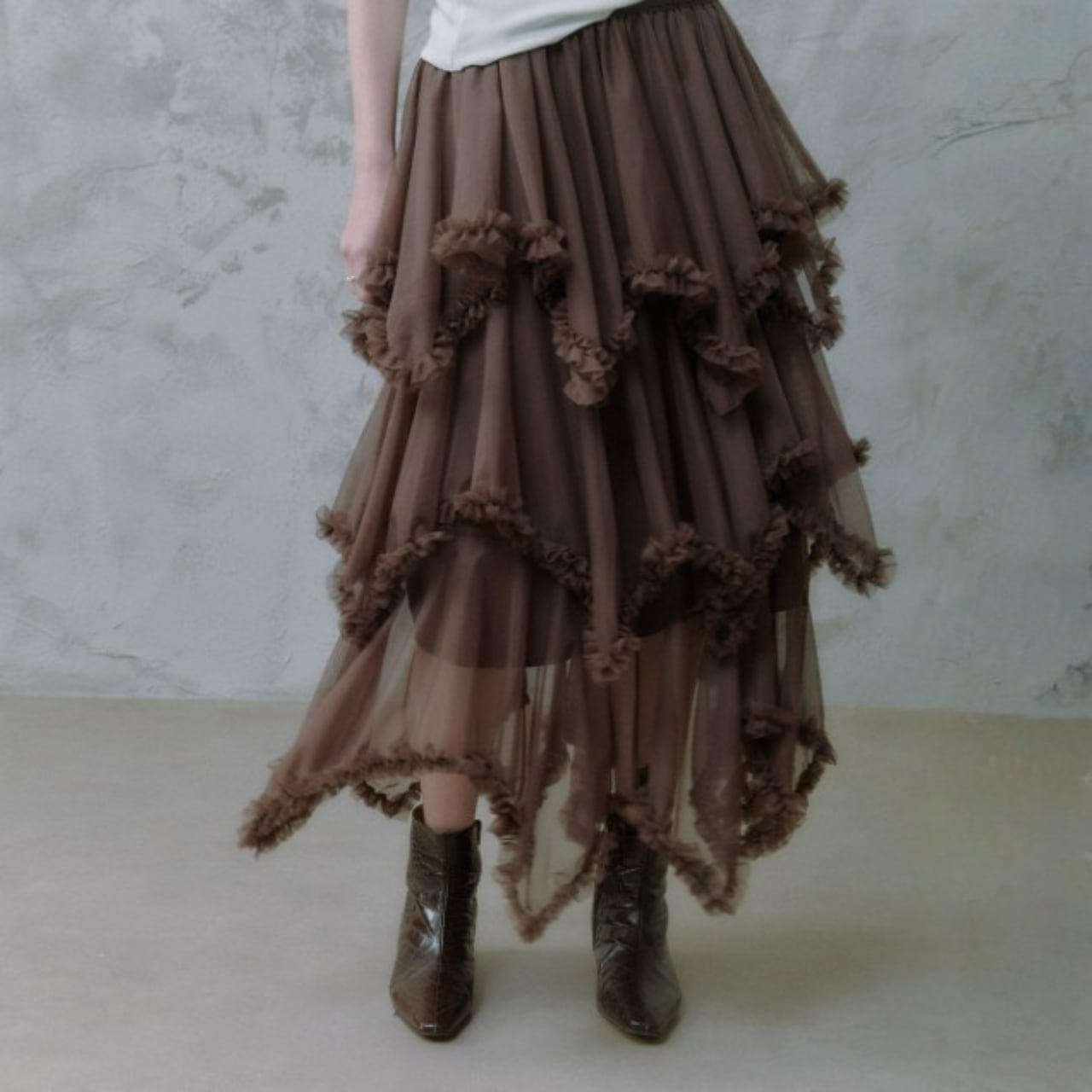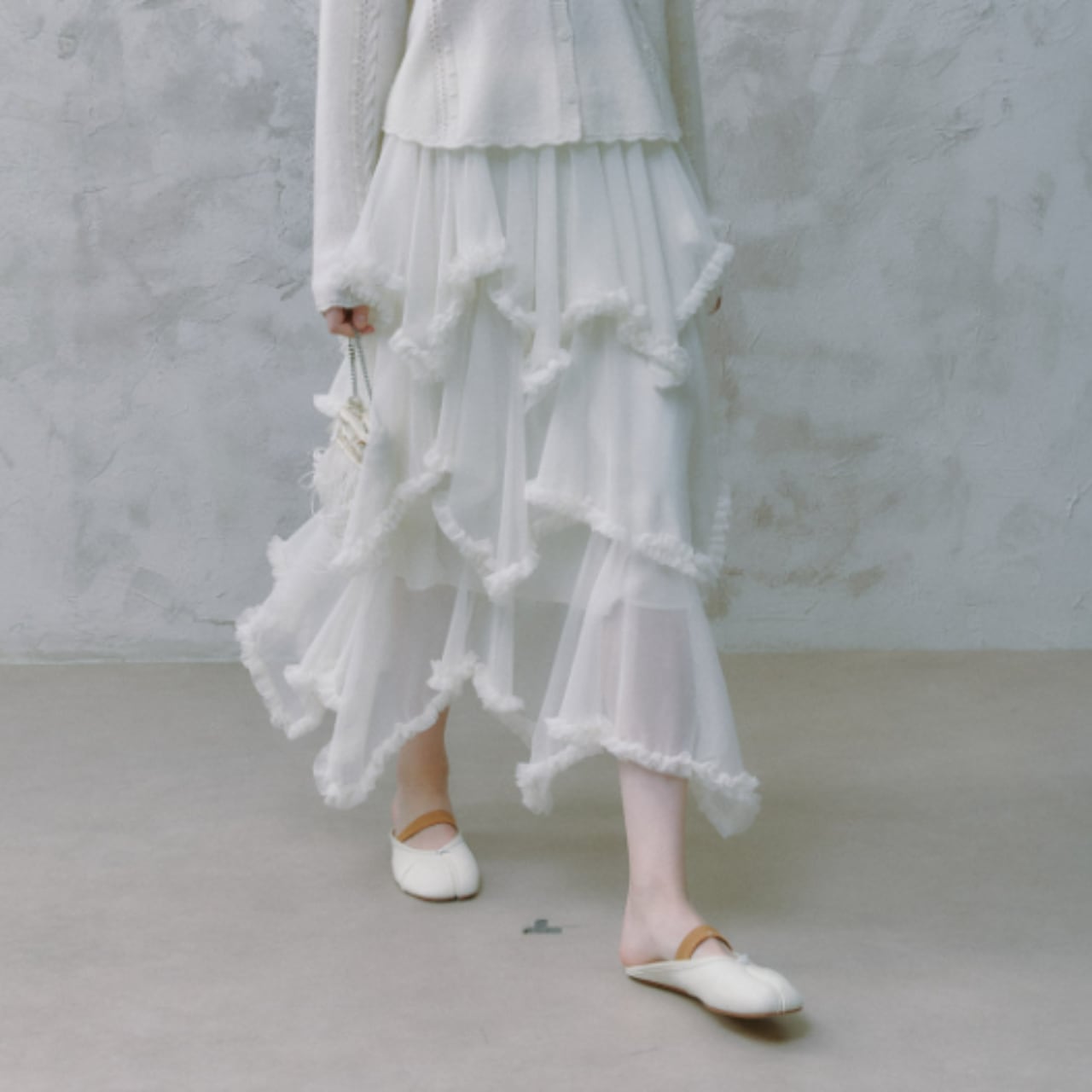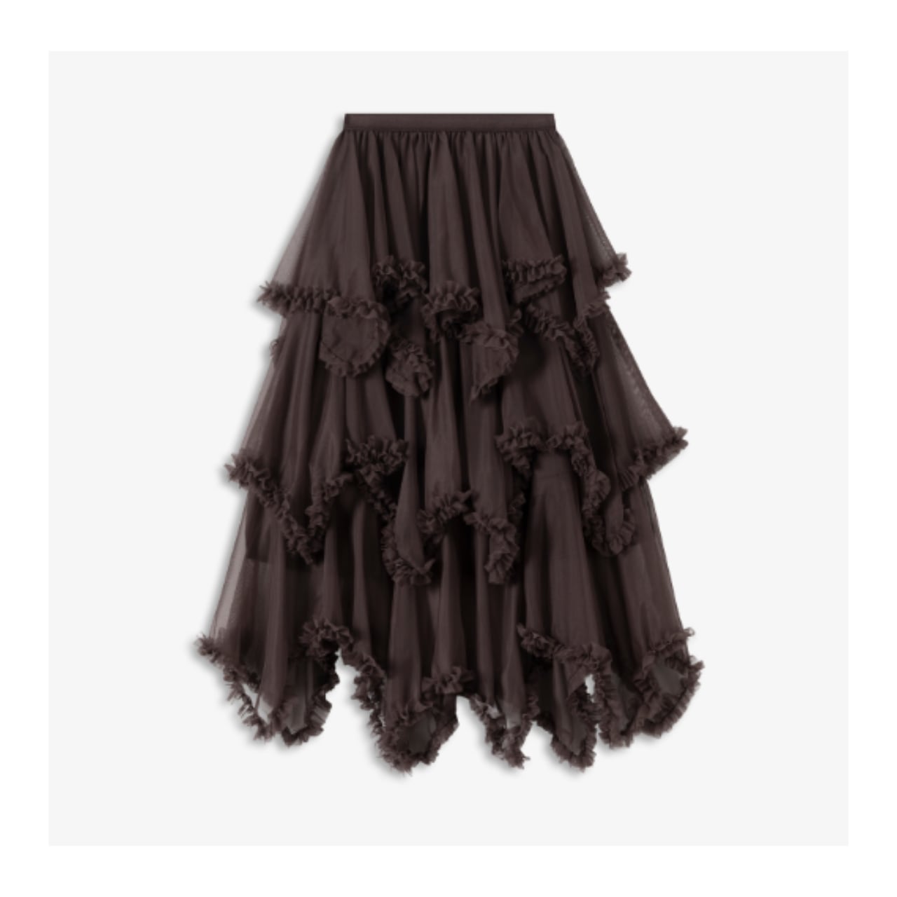 軽やかなシアー素材に、段ごとにあしらわれたフリルが重なり、