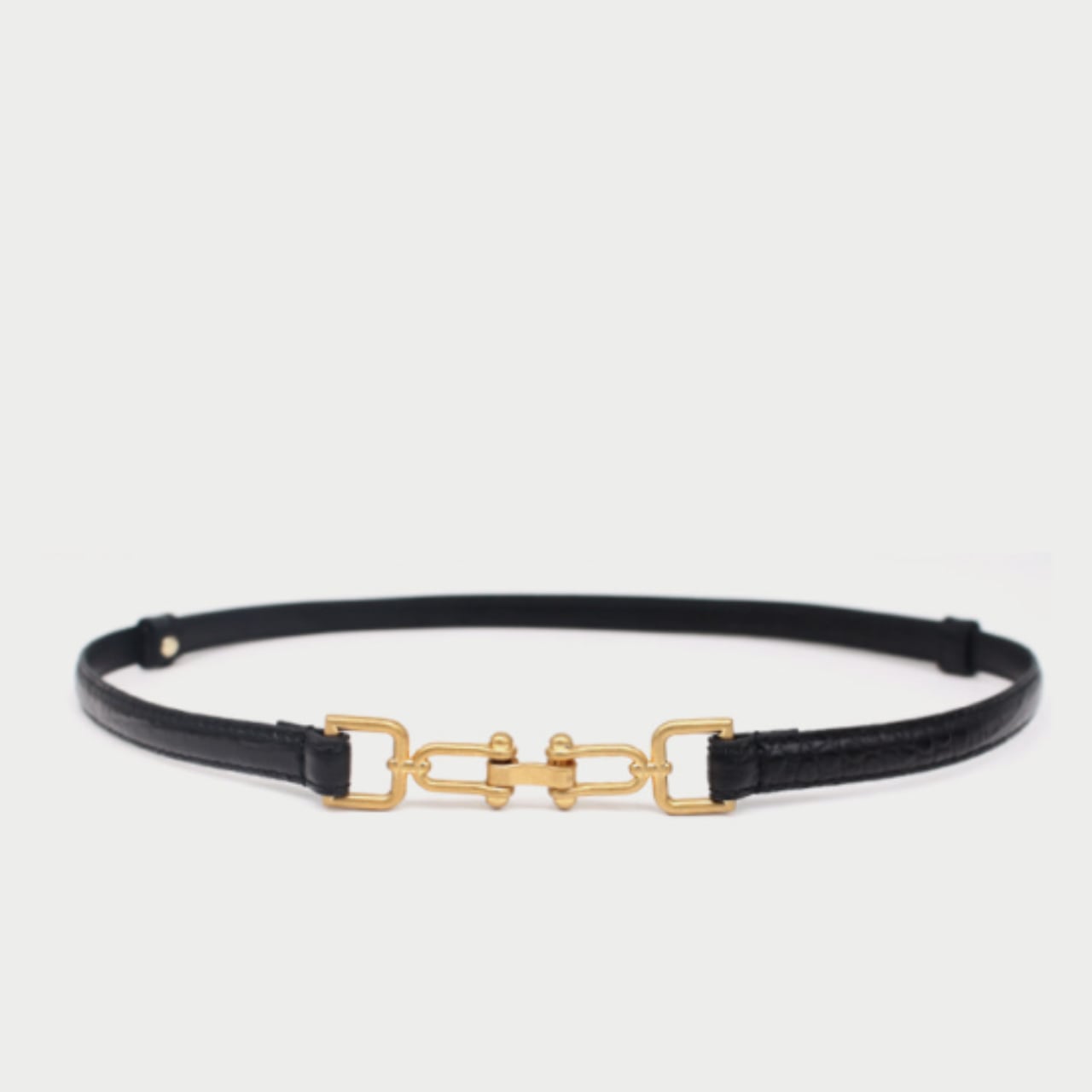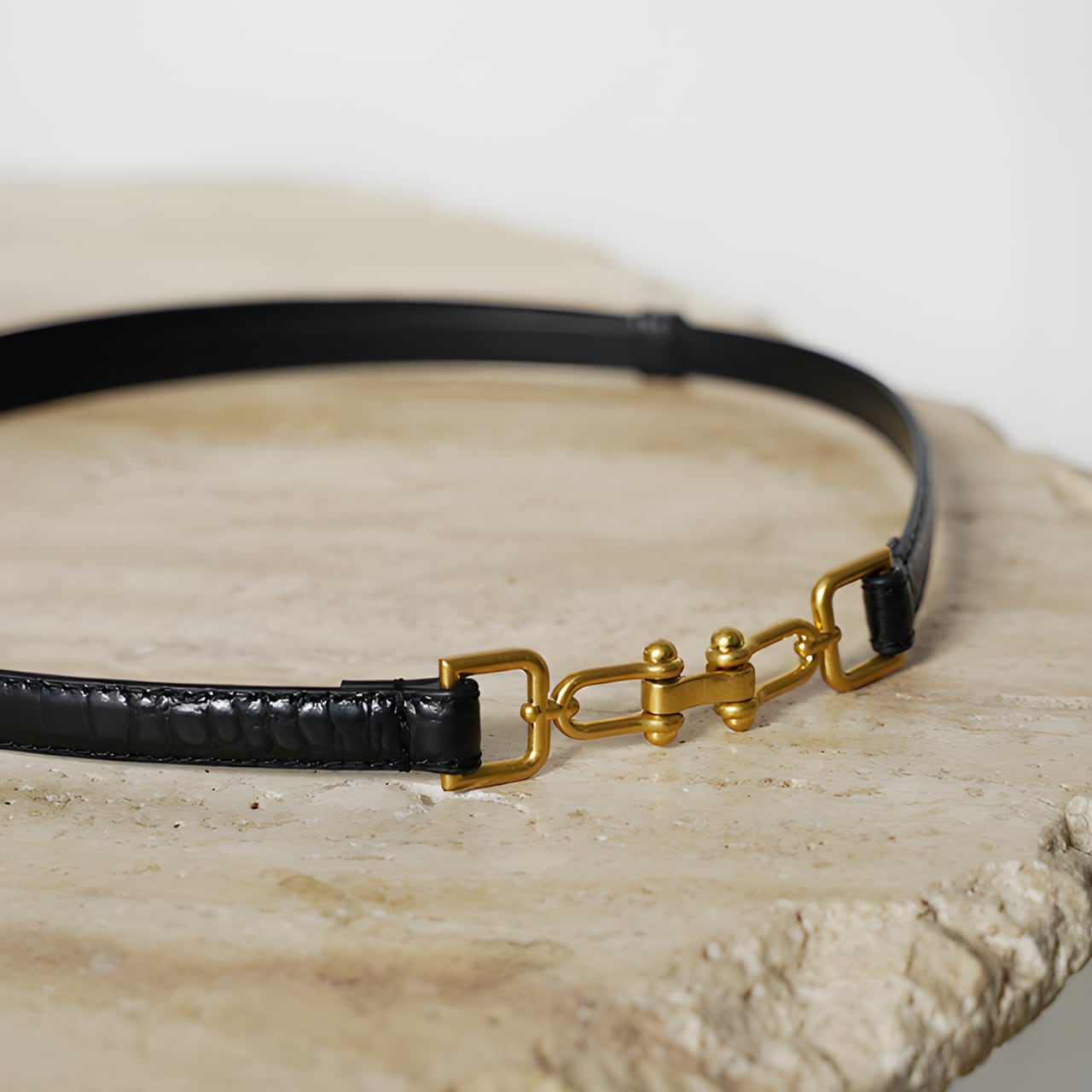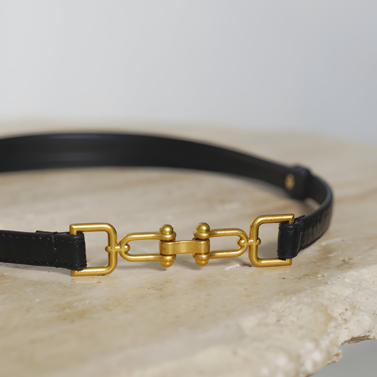 中央に配された金具が静かに光を受け、黒のラインにさりげない輪郭を生むベルト。