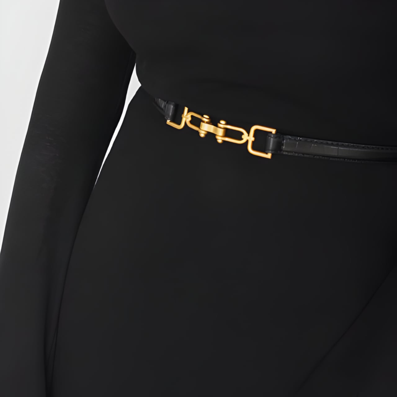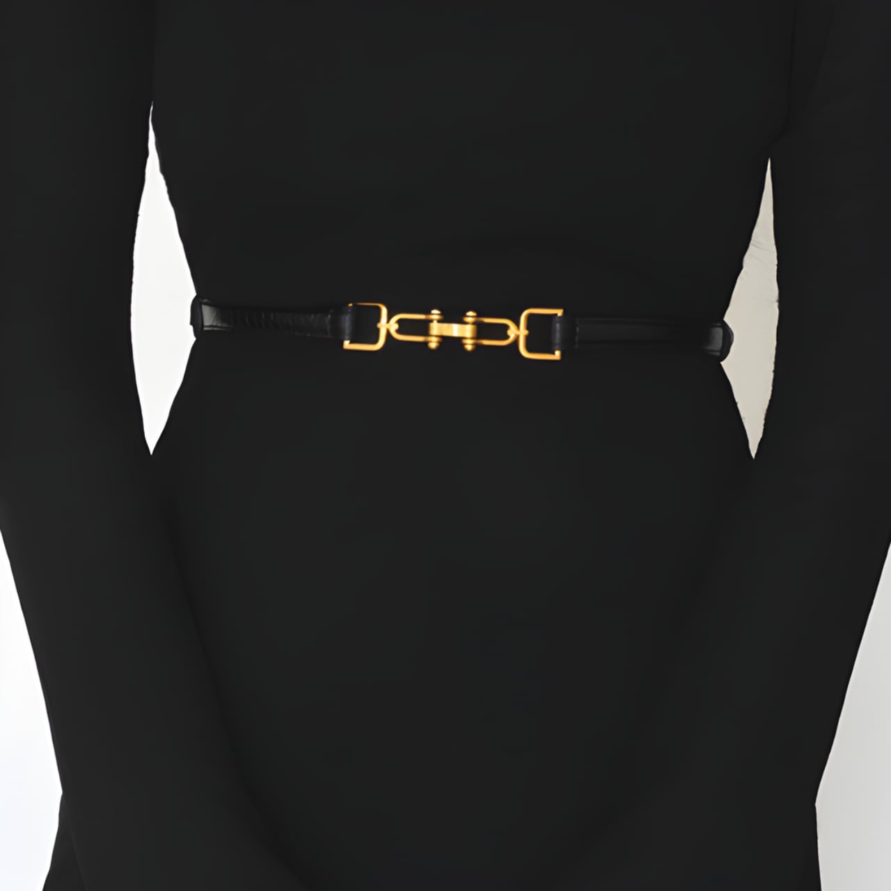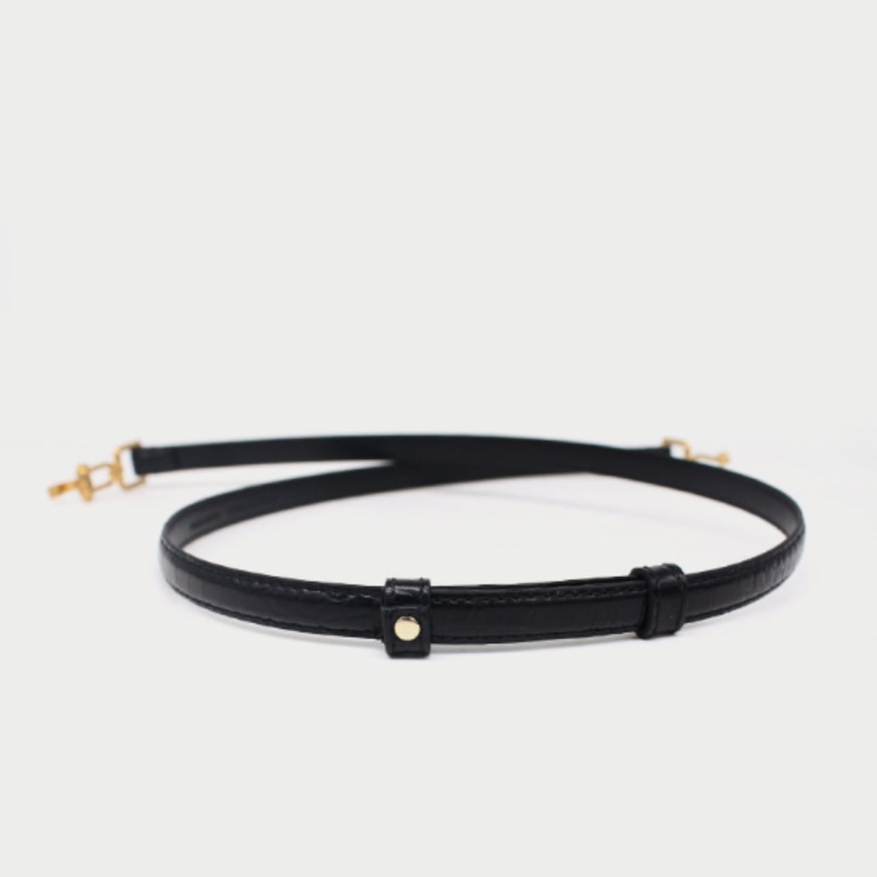 中央に配された金具が静かに光を受け、黒のラインにさりげない輪郭を生むベルト。