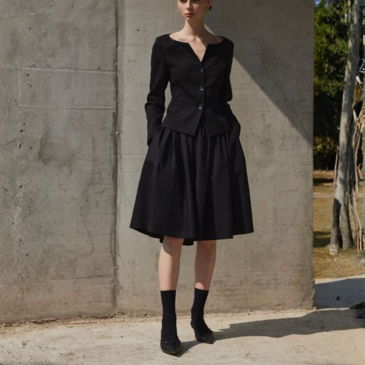 ウエストにかけてほんの少しだけ内側へ入るラインは、身体の自然な曲線に沿いながら、クラシカルなテーラリングの美しさをさりげなく引き出します。