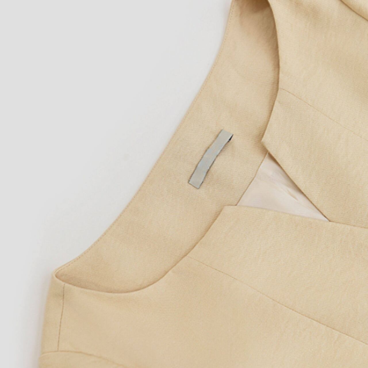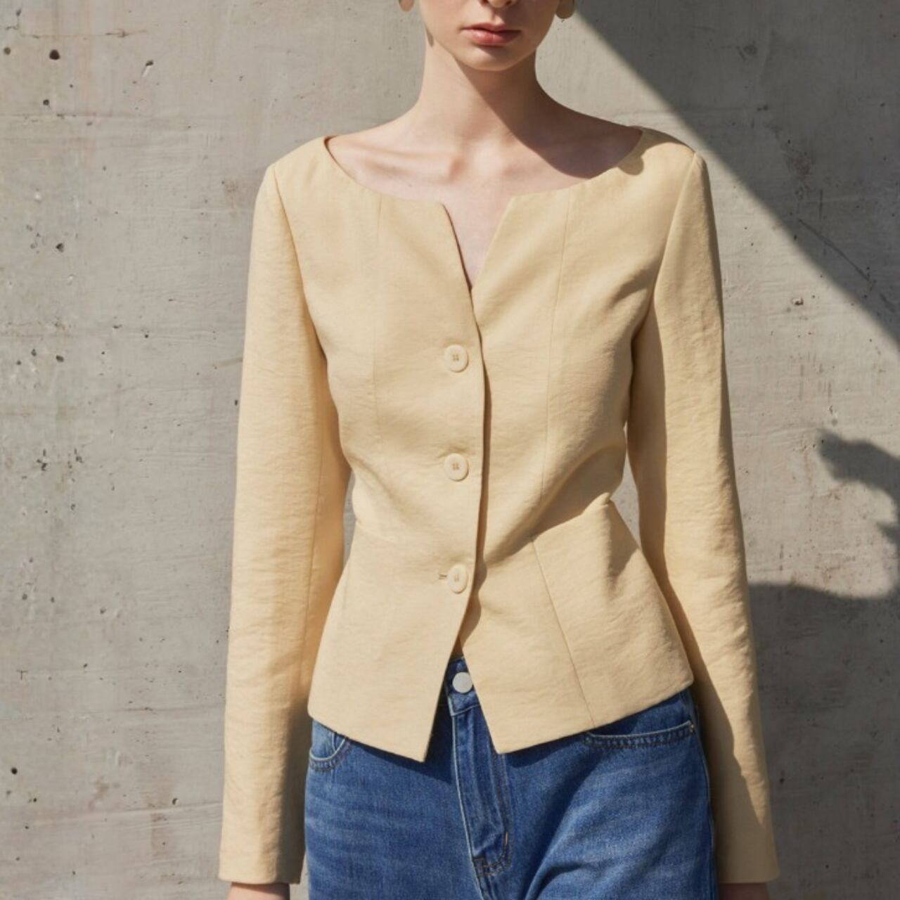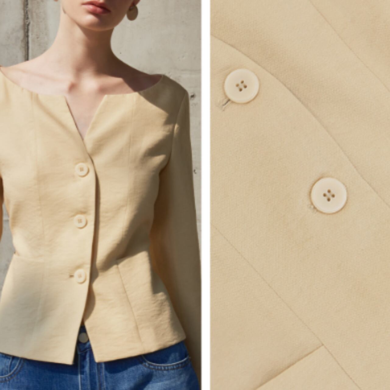 襟元に施されたわずかなカットが、首まわりに軽さを生み、構築的でありながらも、硬さに偏らない柔らかな輪郭をつくります。