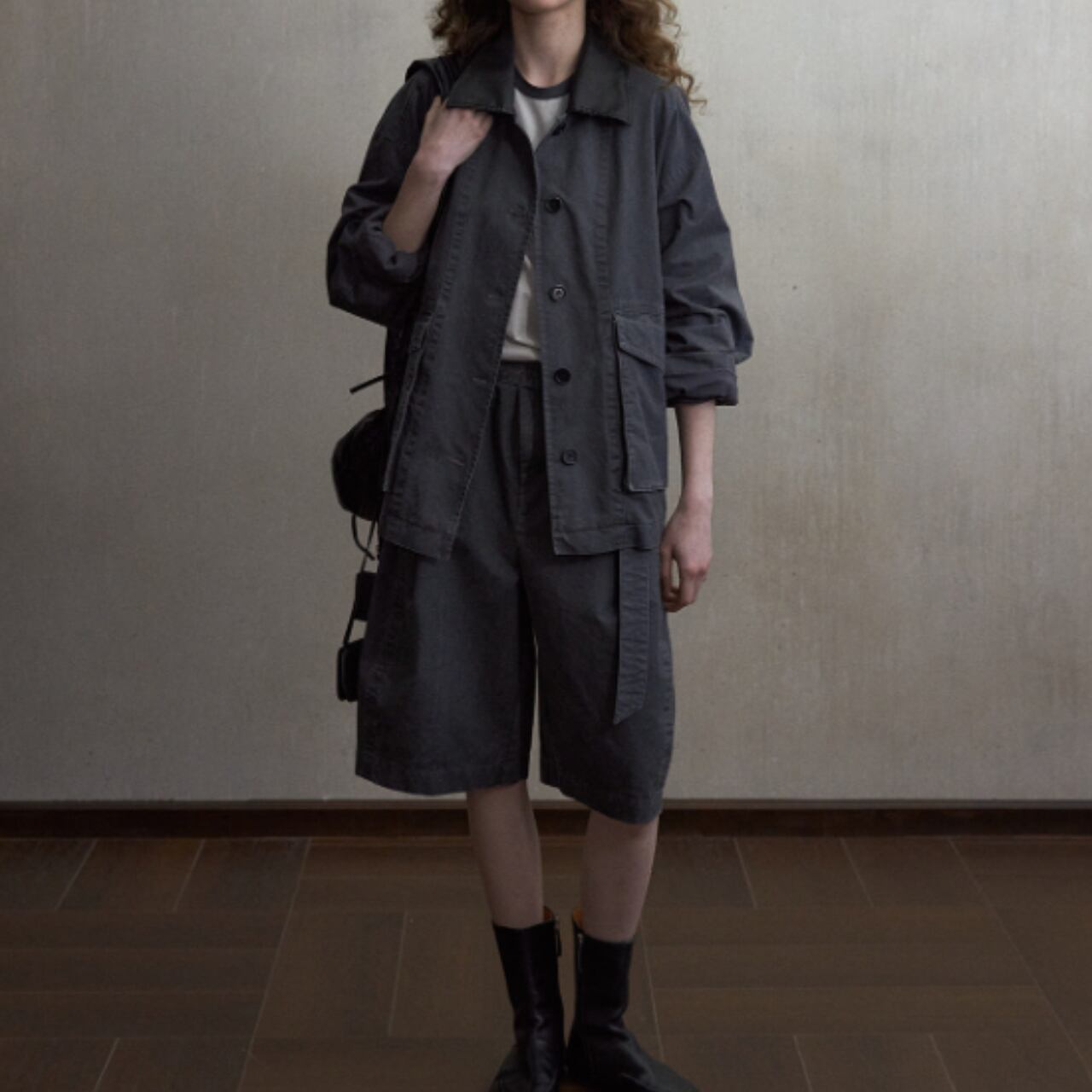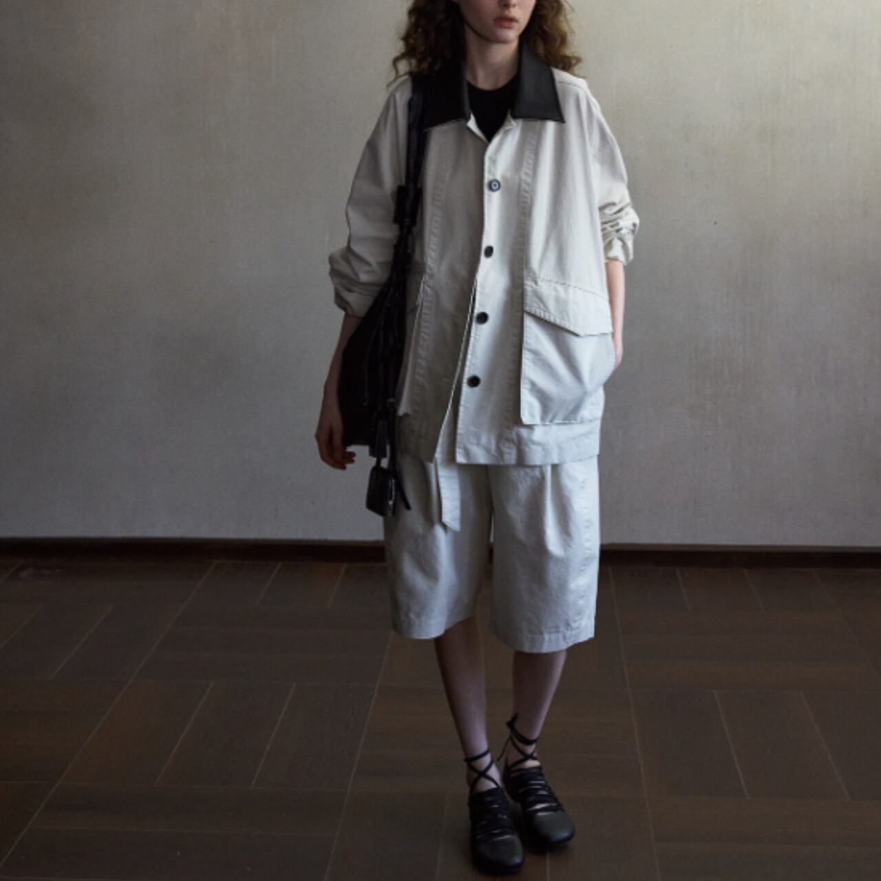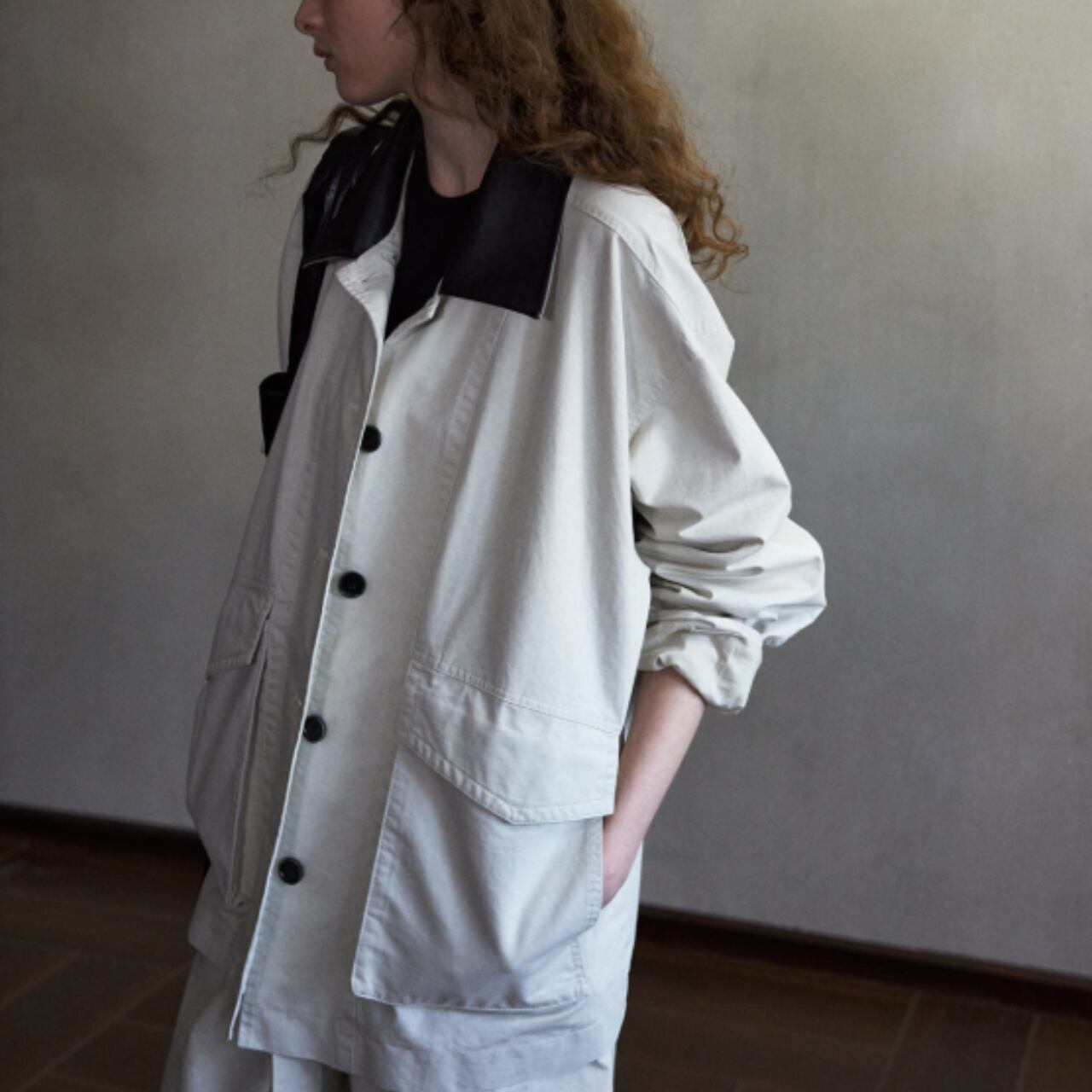 ワークジャケットの構造をベースにしながら、無骨さは抑えられ、クラシカルなブラウスやシアー素材とも自然に調和します。