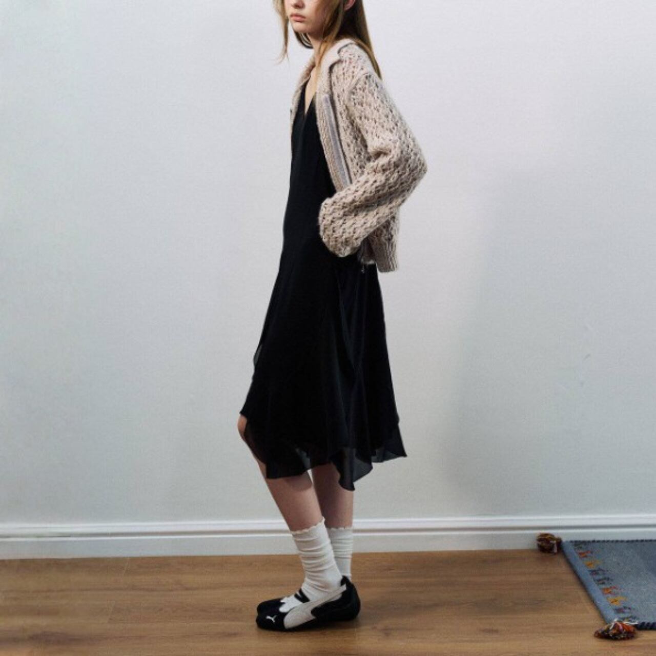 ボトムは軽さのあるサテンやレース、落ち感のあるスカートとも相性がよく、質感の差がはっきりと出ます。