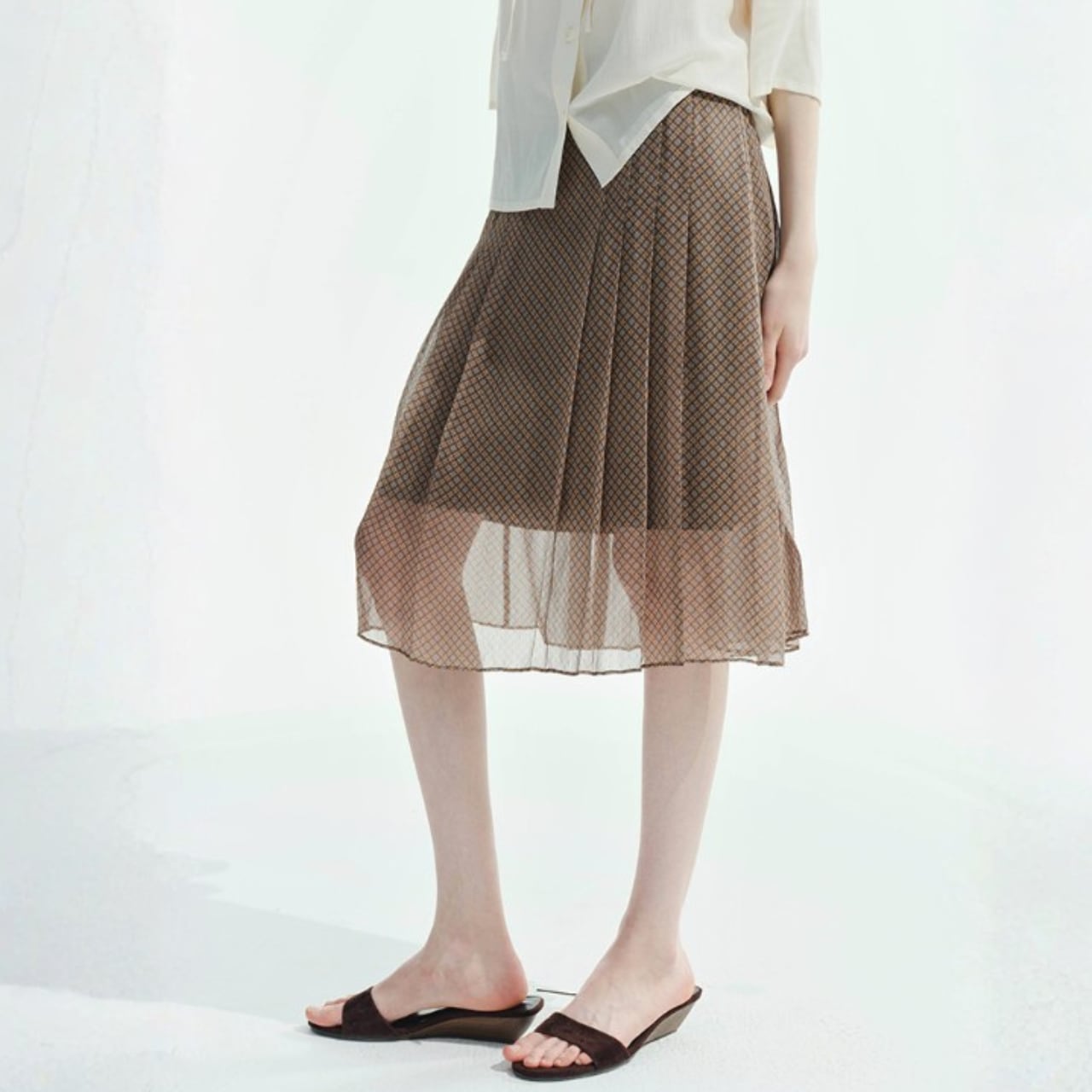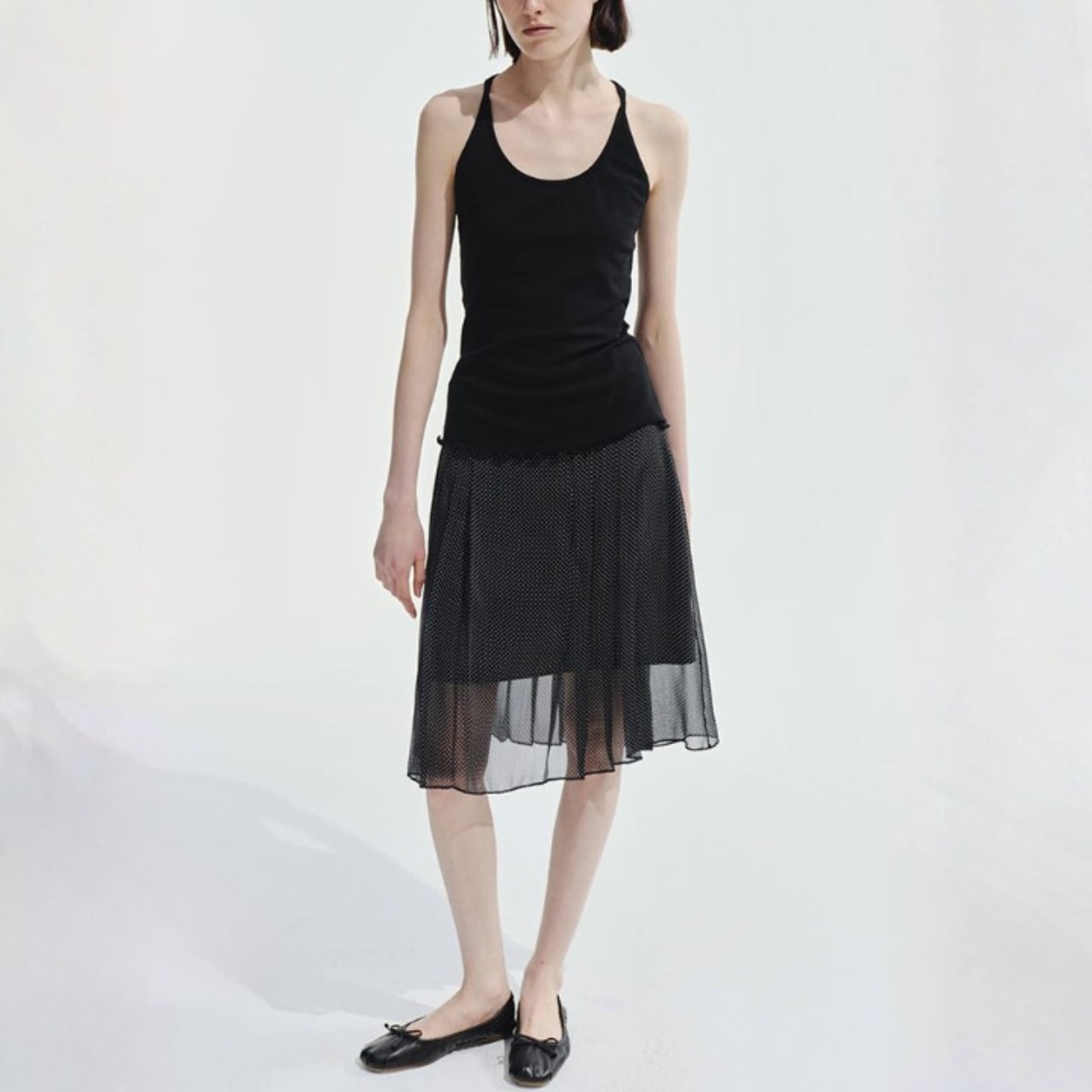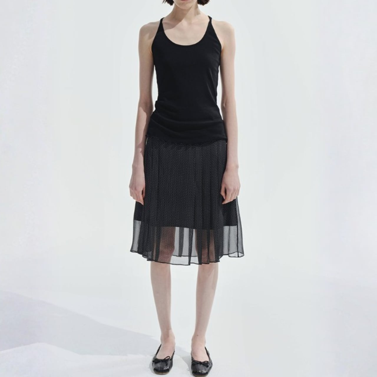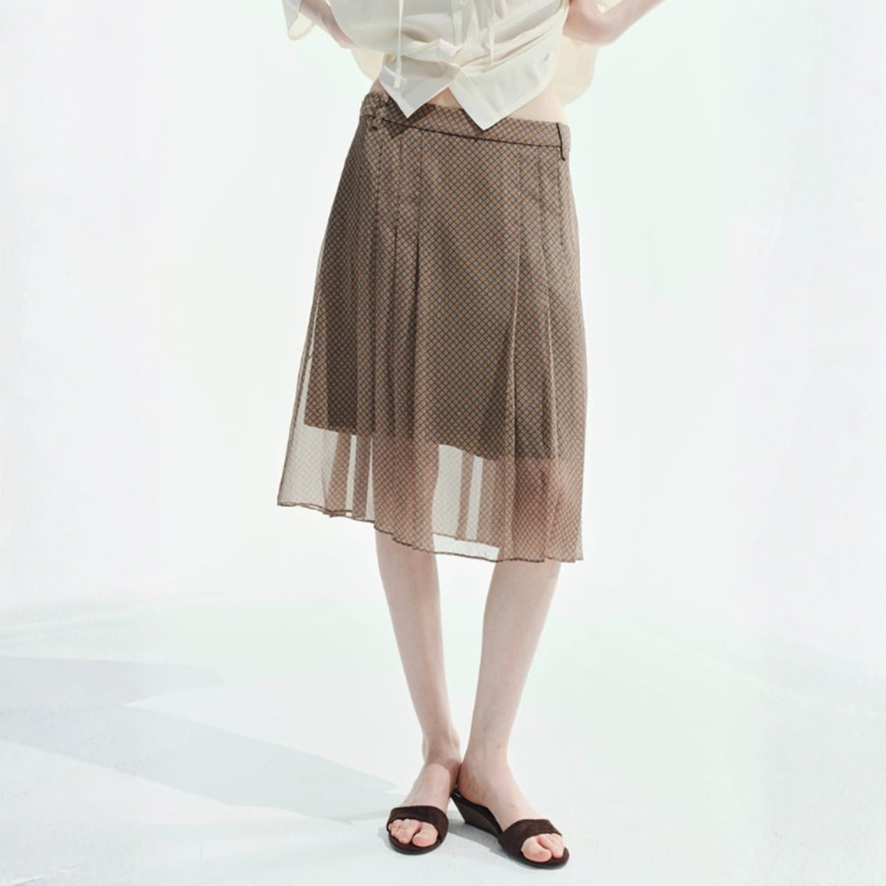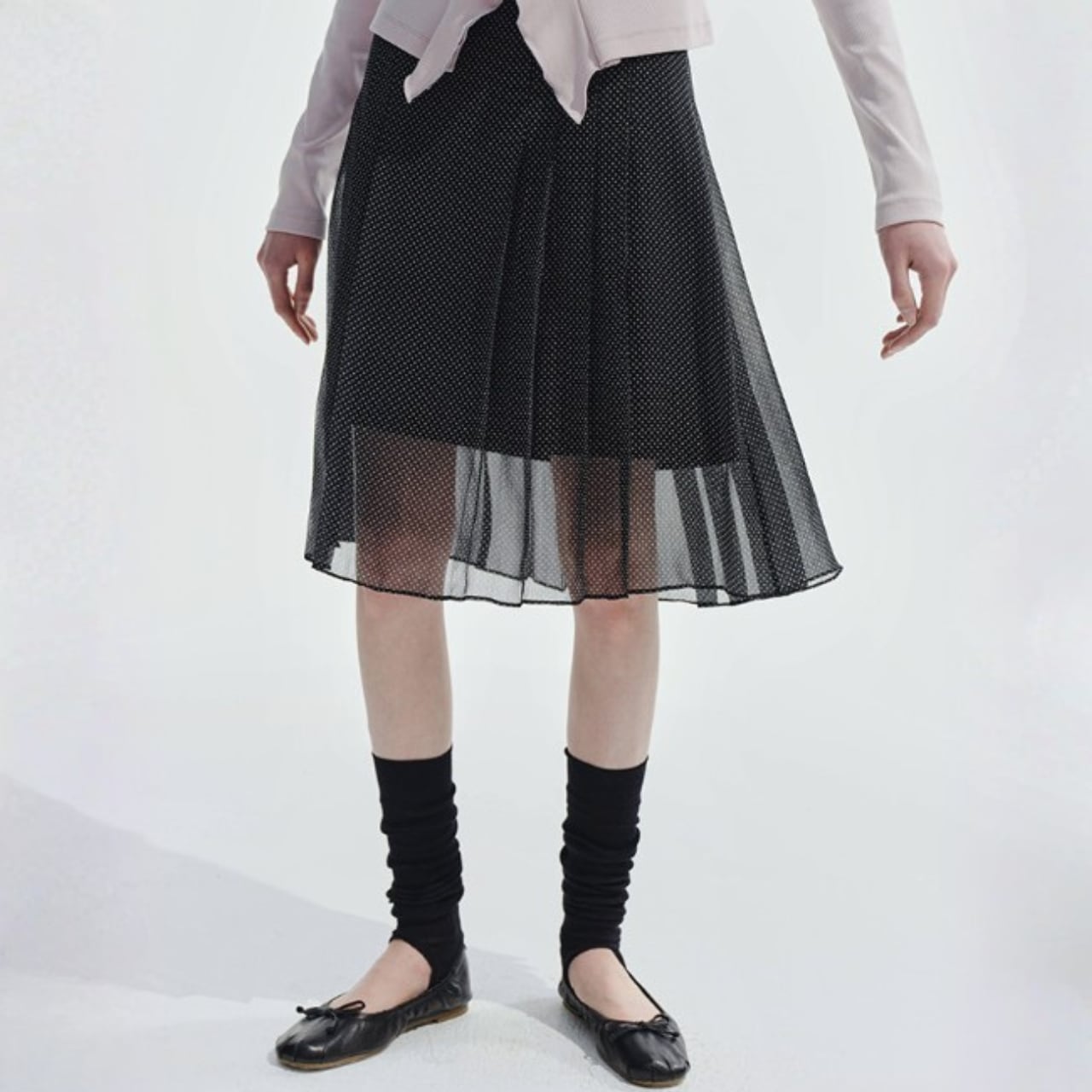 縦に入ったプリーツのチュールを重ねたミディ丈スカート。