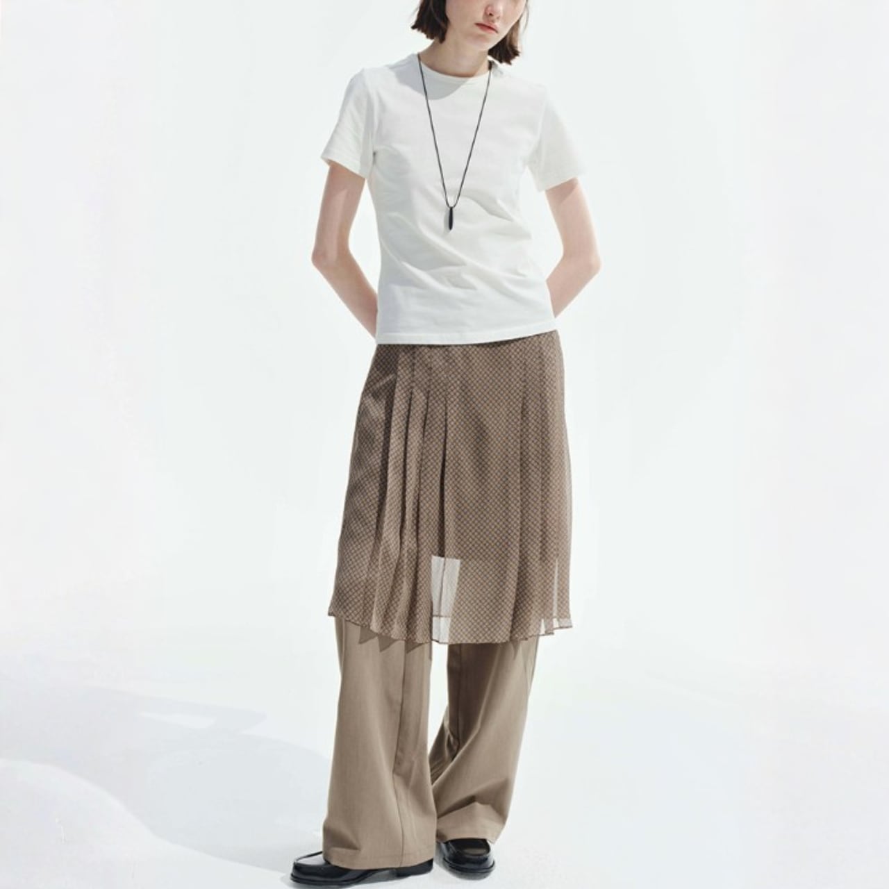 ニットやシャツとも合わせやすく、足元はフラットでもヒールでも対応可能。