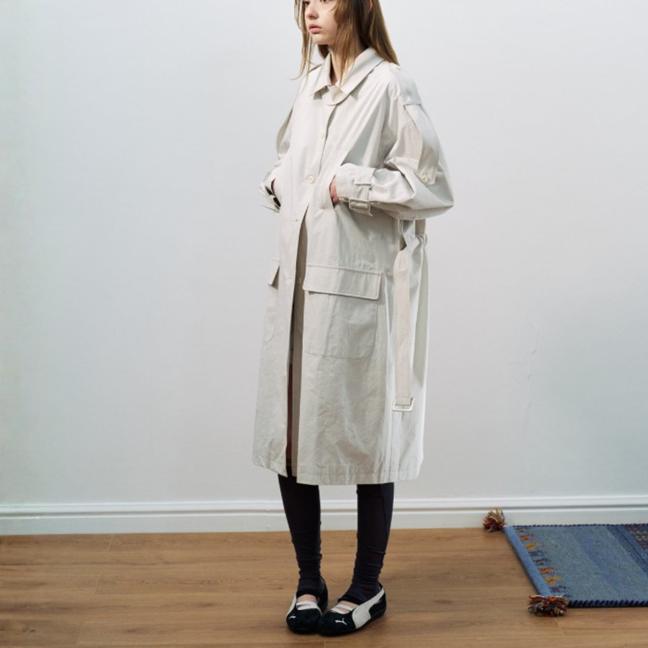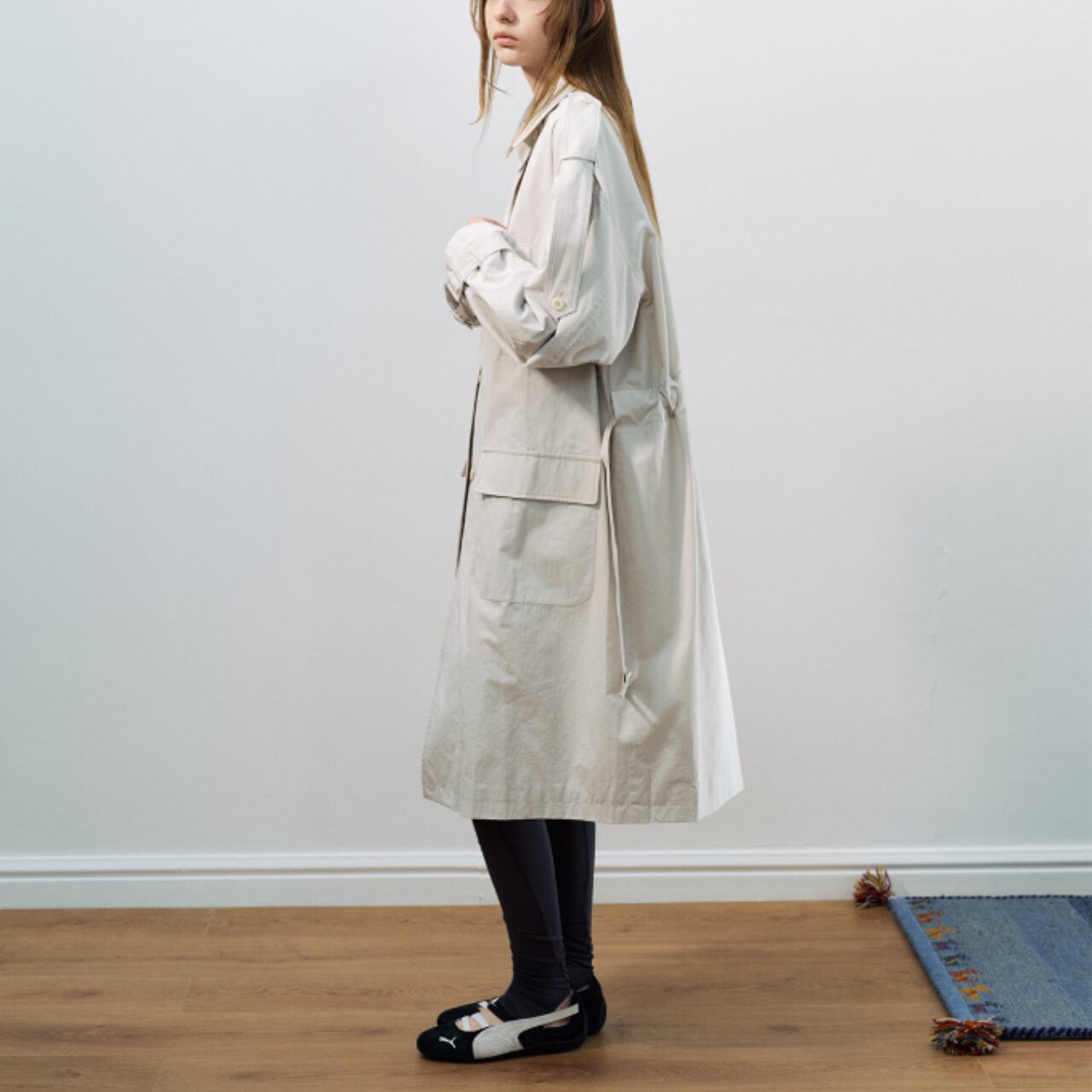 ベルトで整え、背面のドローストリングでさりげなく立体感を。
