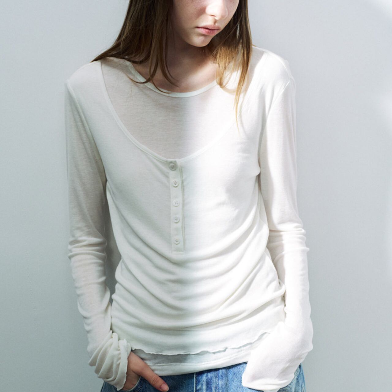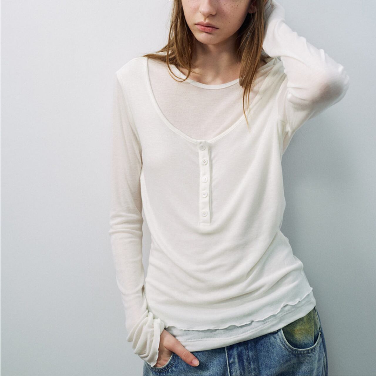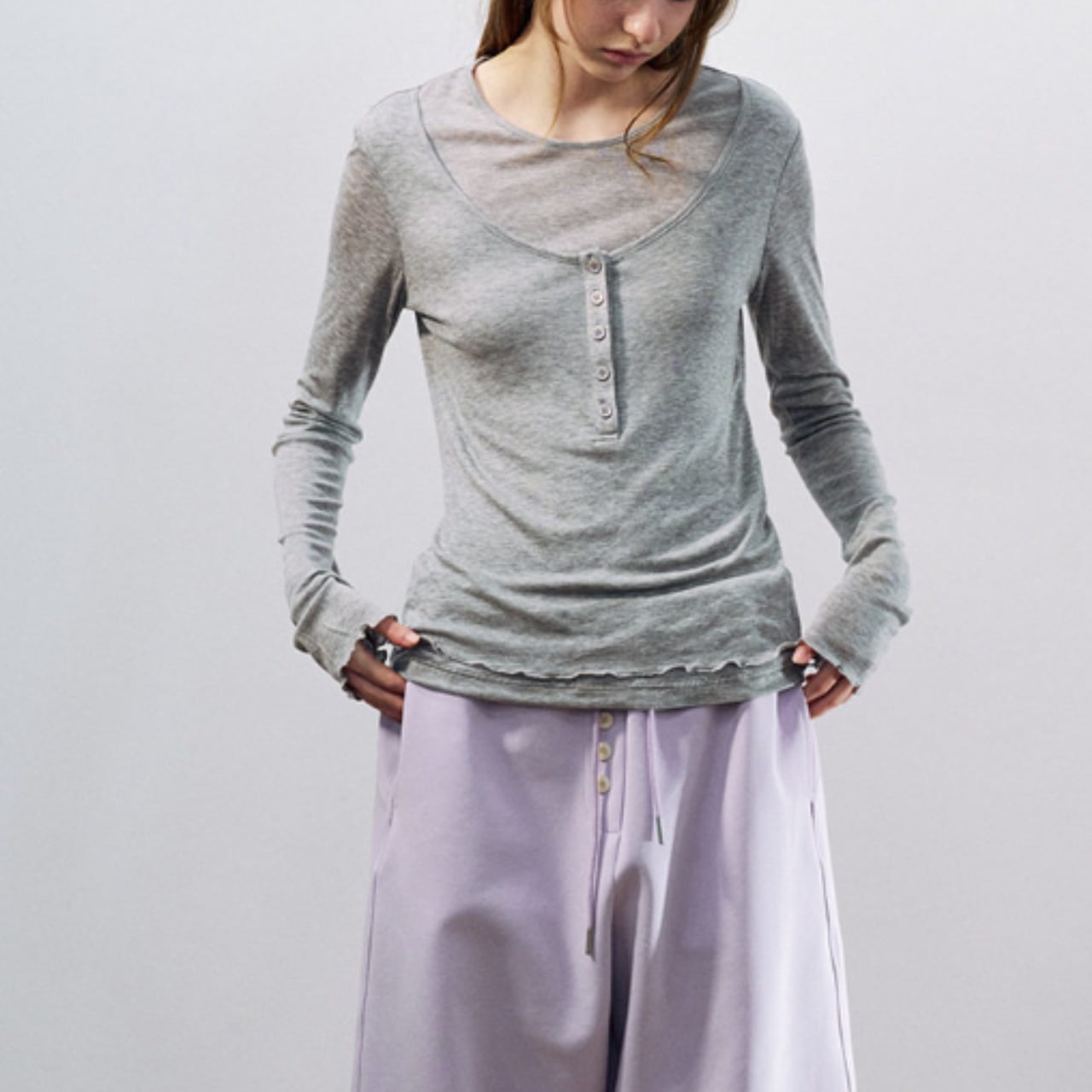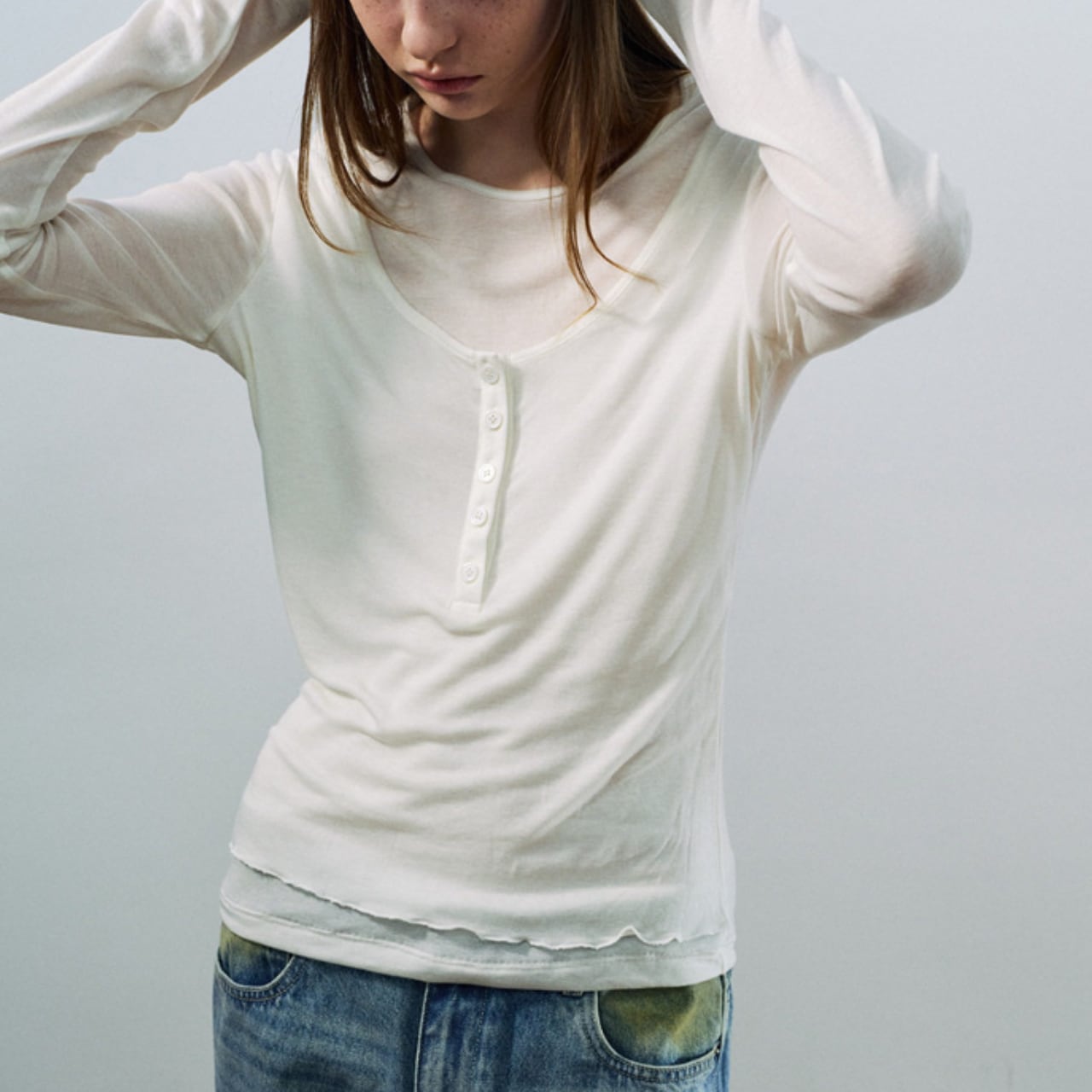 ネックラインはレイヤードのように見える設計で、ヘンリーボタンと重なり、さりげないデザイン性をプラス。