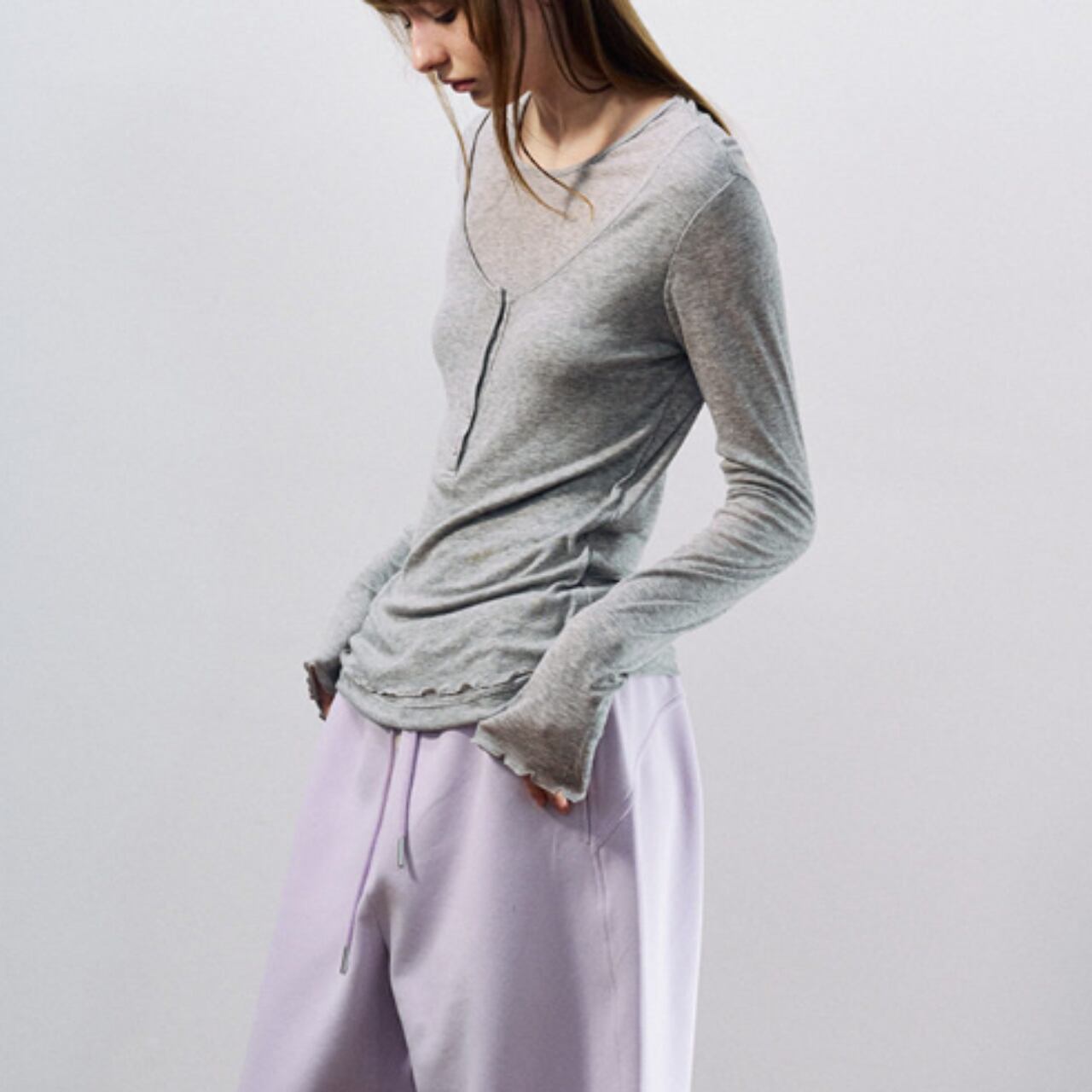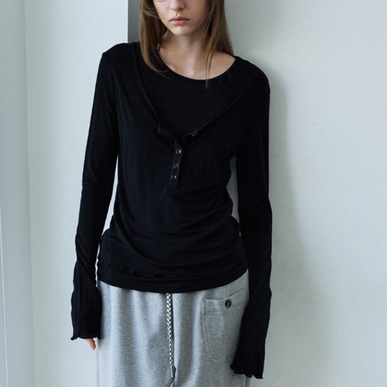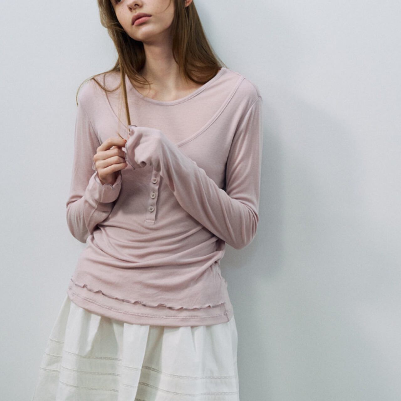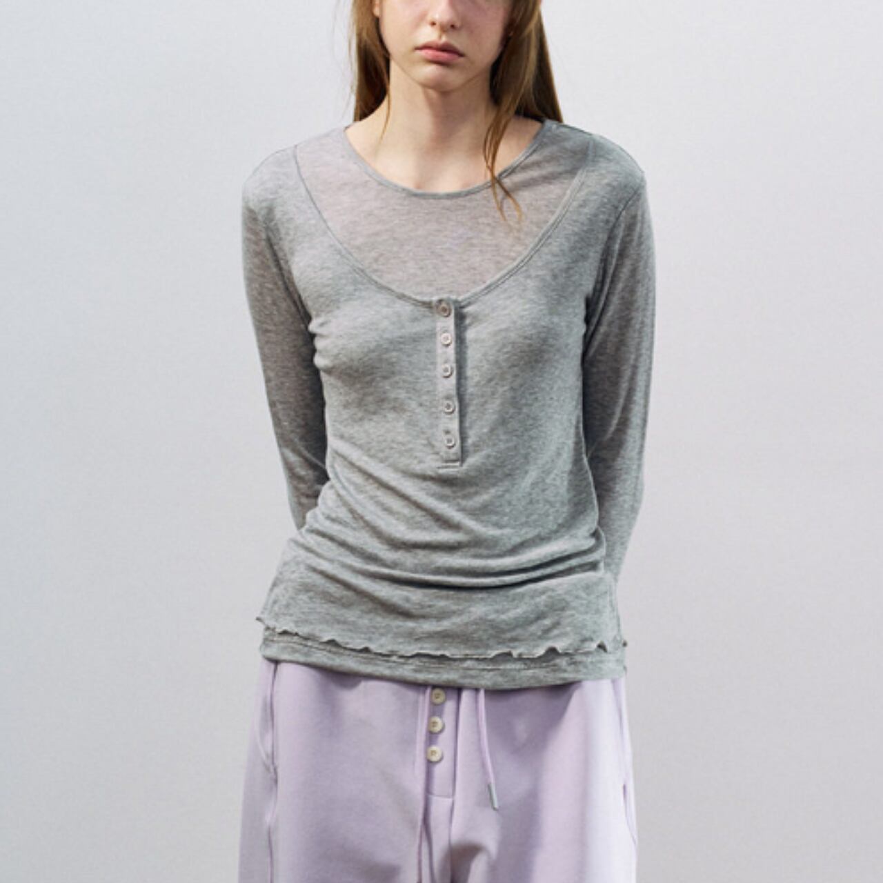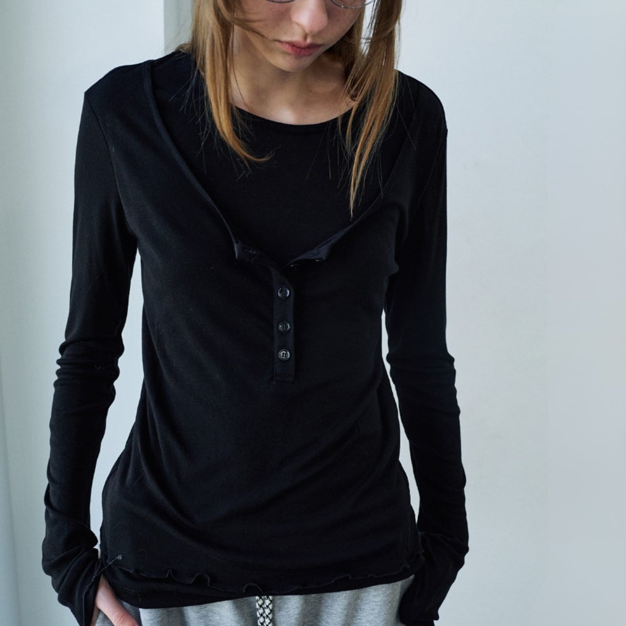 ネックラインはレイヤードのように見える設計で、ヘンリーボタンと重なり、さりげないデザイン性をプラス。