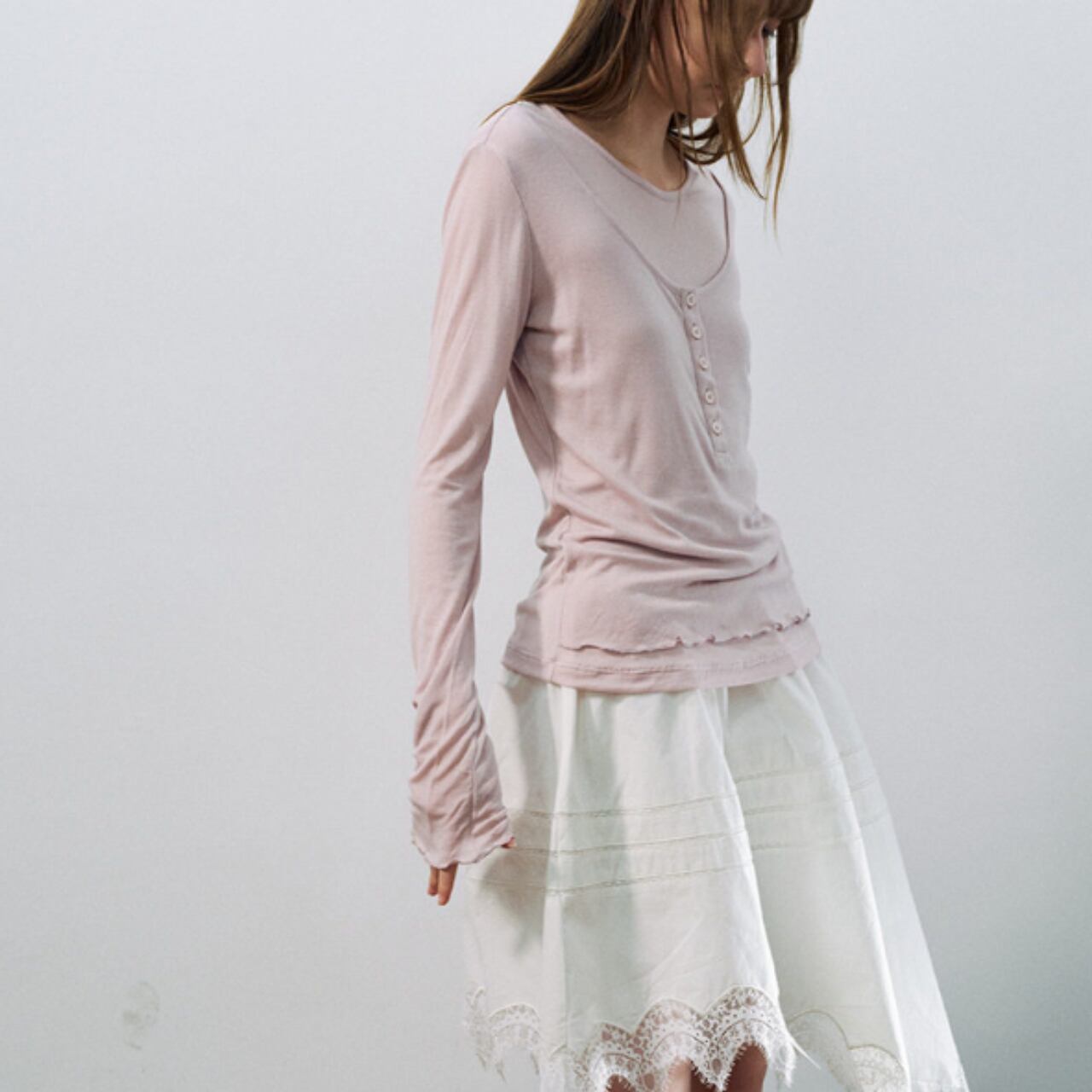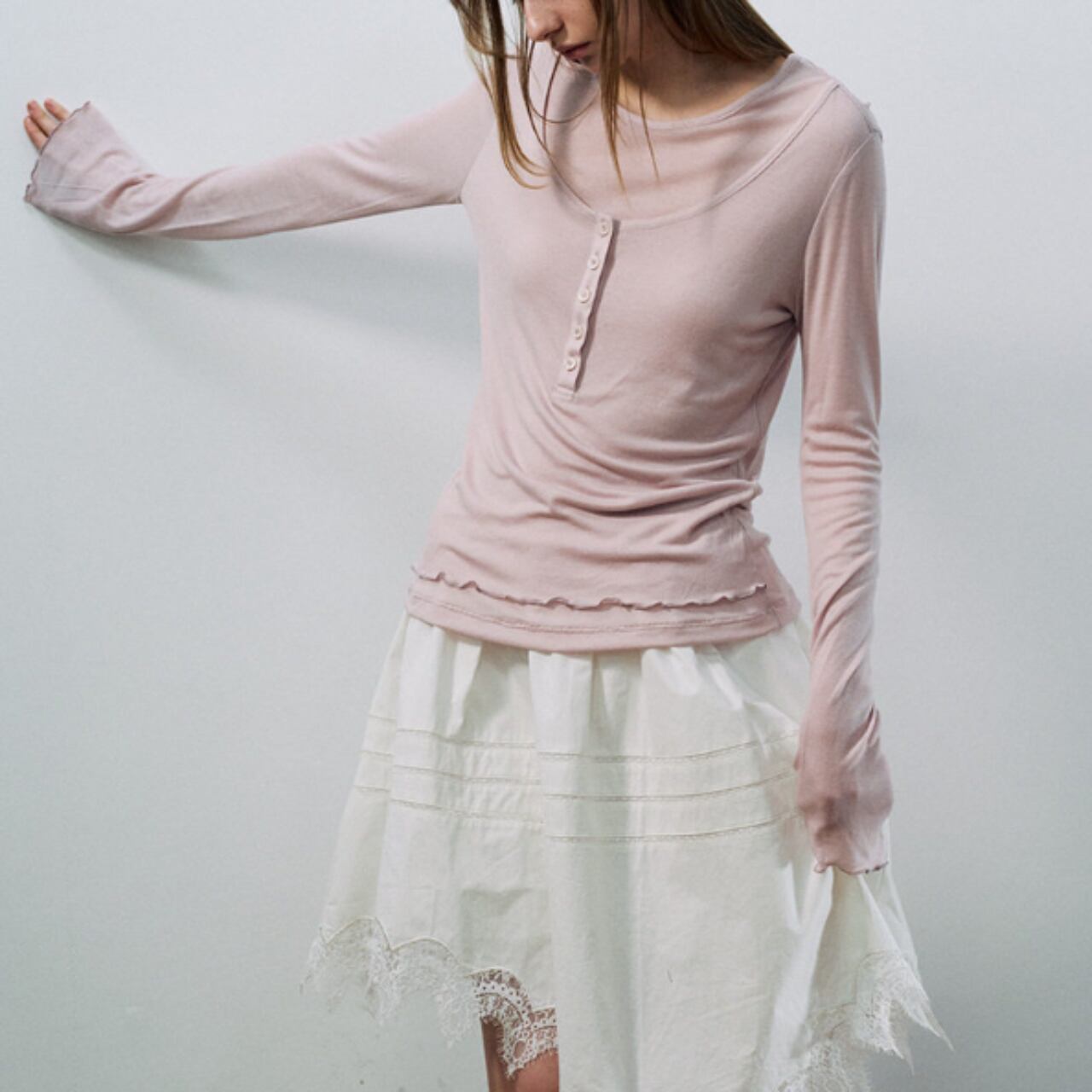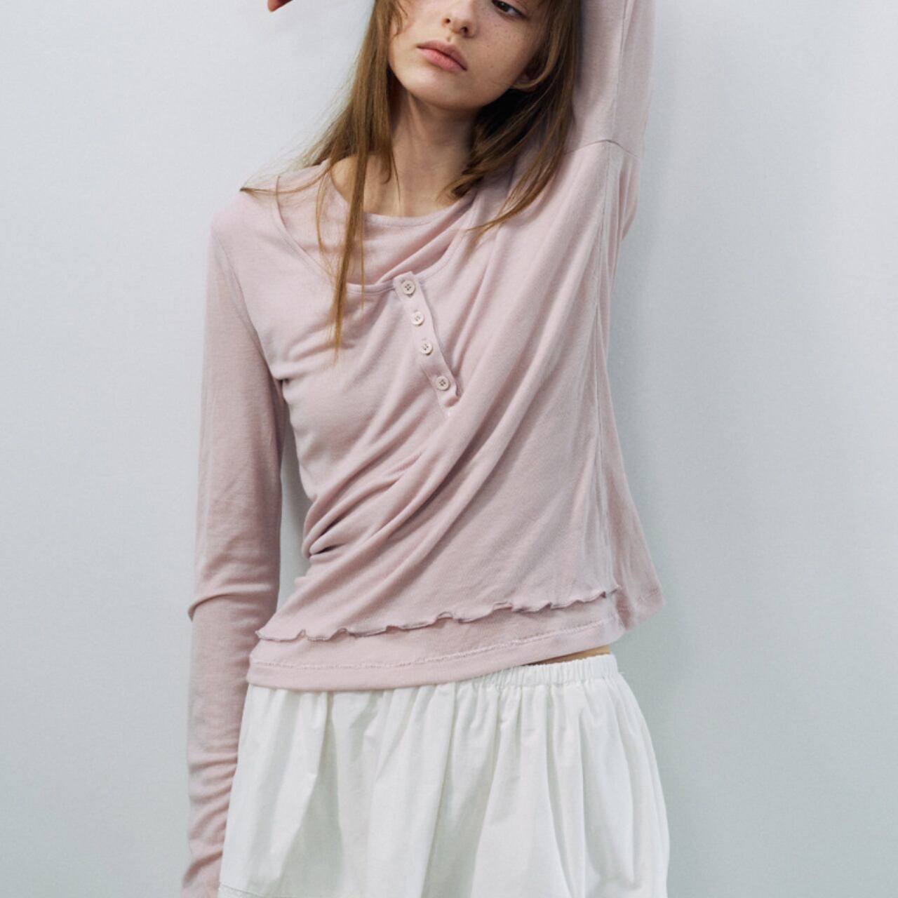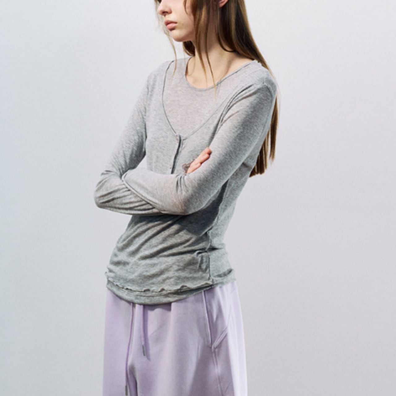 ネックラインはレイヤードのように見える設計で、ヘンリーボタンと重なり、さりげないデザイン性をプラス。