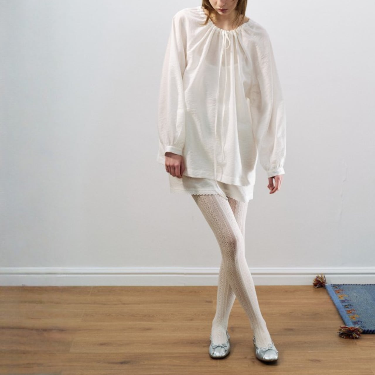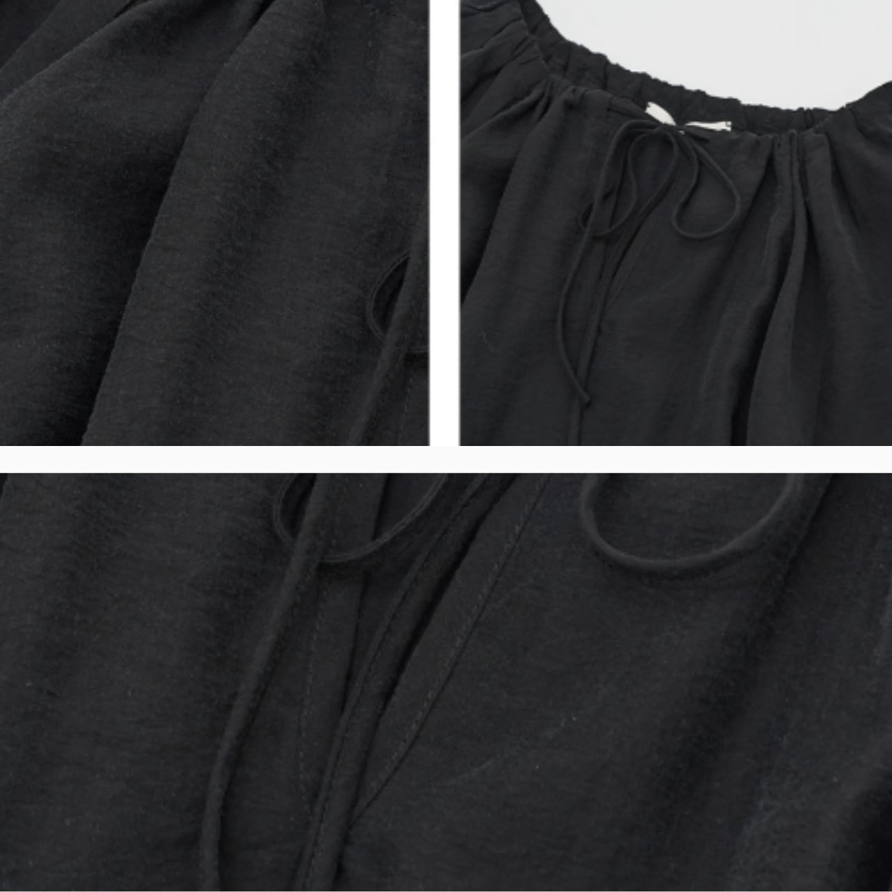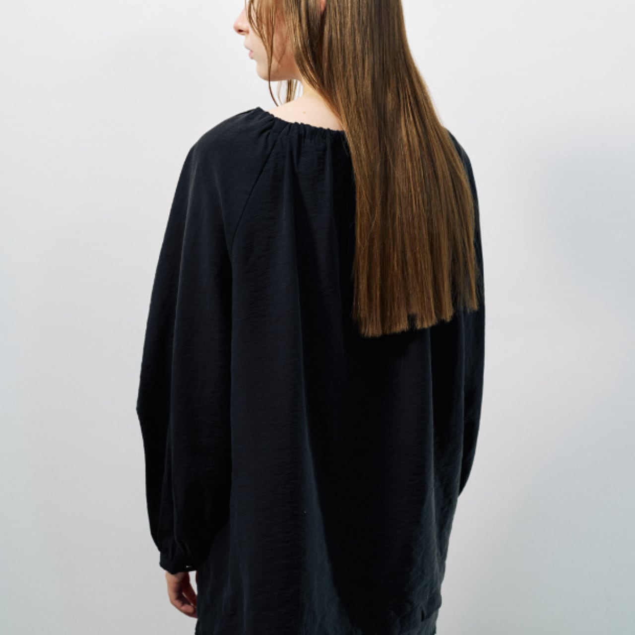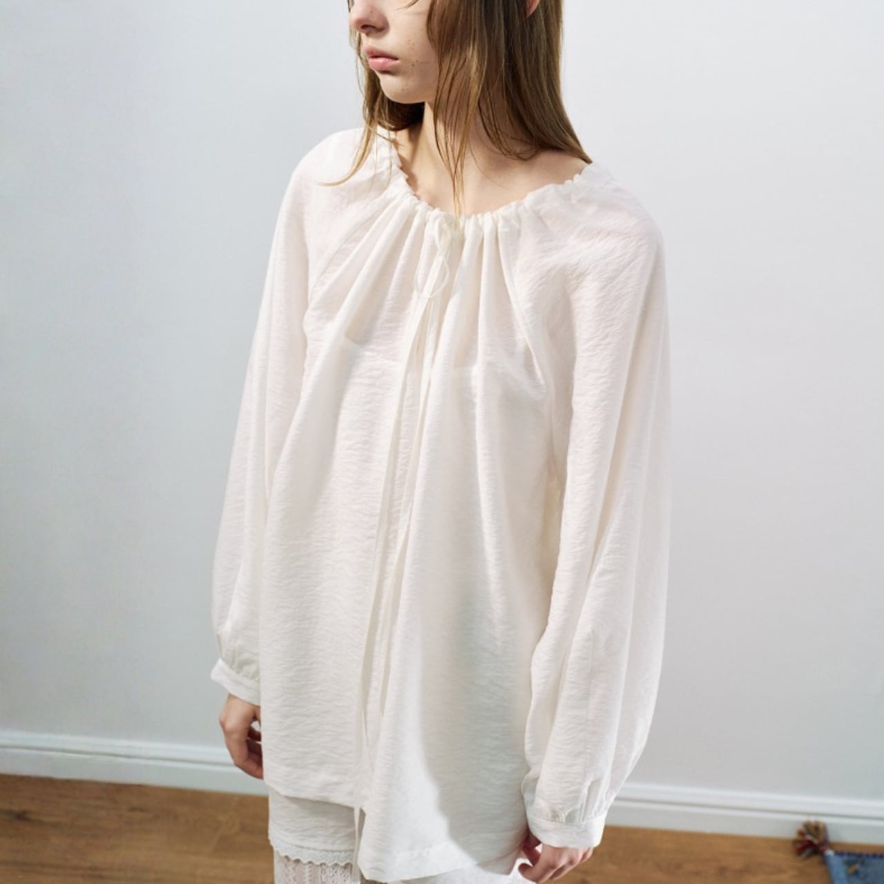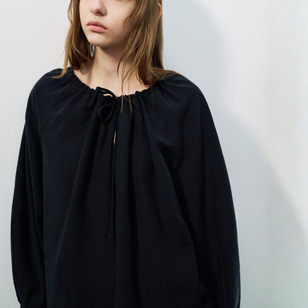 首元のドローストリングでギャザーを寄せ、やわらかなシルエットが生まれます。