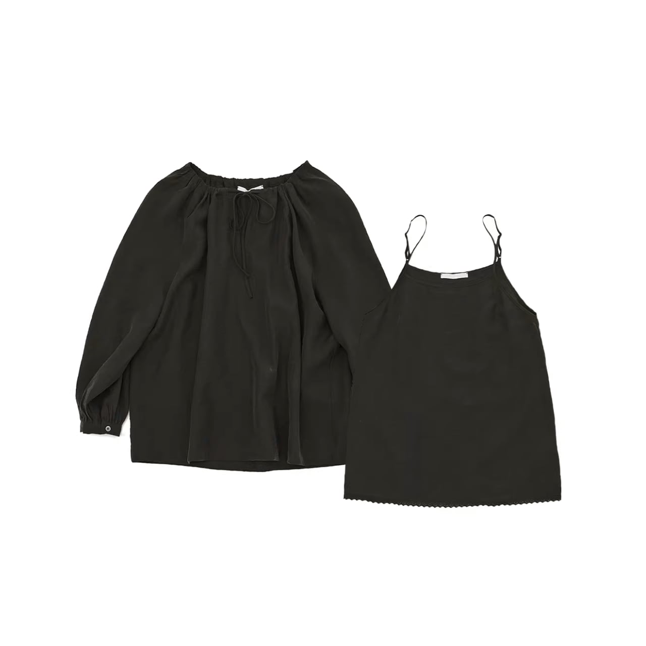 軽くやわらかなブラウスに、レーストリムのミニキャミドレスを重ねたレイヤードデザイン。