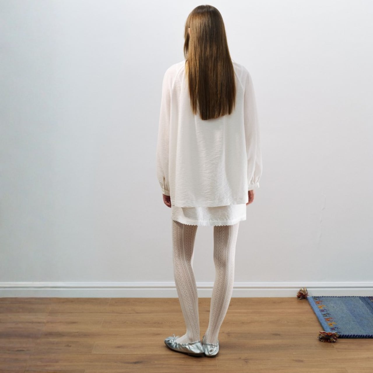 ブラウスの裾からさりげなくレースがのぞき、軽やかな雰囲気をつくります。
