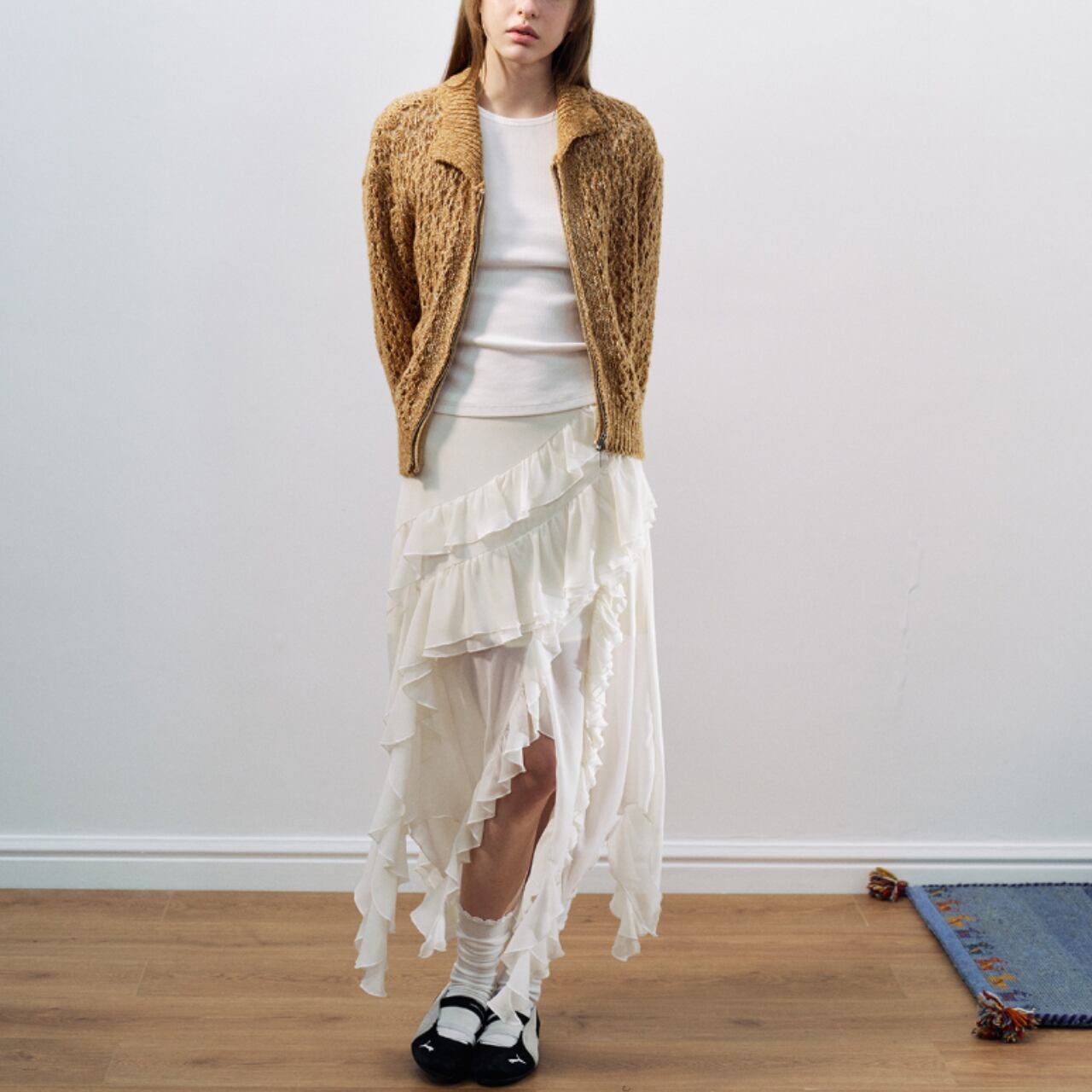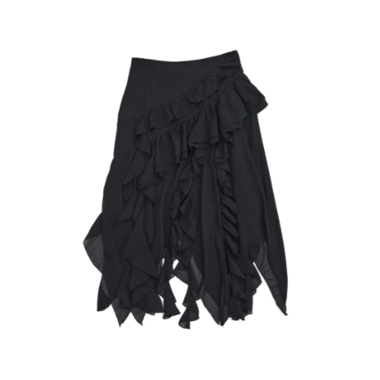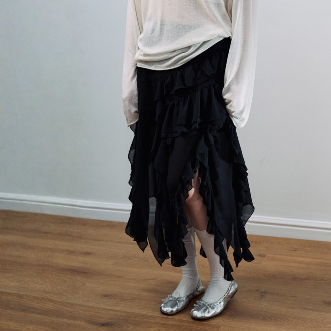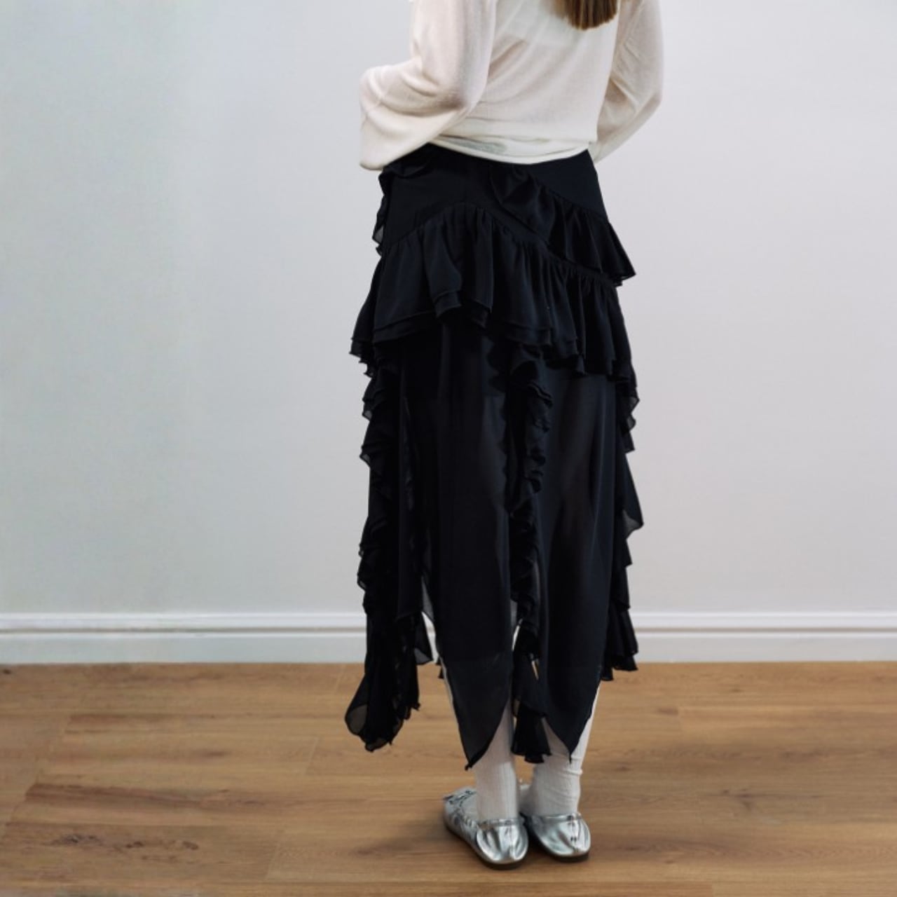 軽やかなシフォンが重なり合い、歩くたびに揺れるフリルのミディスカート。