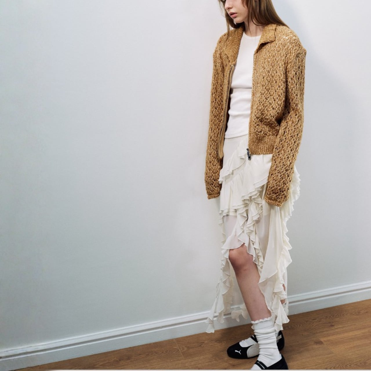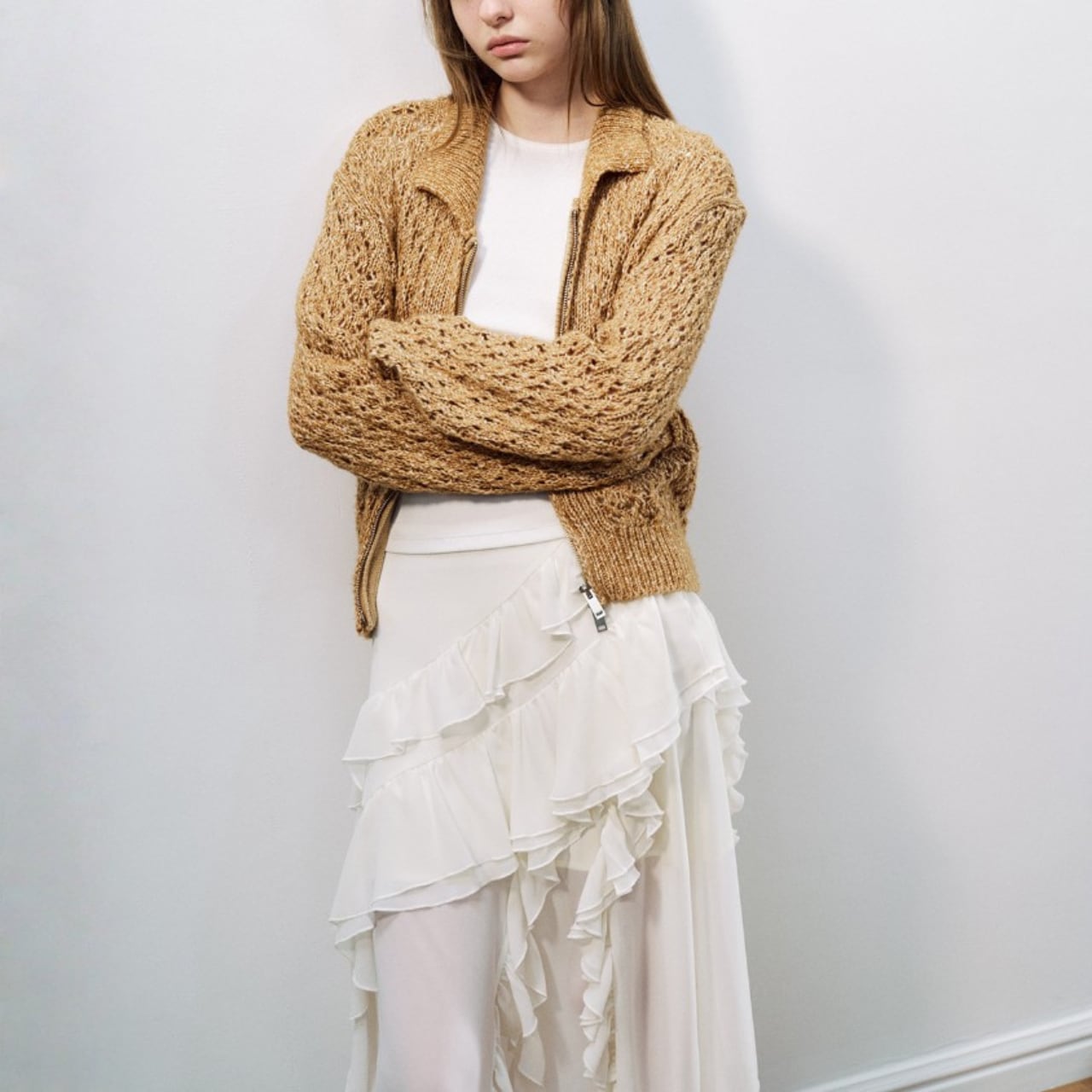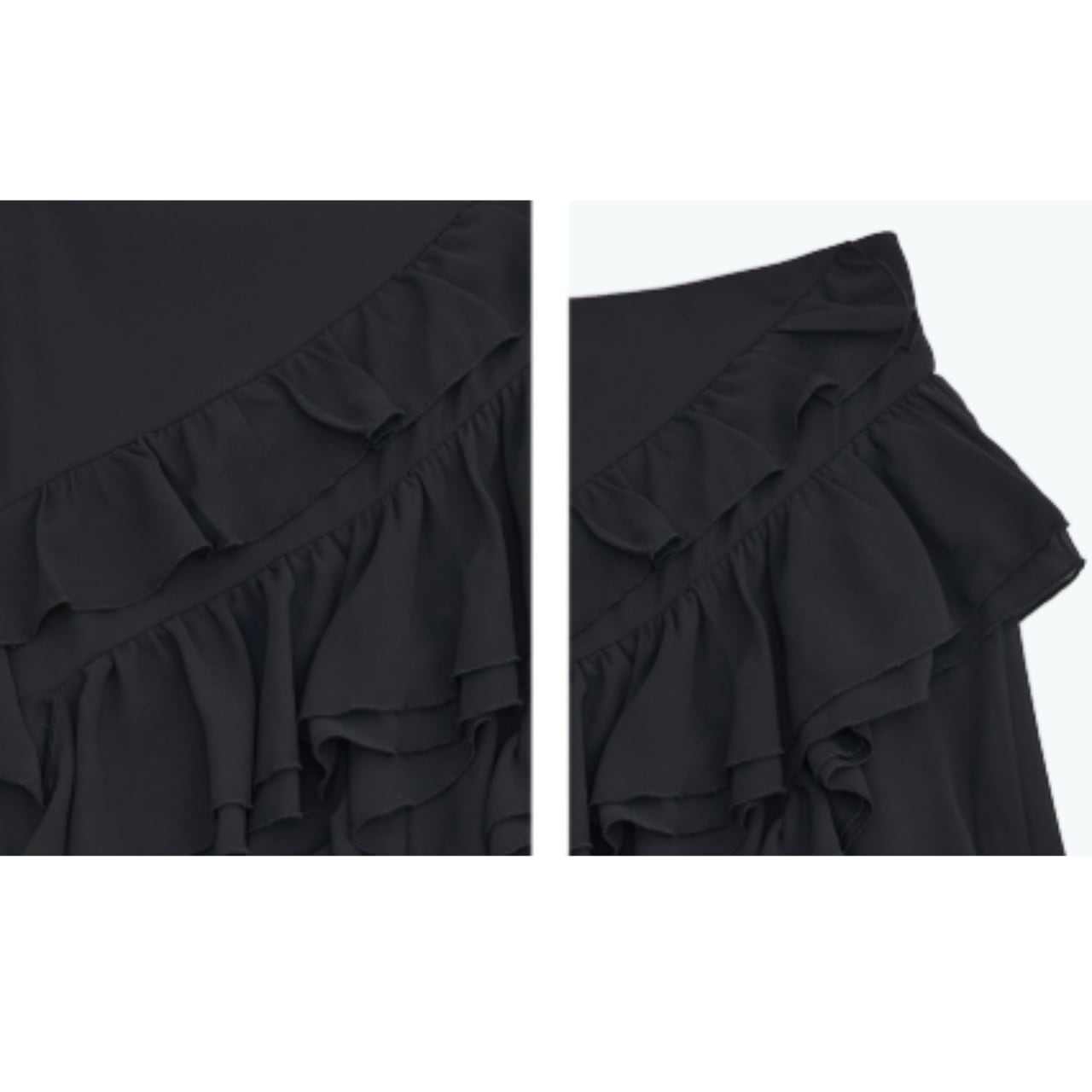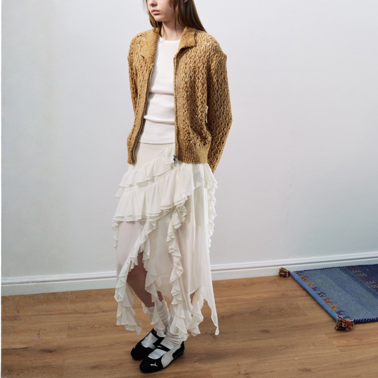 軽やかなシフォンが重なり合い、歩くたびに揺れるフリルのミディスカート。