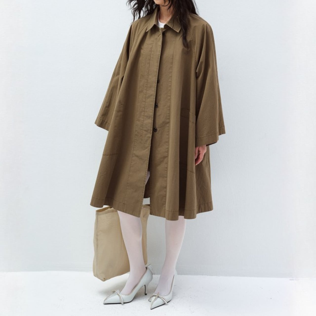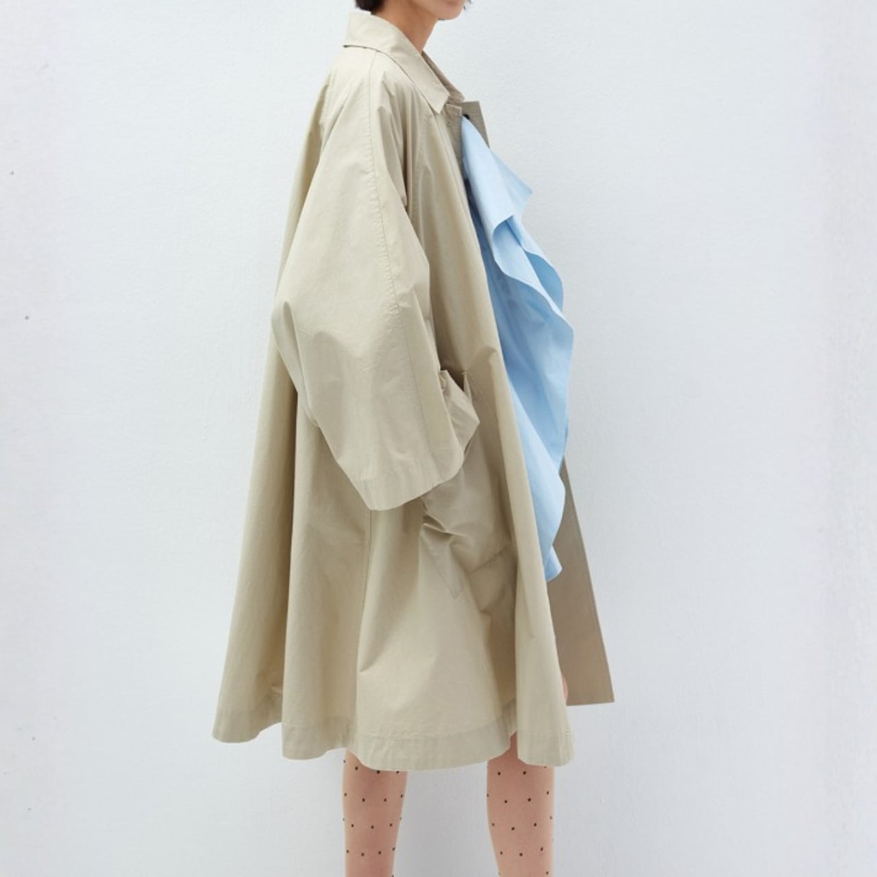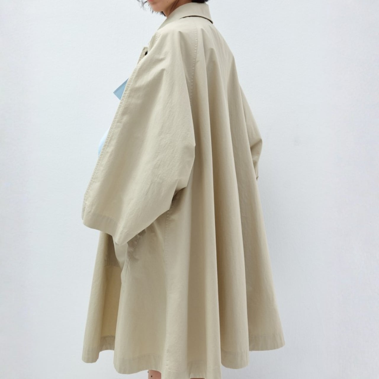 布をたっぷりと使ったAラインシルエットが、歩くたびに静かに広がるコート。