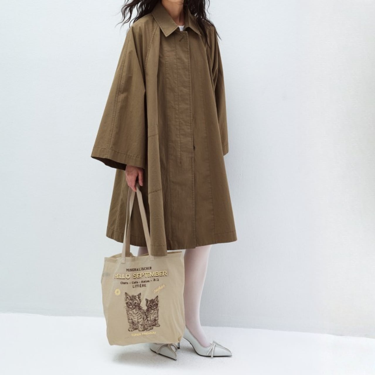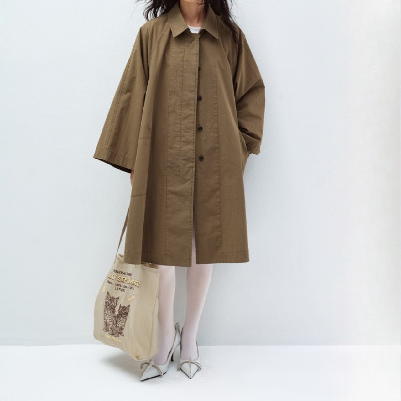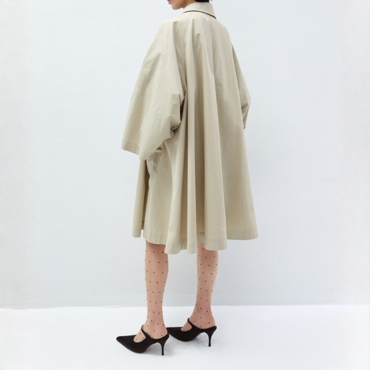布をたっぷりと使ったAラインシルエットが、歩くたびに静かに広がるコート。