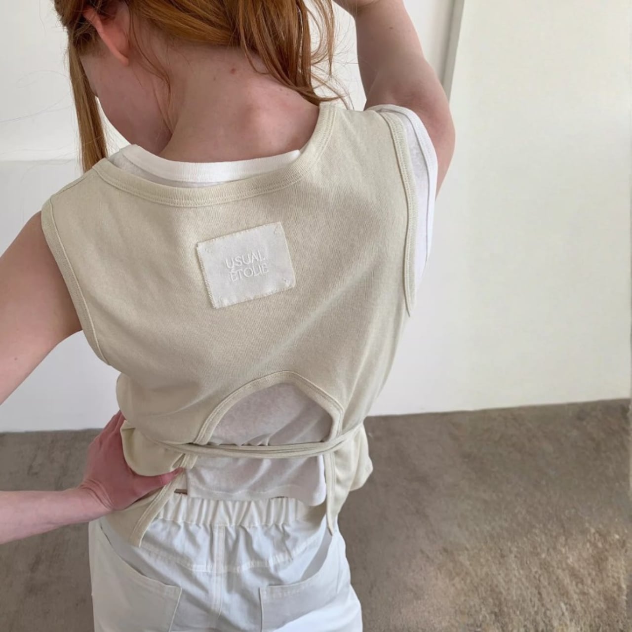 バックスタイルにアクセントが生まれる、シンプルなボトムと合わせやすい一着です。