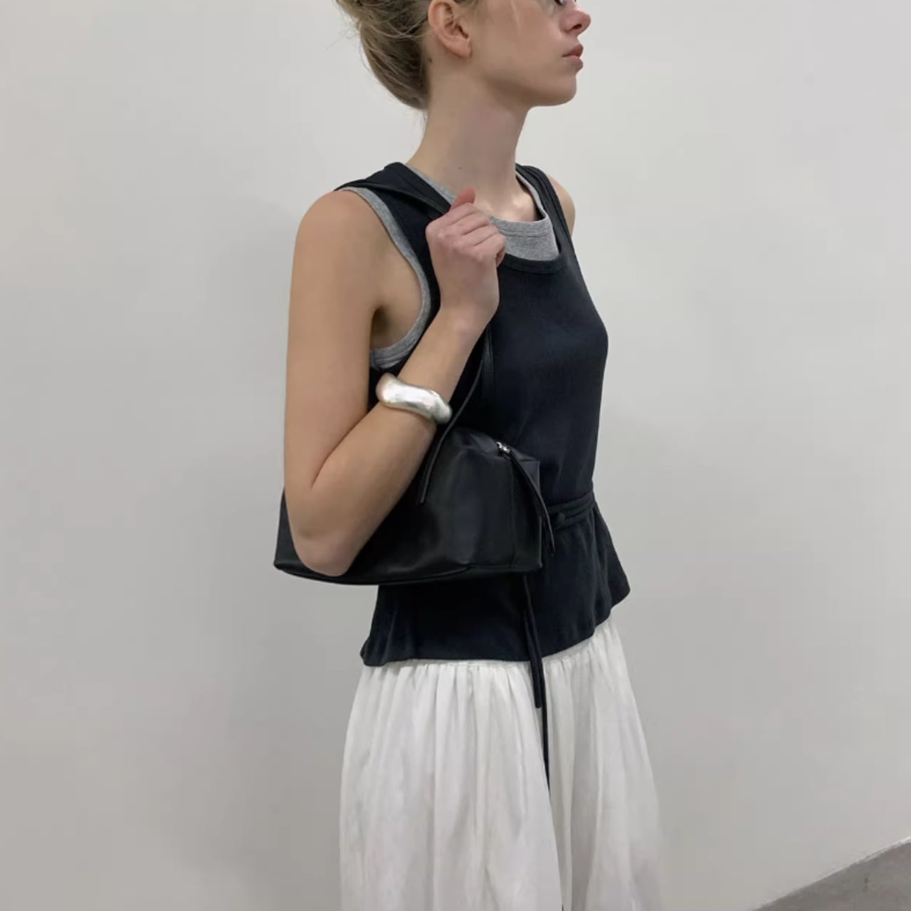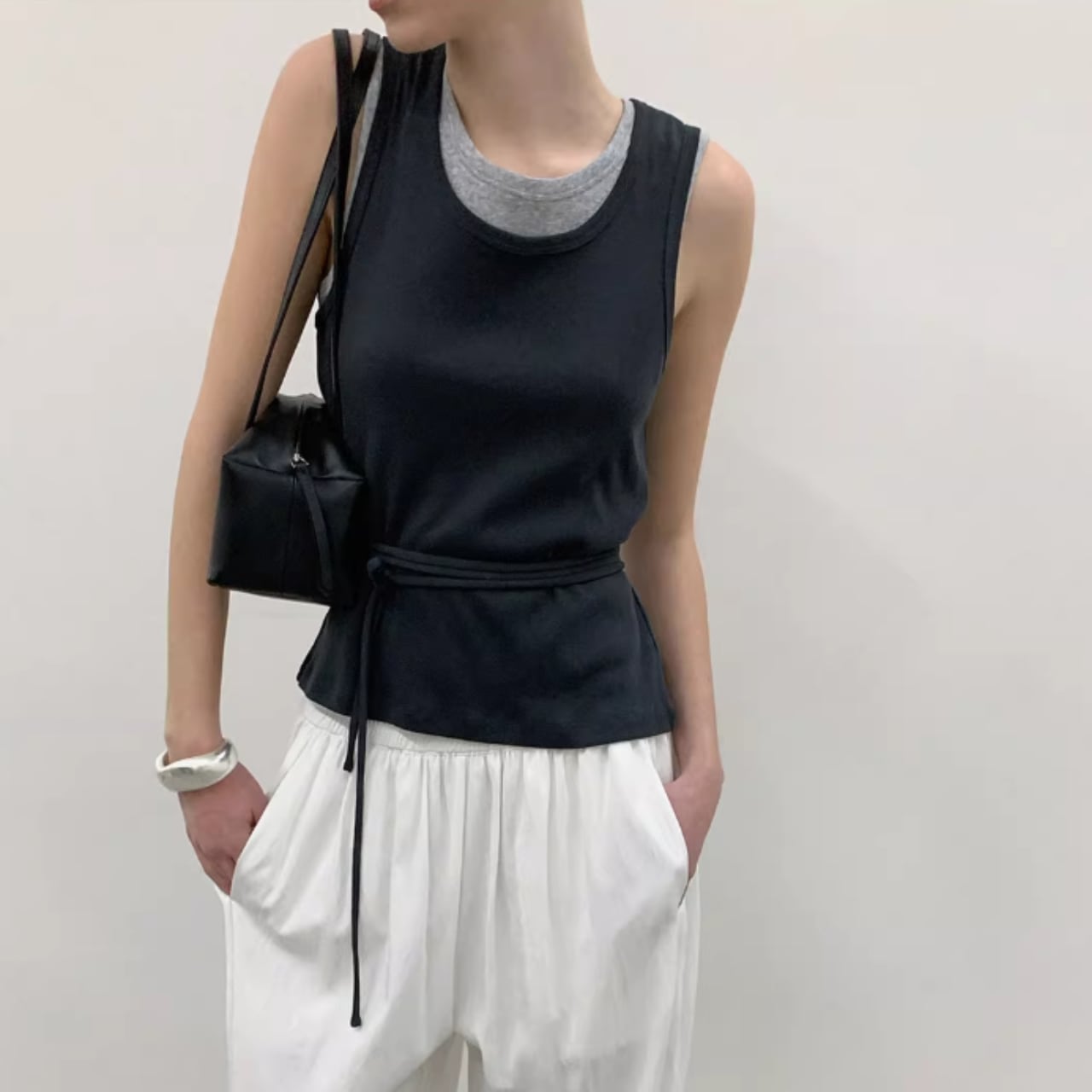 レイヤードデザインのノースリーブトップ。