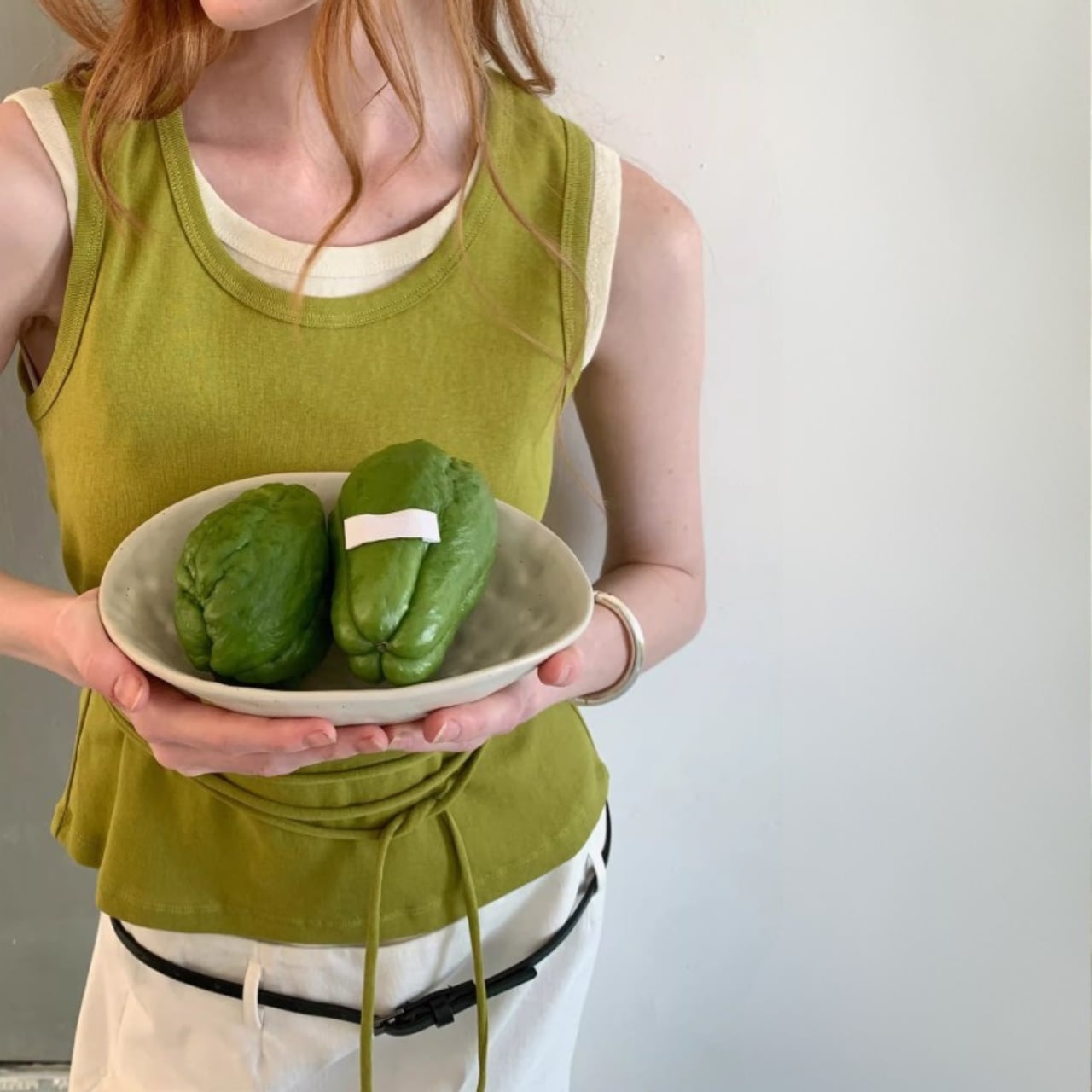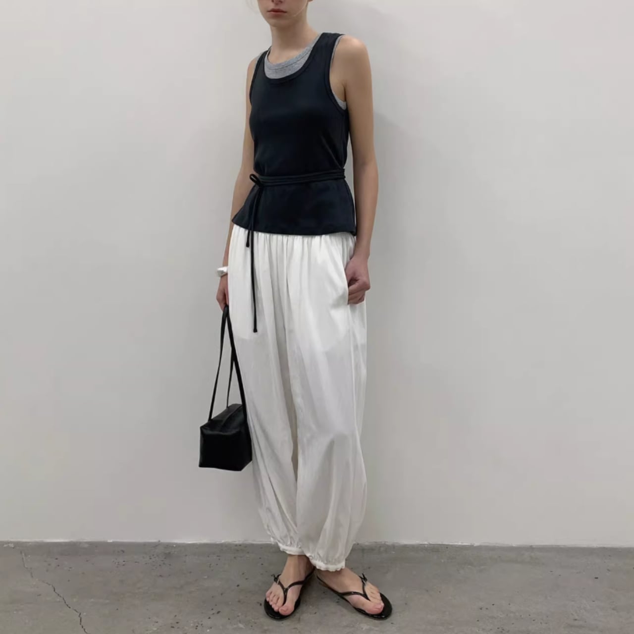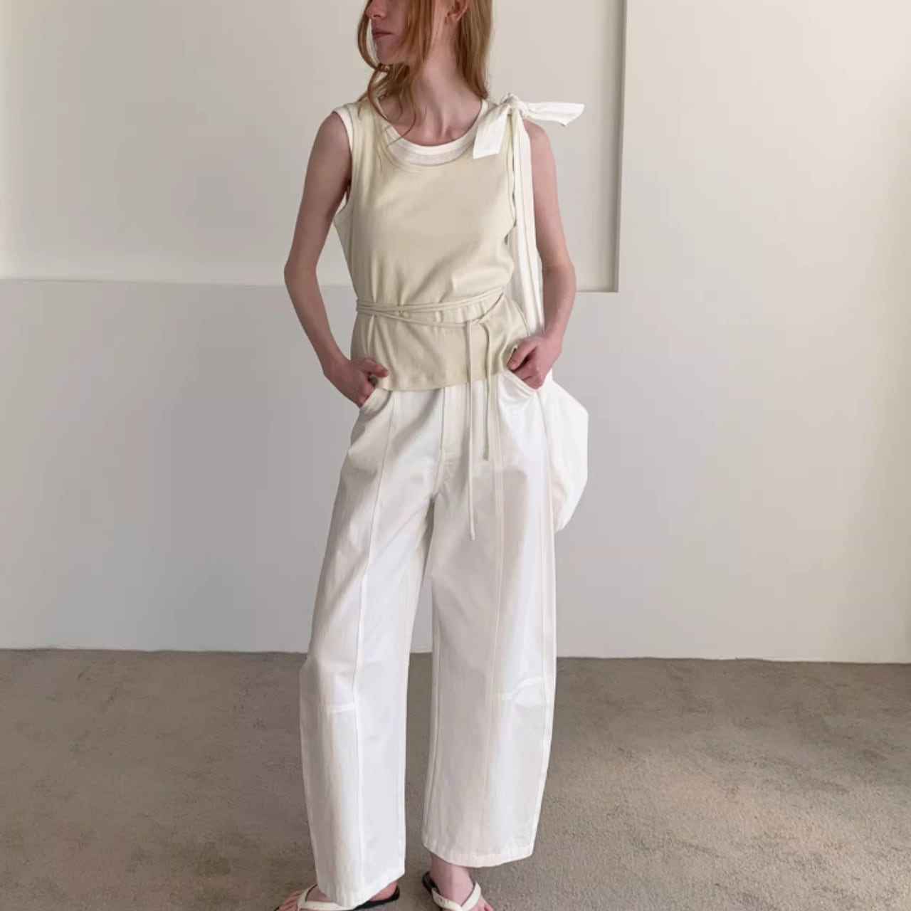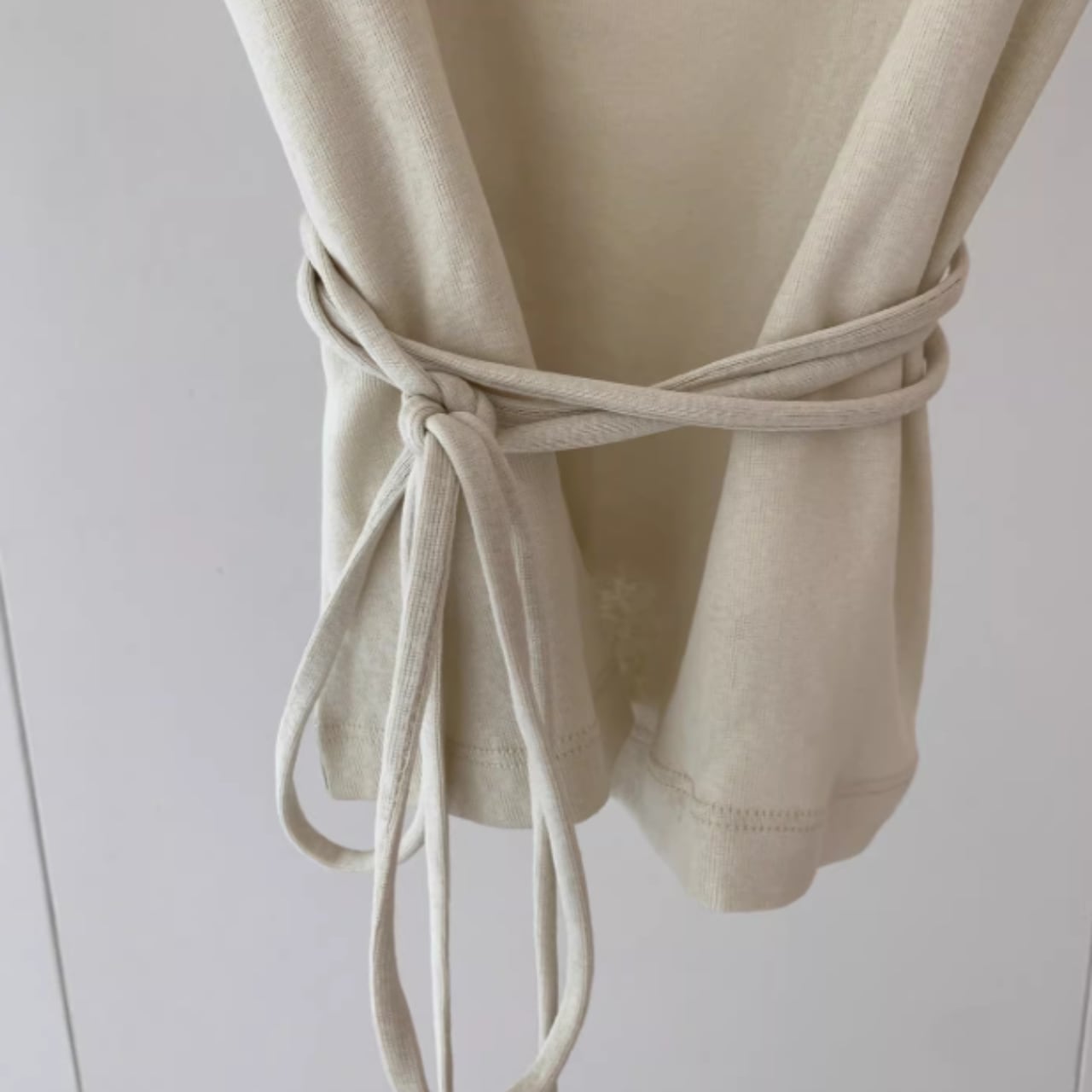 ウエストにはストリングデザインを取り入れ、結び方によってシルエットにさりげない変化をつけられる仕様。