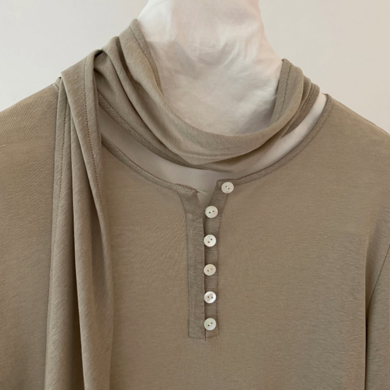 薄くやわらかな生地で仕立てたスカーフ付きのヘンリートップ。