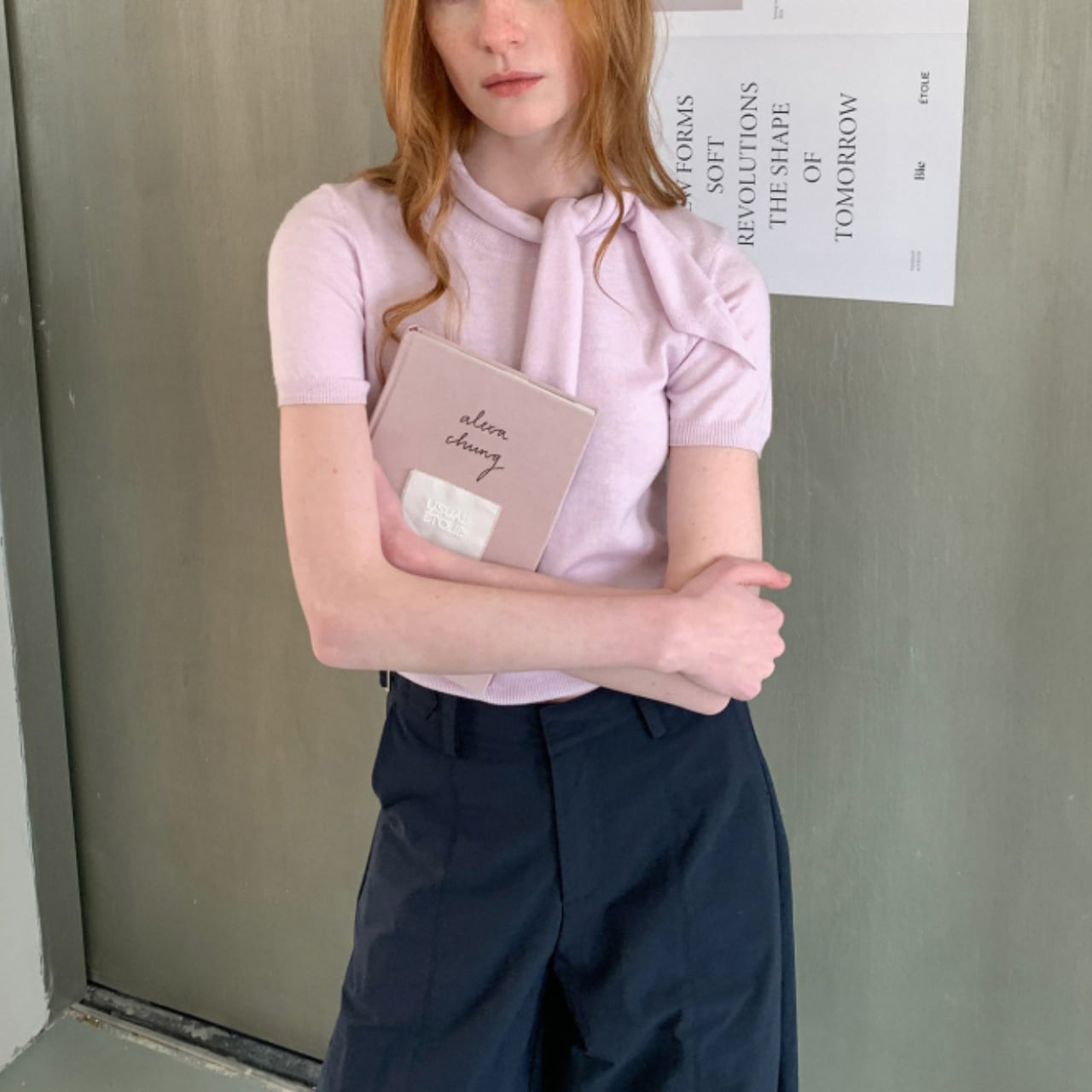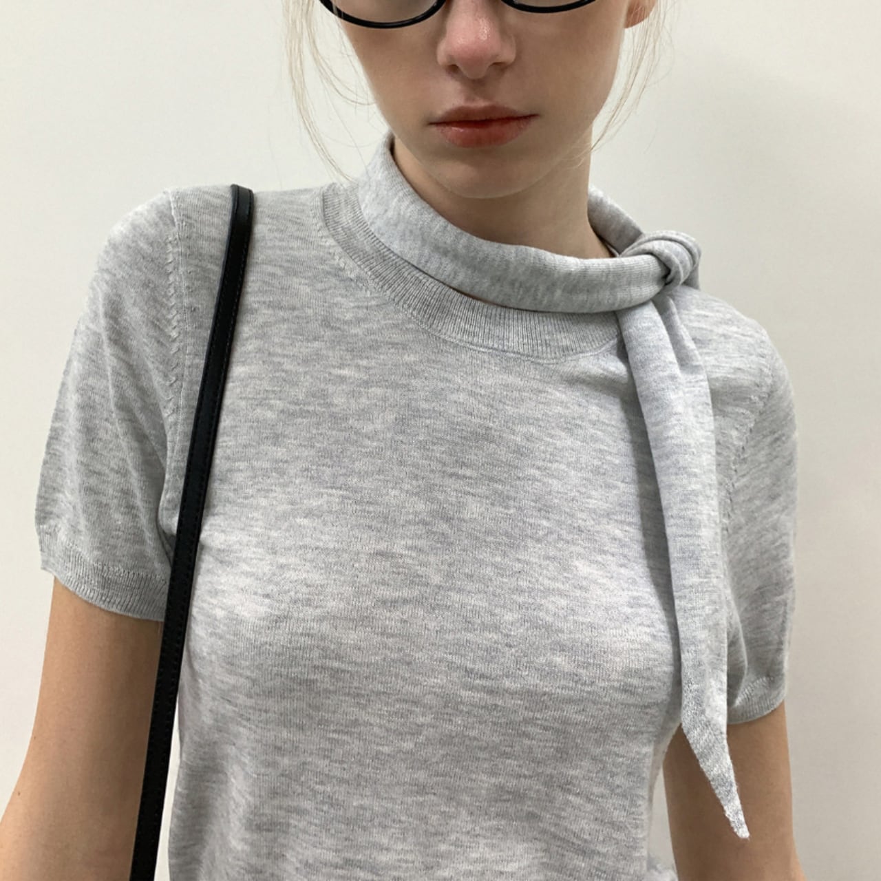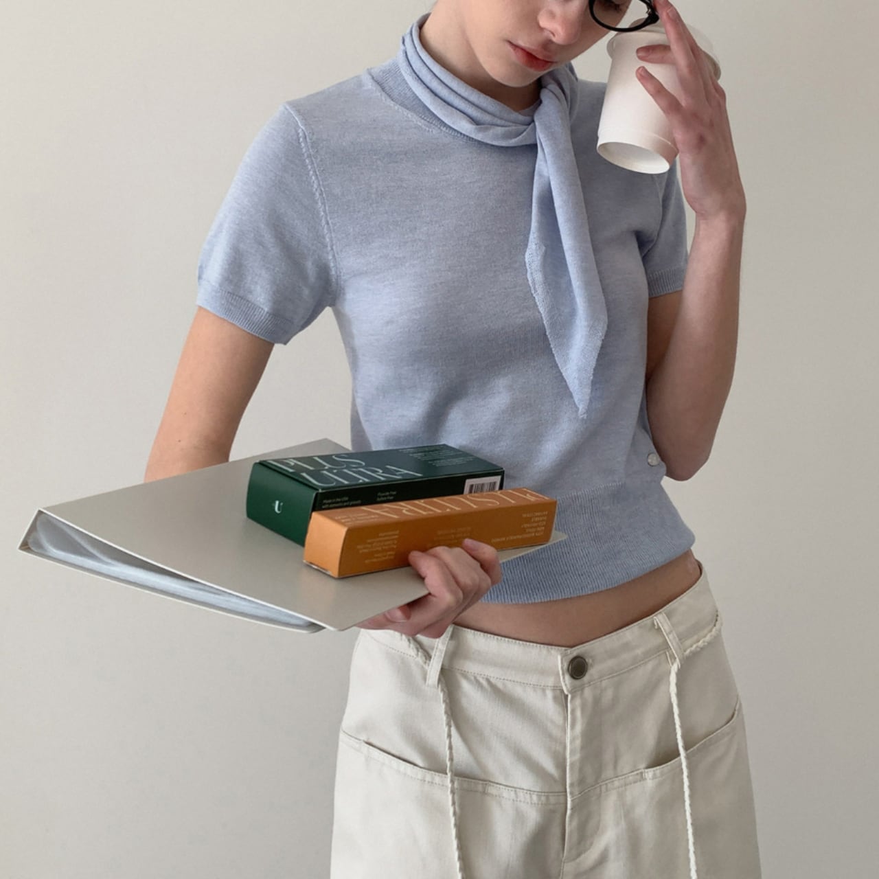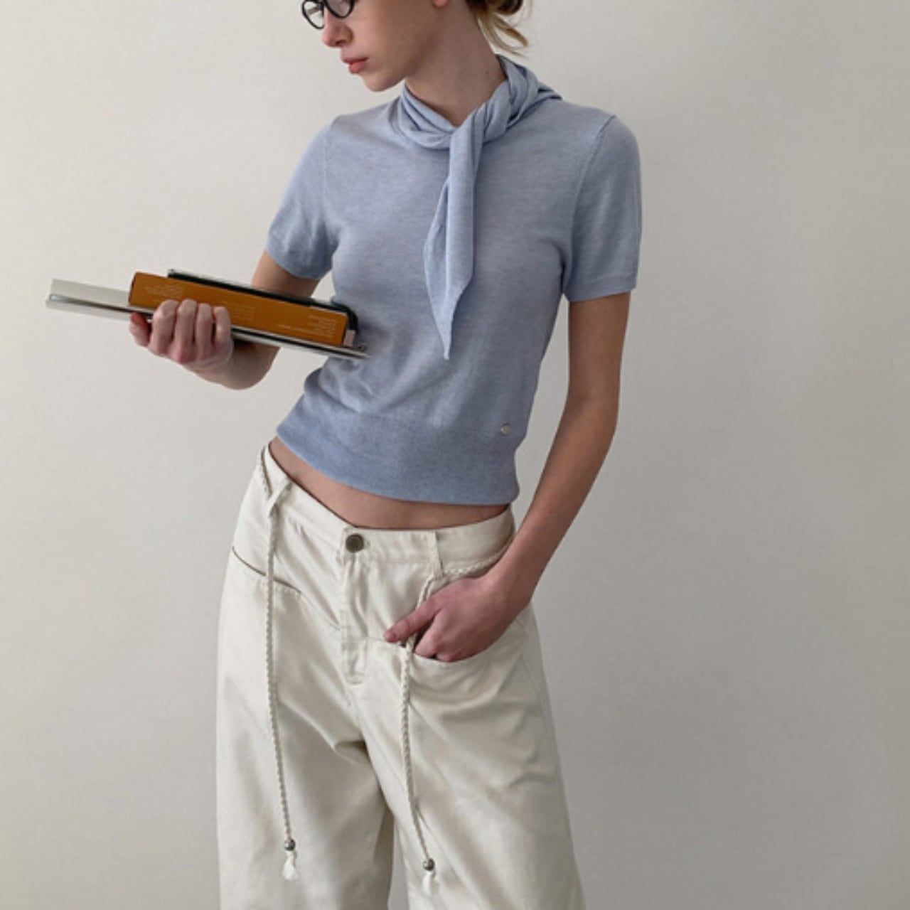 軽やかな薄手ニットに、首元から続くスカーフディテールを添えたコンパクトニット。