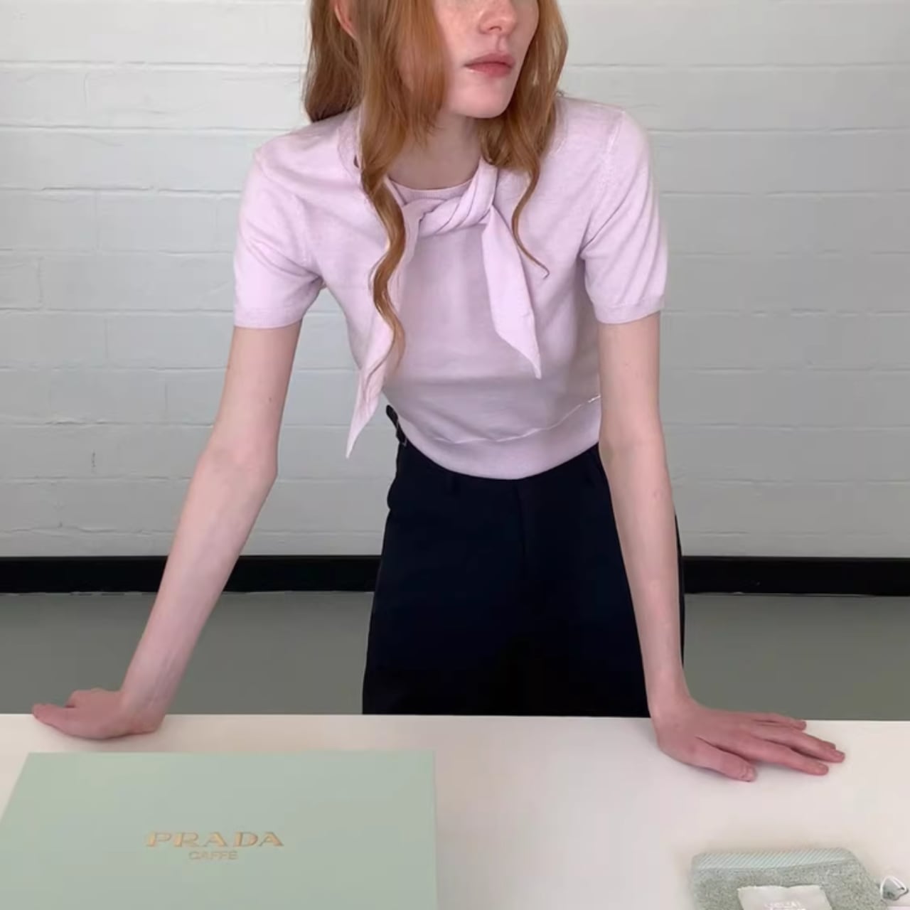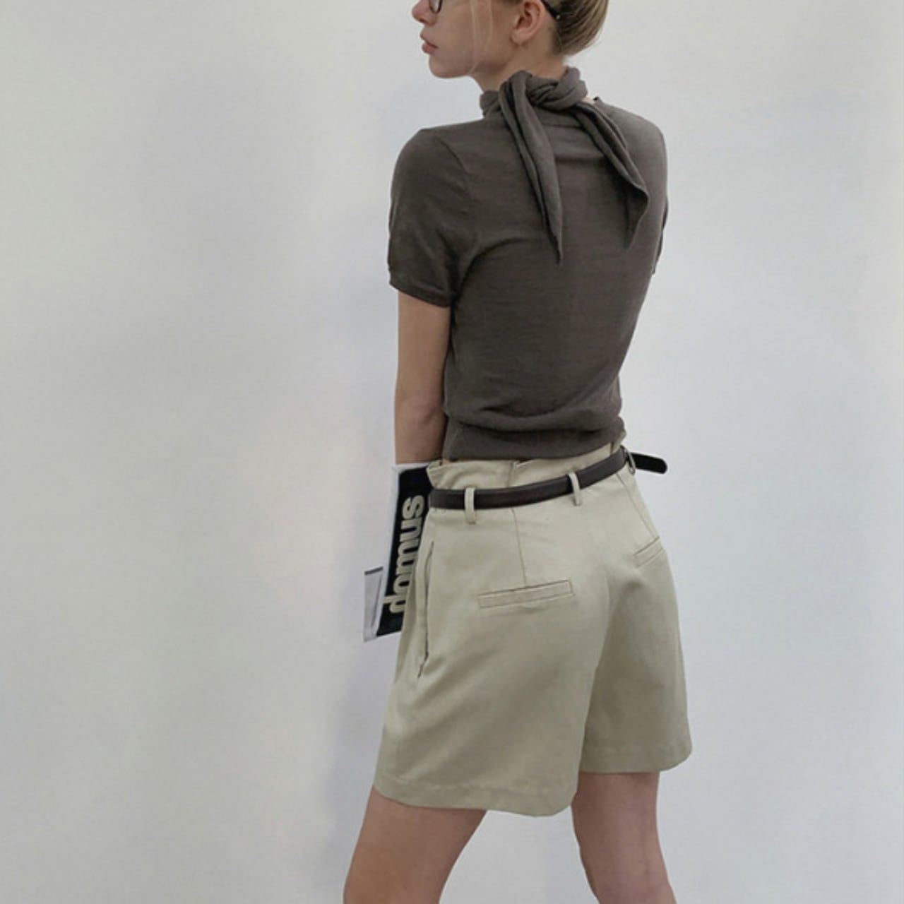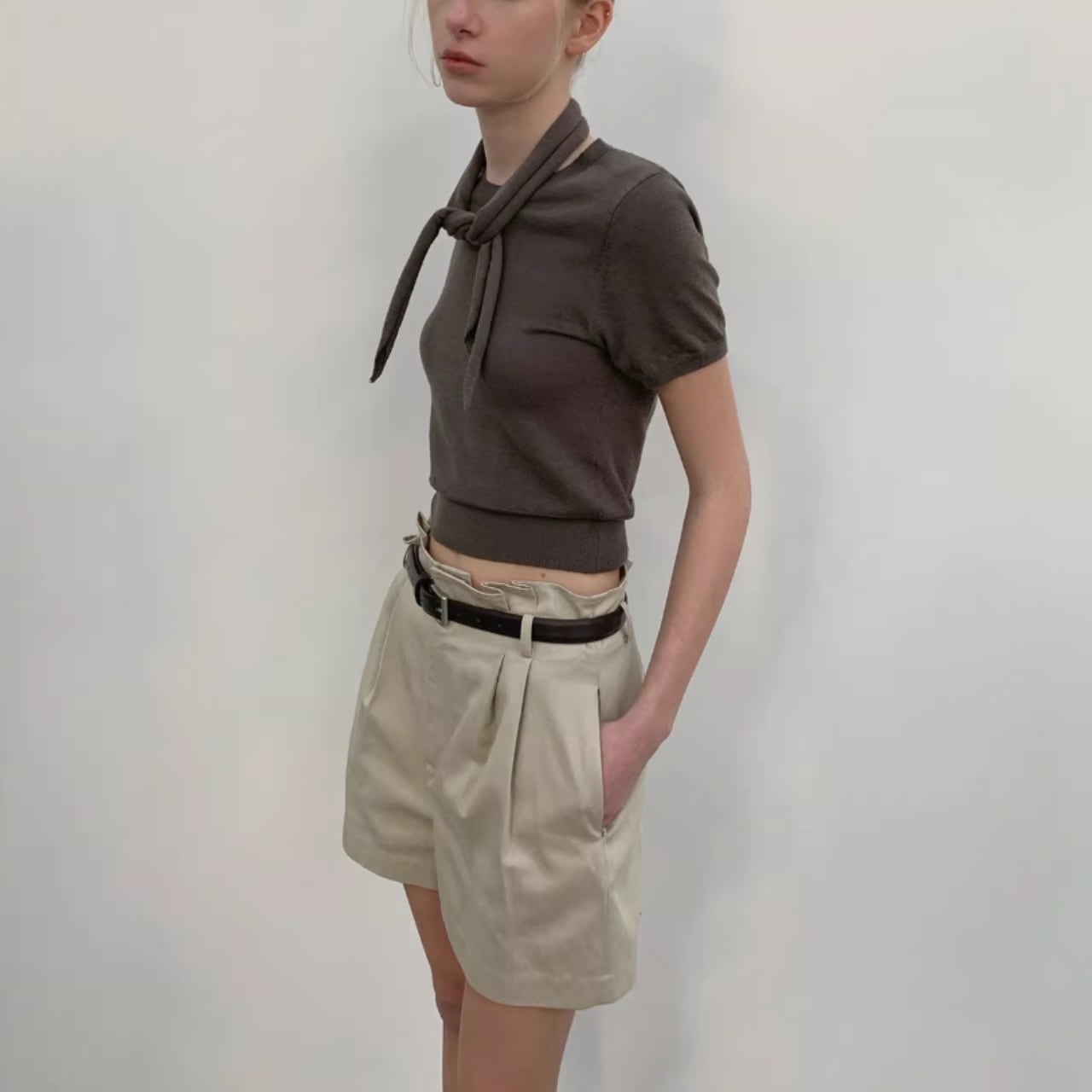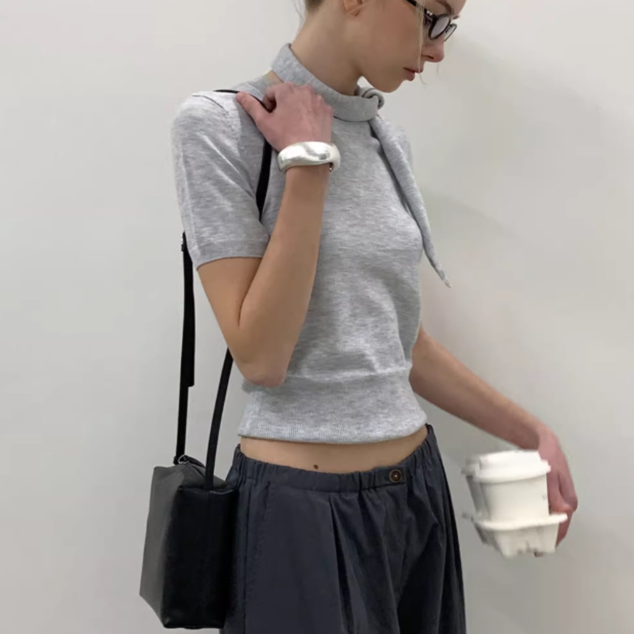 軽やかな薄手ニットに、首元から続くスカーフディテールを添えたコンパクトニット。