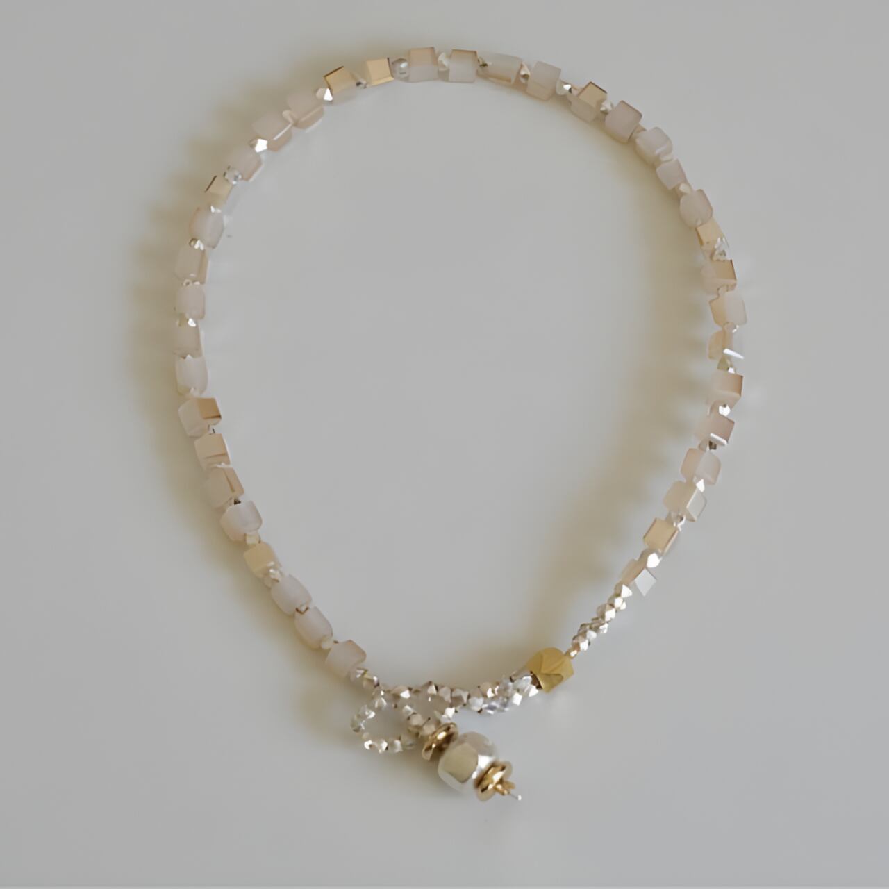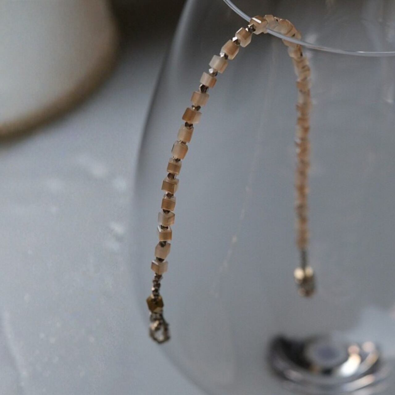 小さなキューブビーズが、光を受けてやわらかくきらめくブレスレット。