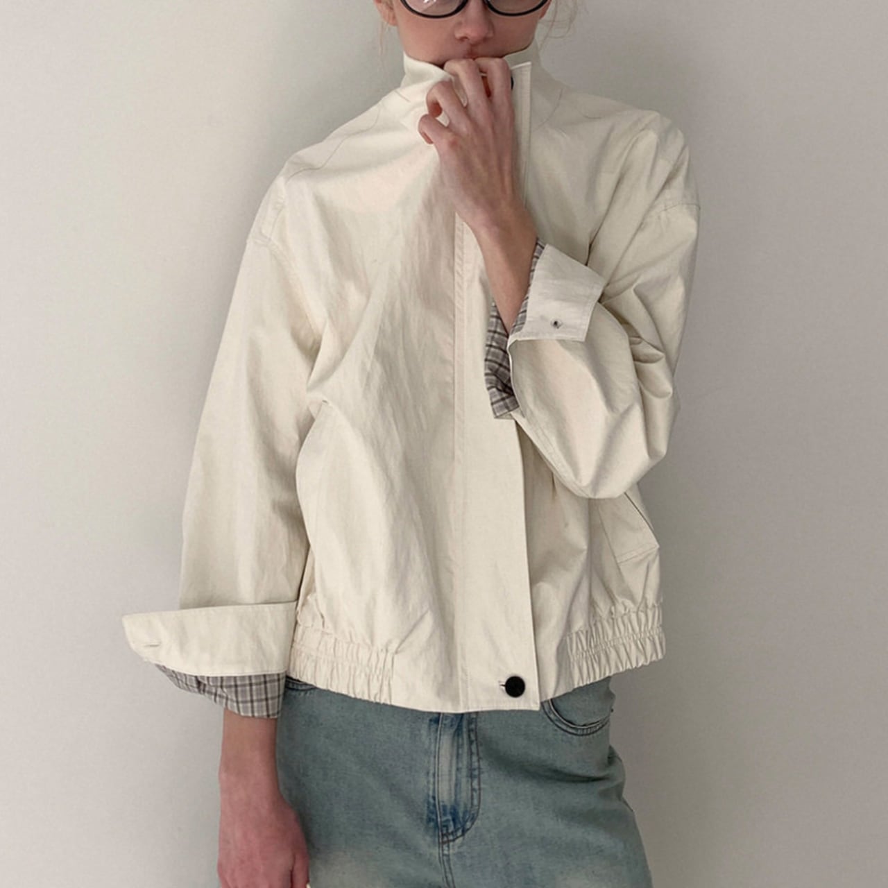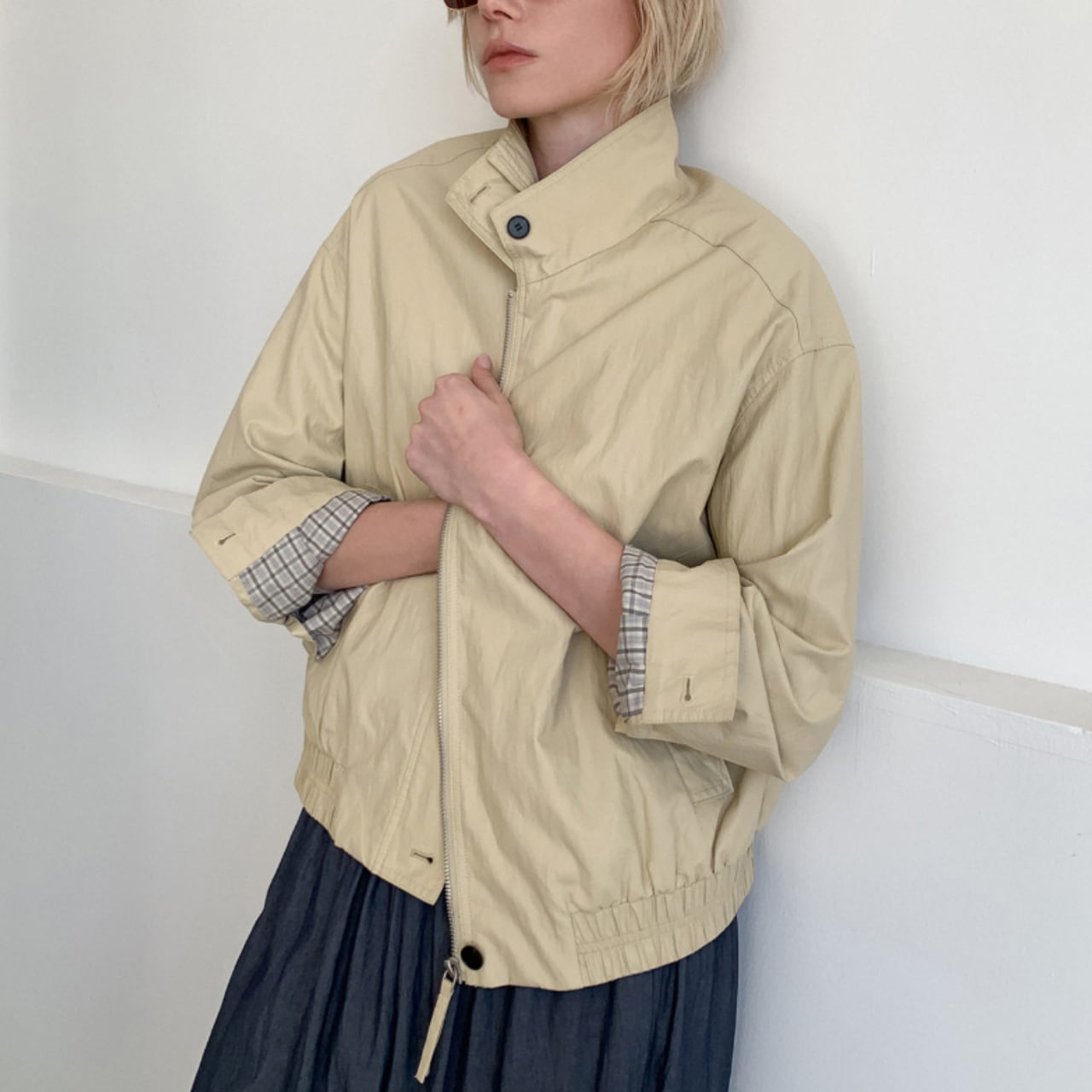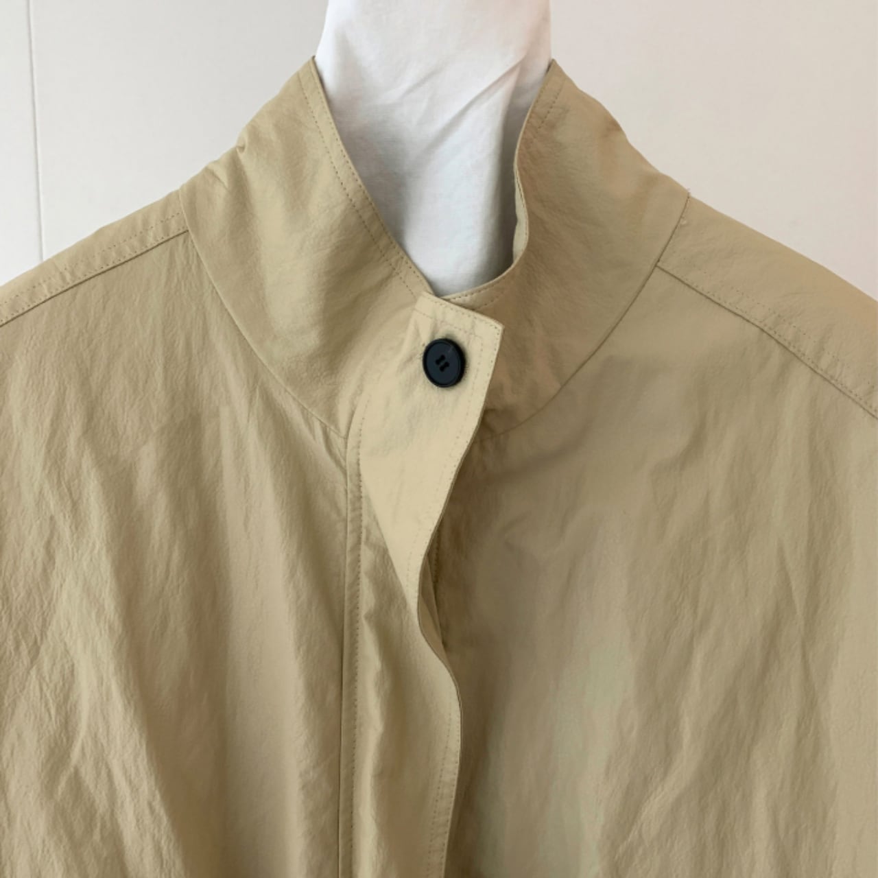 スタンドカラーで首元はすっきりと収まり、全体はゆとりを持たせたシルエット。